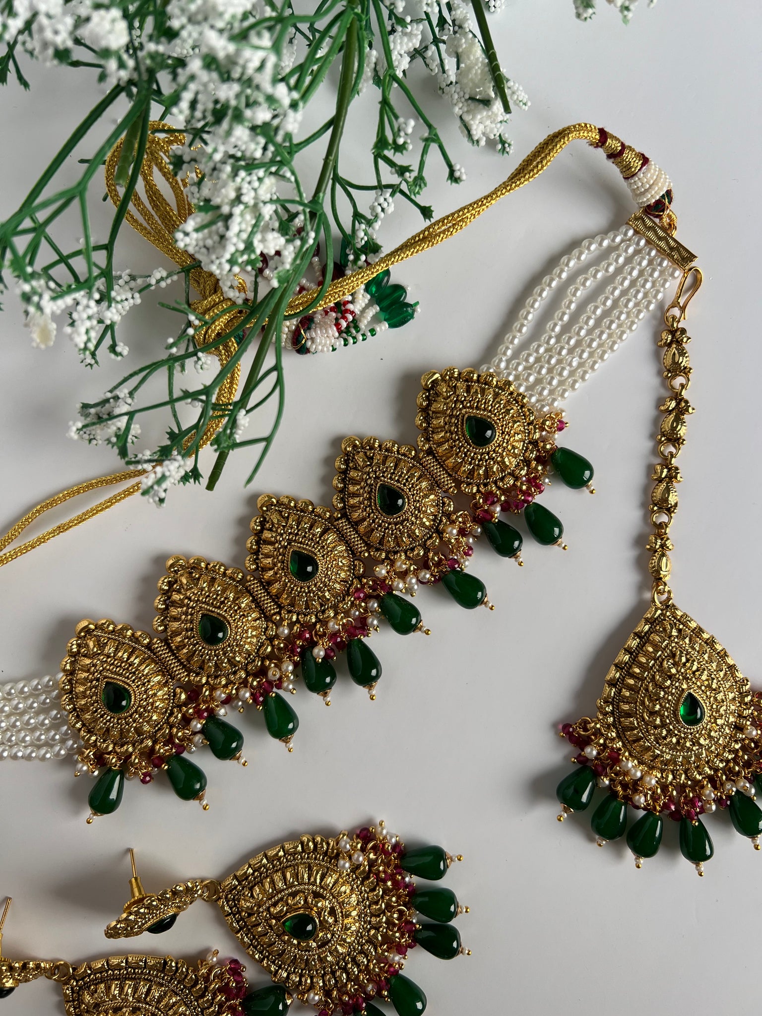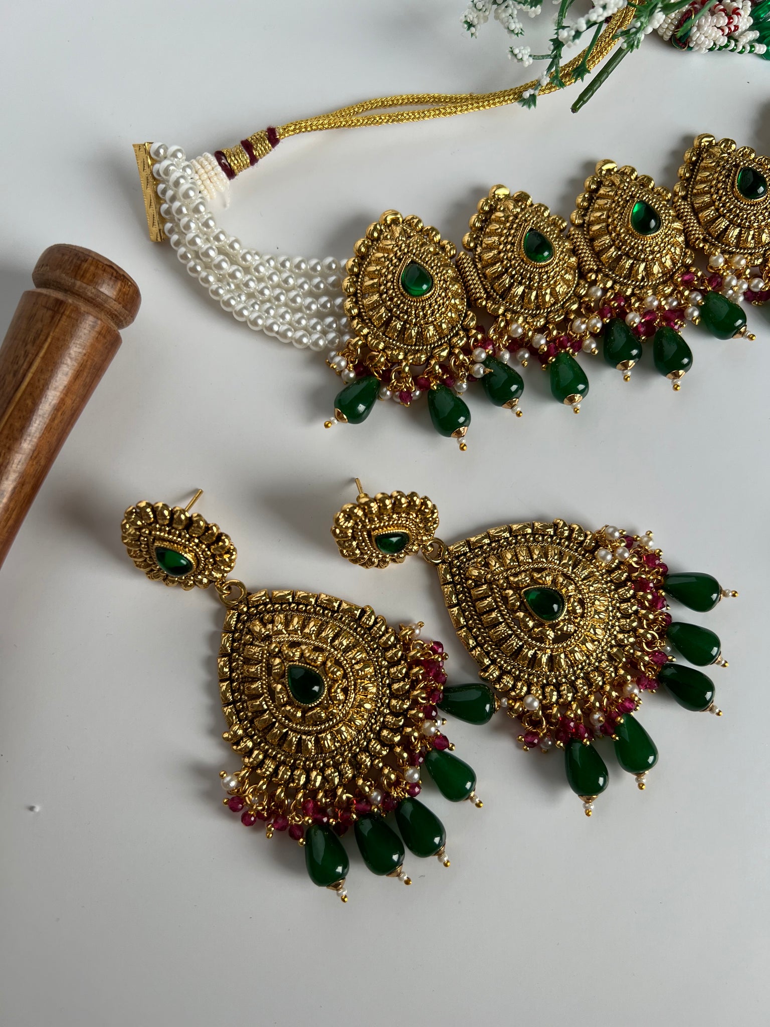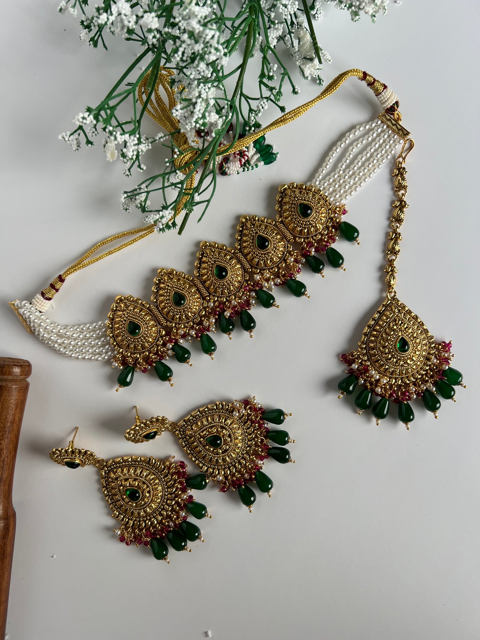 Antique gold and emerald green choker set with earring and tikka. Gold plated beauty