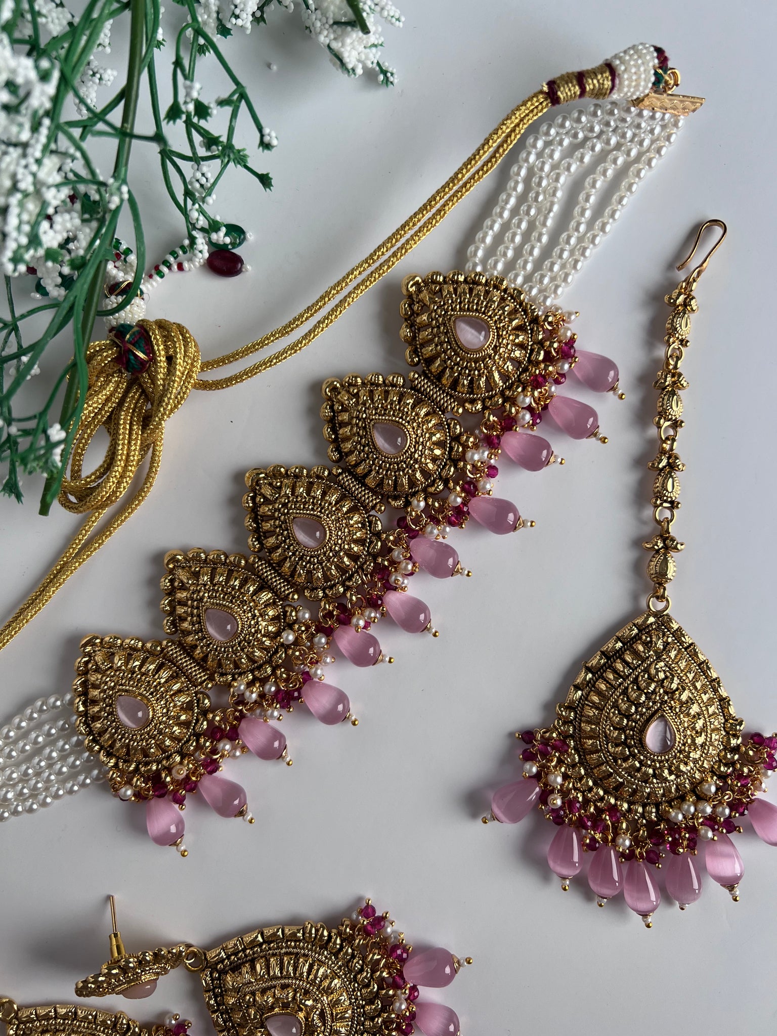 Antique gold and baby pink choker set with earring and tikka. Gold plated beauty