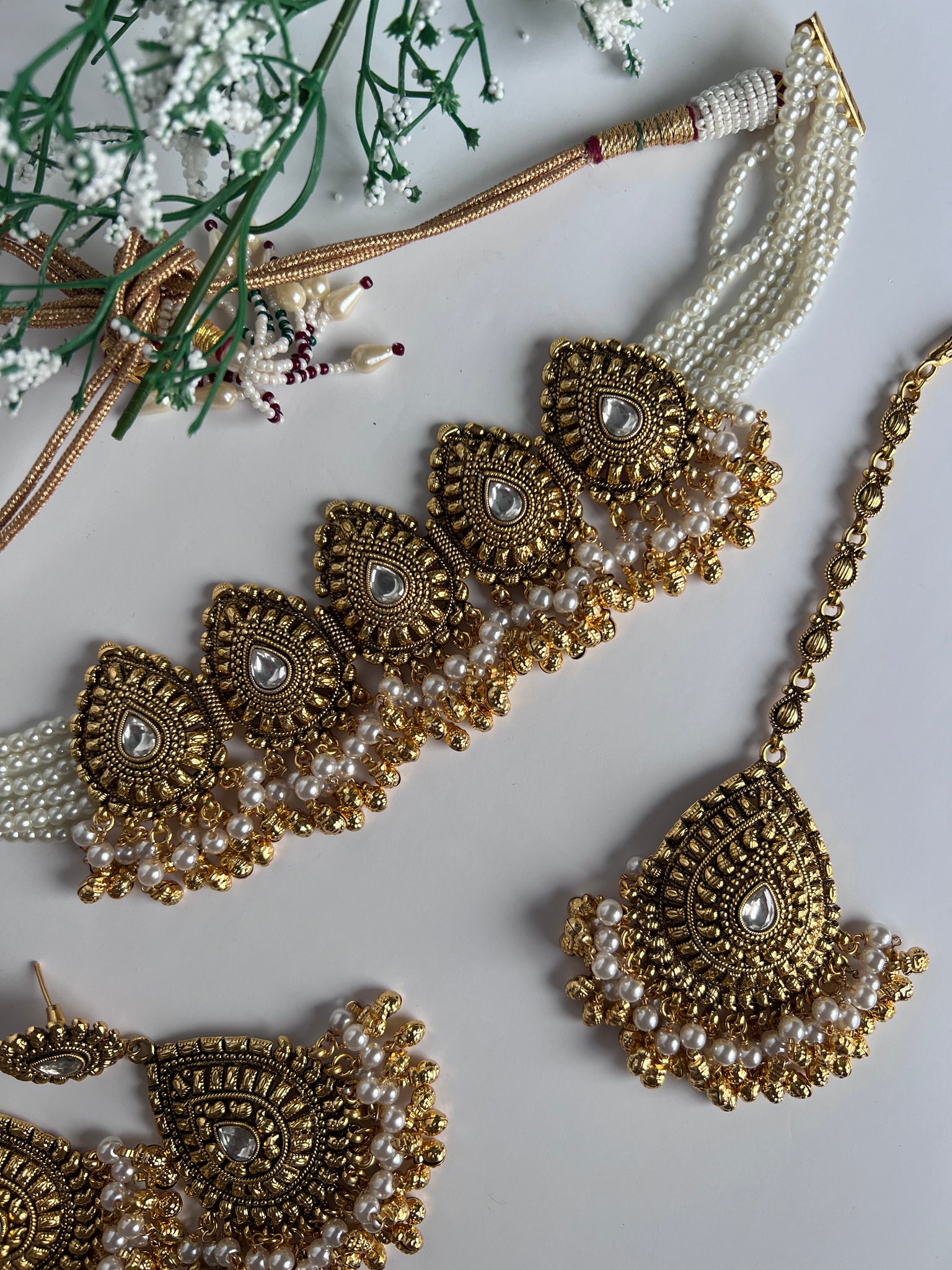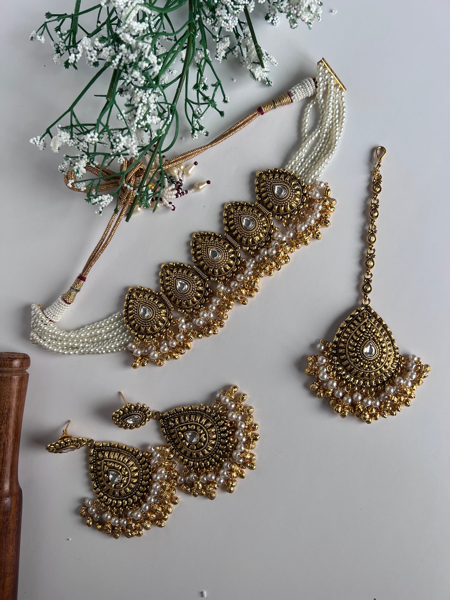 Antique gold choker set with earring and tikka. Gold plated beauty