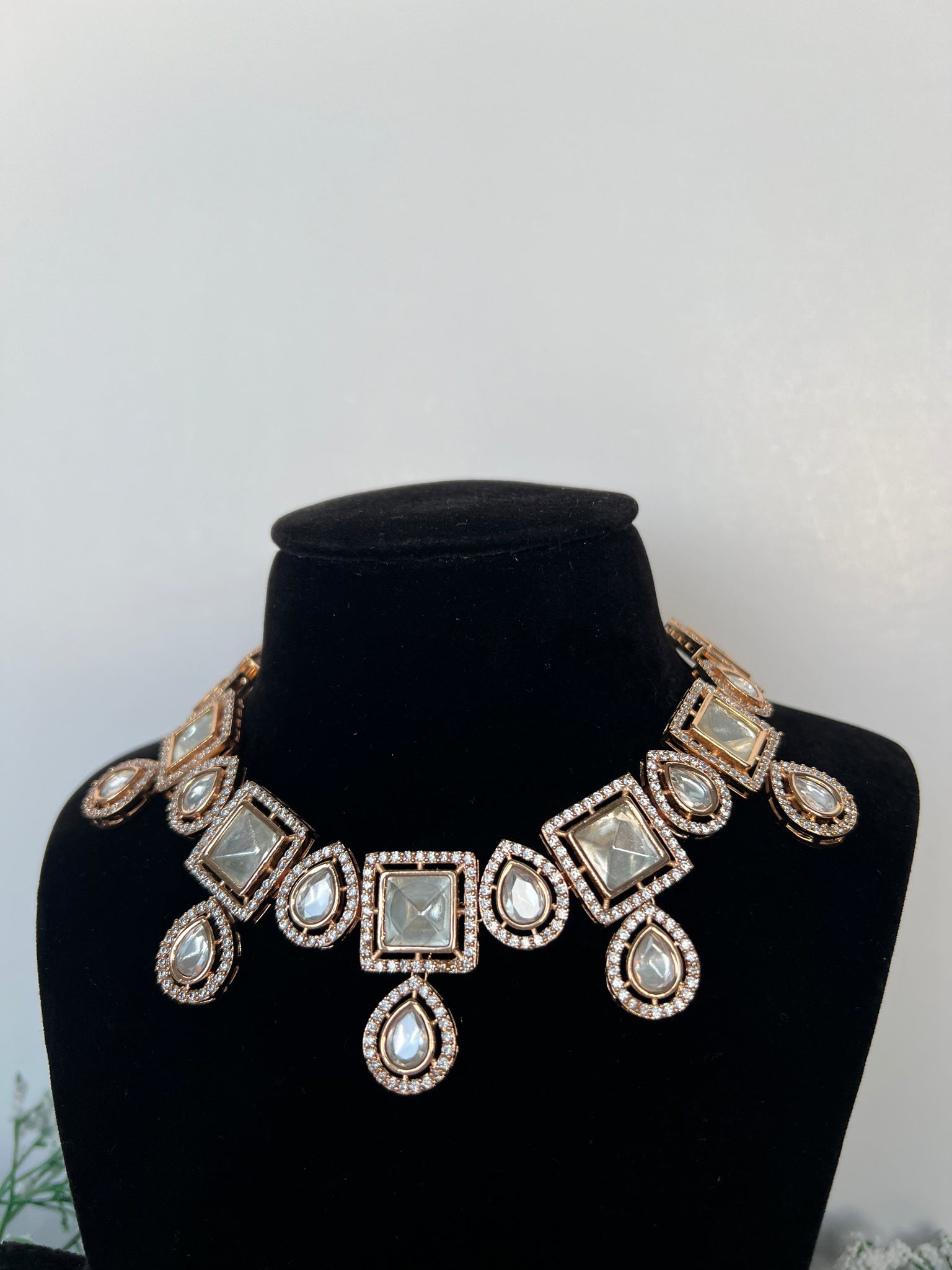 Beautiful uncut kundan set in a rose finish with stunning drop earrings