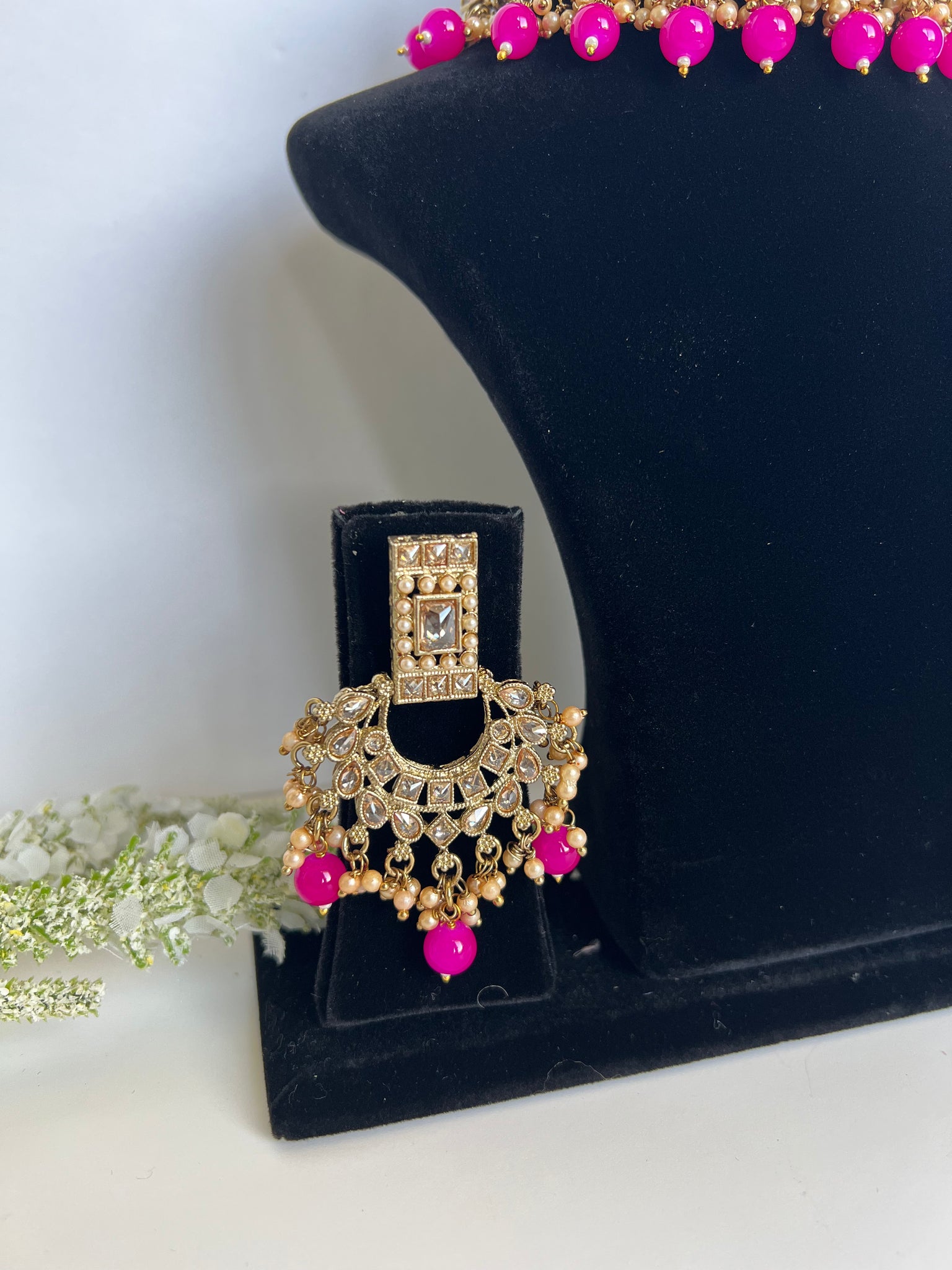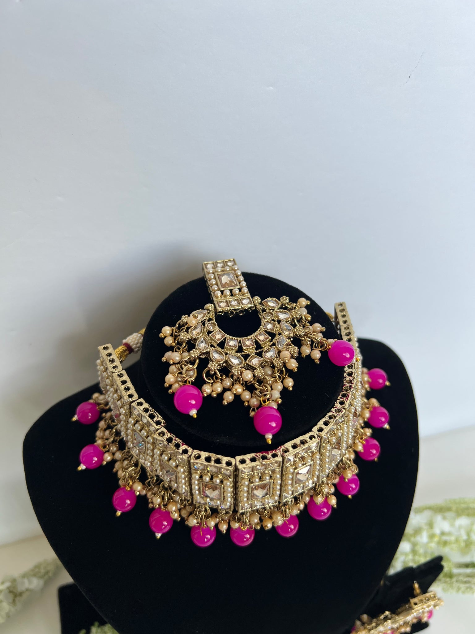 A beautiful elegant antique gold choker set, flexible and will perfectly hug your neck. Comes with beautiful lightweight earrings and tikka to match.