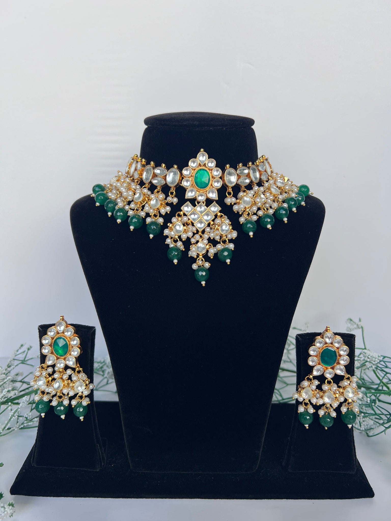 22K gold plated Pachi kundan set in dark green