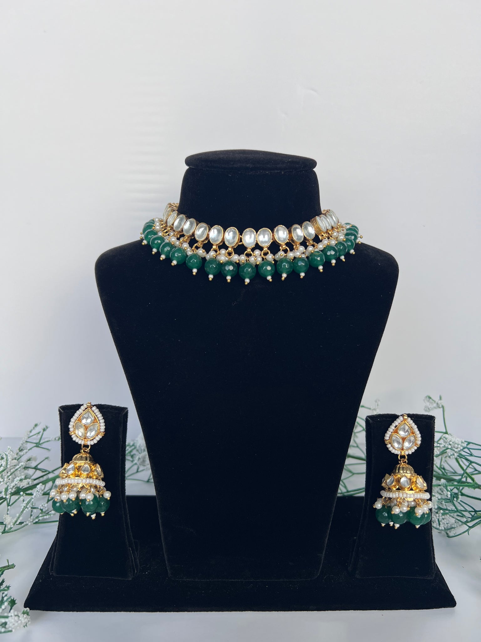 Stunning green Pachi kundan 22k gold plated necklace set with lightweight jhumki earrings