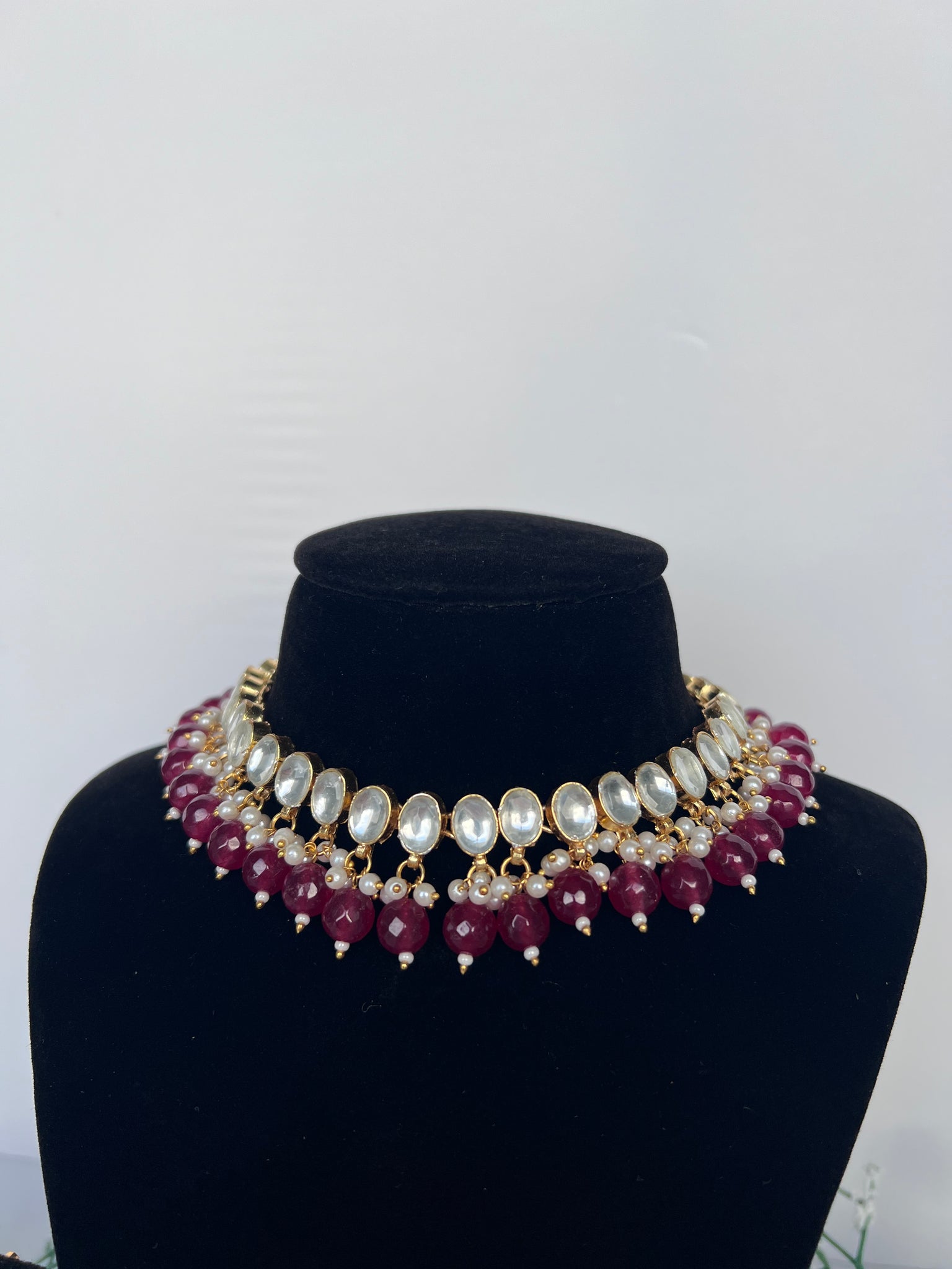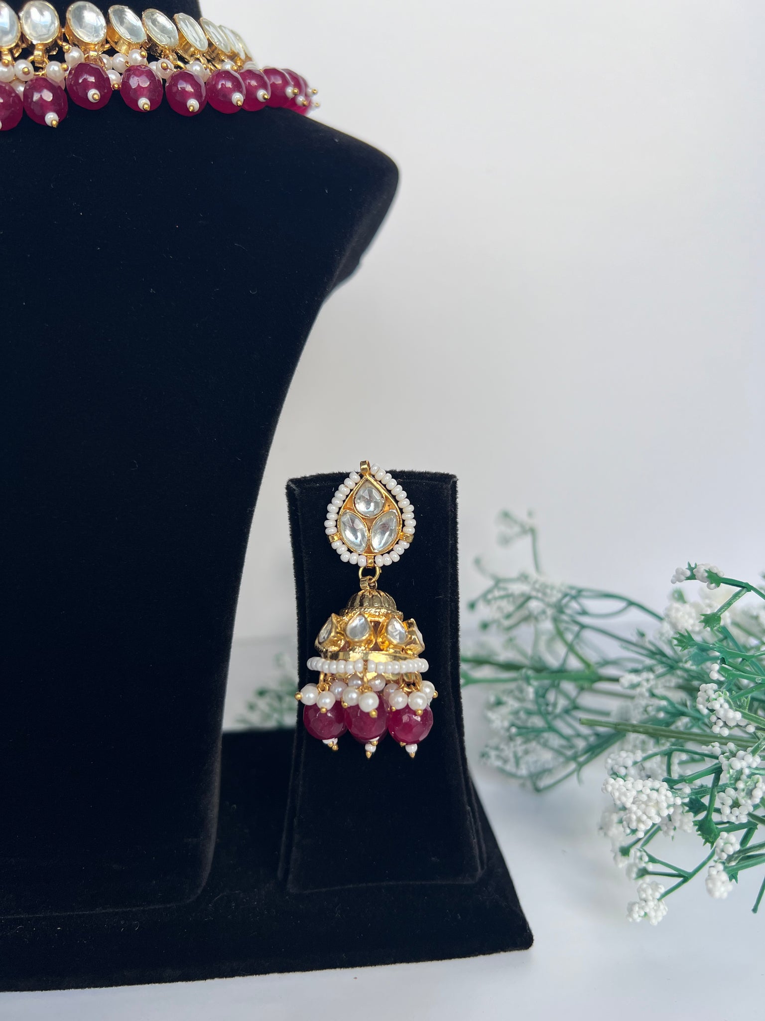 Stunning maroon Pachi kundan 22k gold plated necklace set with lightweight jhumki earrings