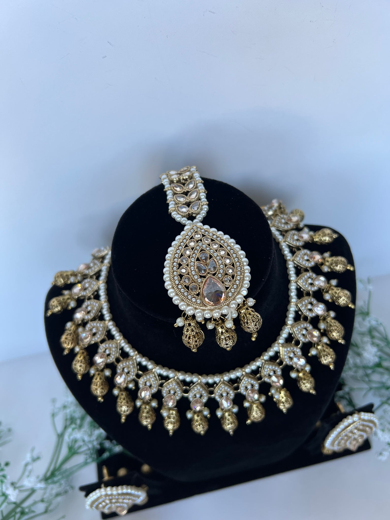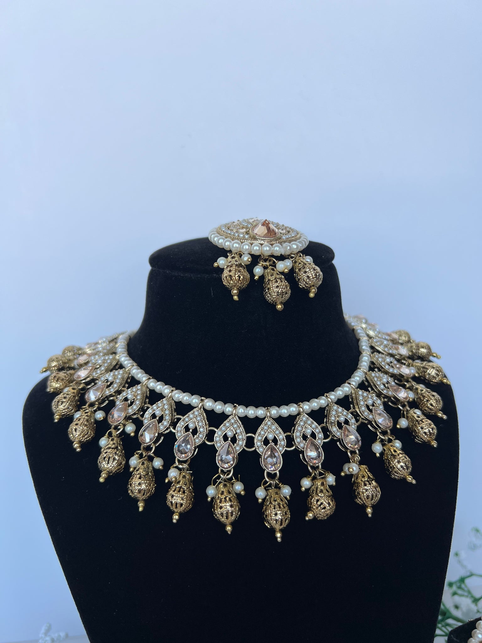 Antique gold with copper pearls, comes with studs and tikka