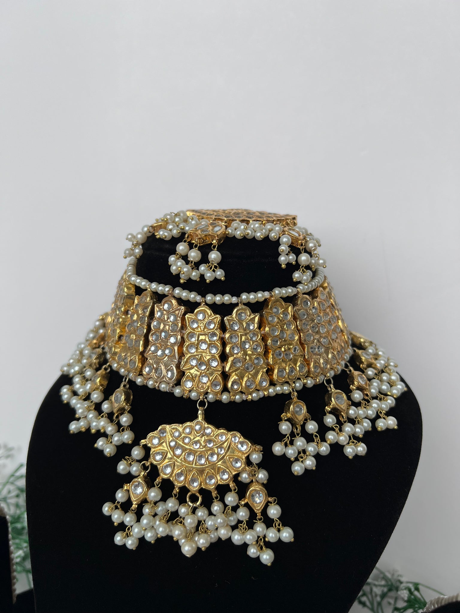A stunning Pakistani thappa kundan set can be worn as a necklace or choker. Comes with jhumki earrings and tikka. 22K gold plated