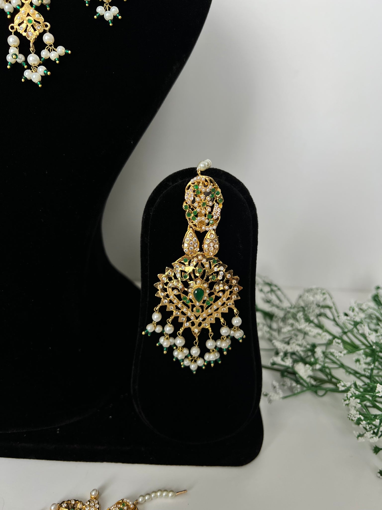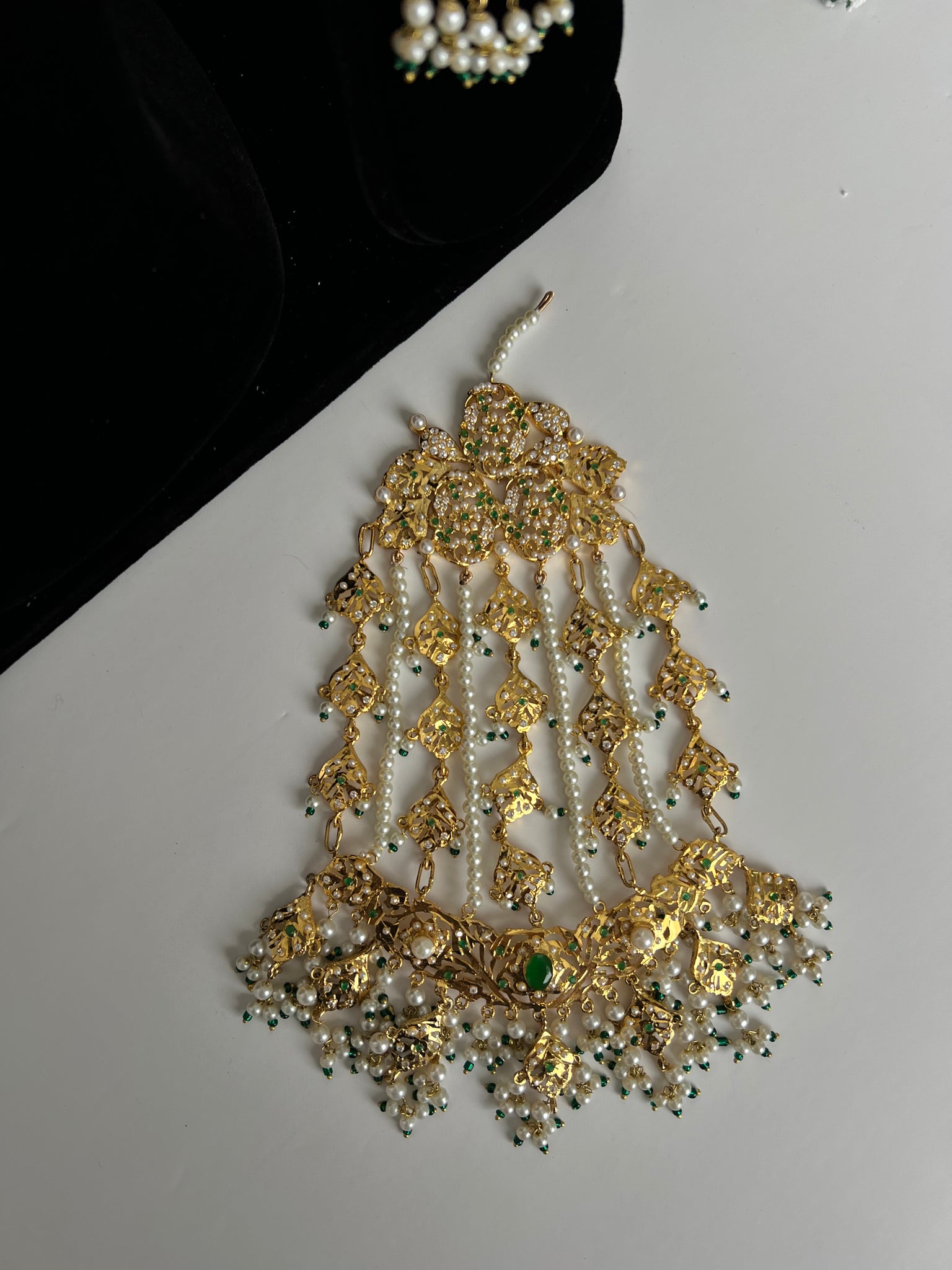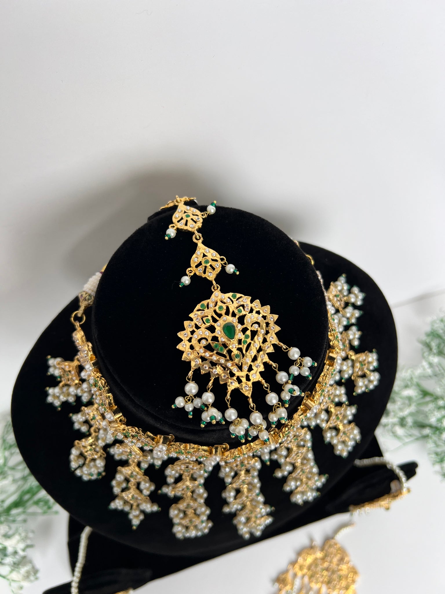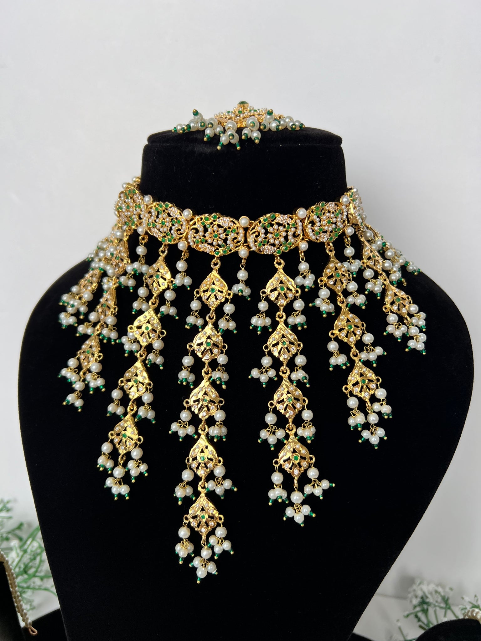 Pakistani original jardau gold plated in 22K gold, comes with a flexible choker, earrings, tikka and Jhoomer