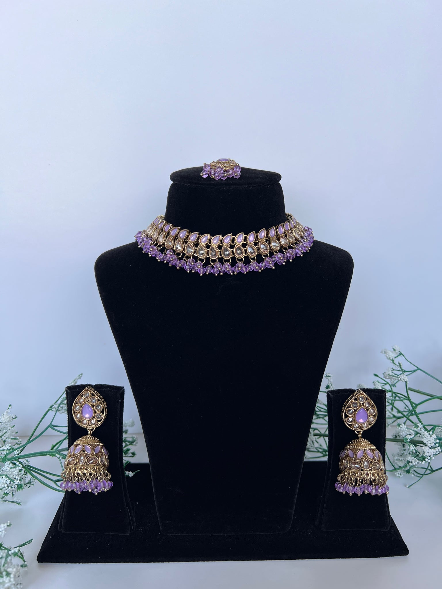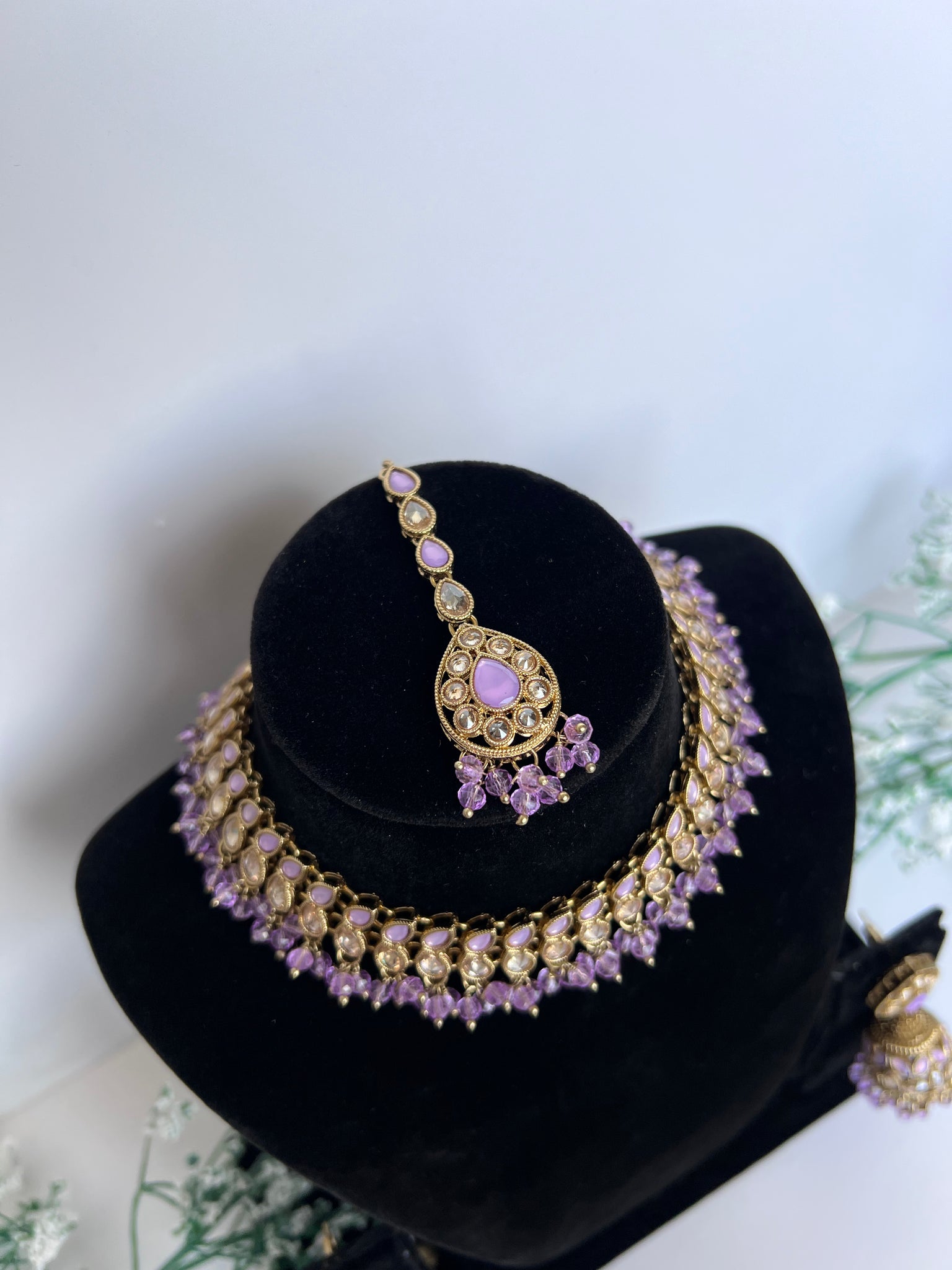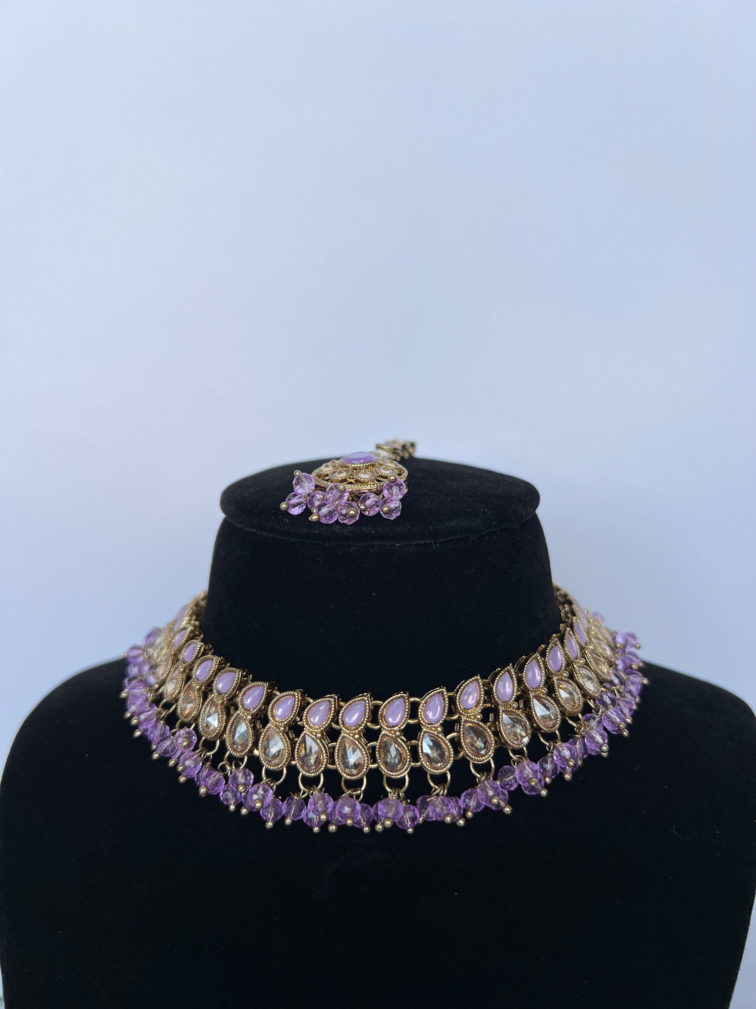 Medium heavy necklace set with jhumki in tikka in lilac purple