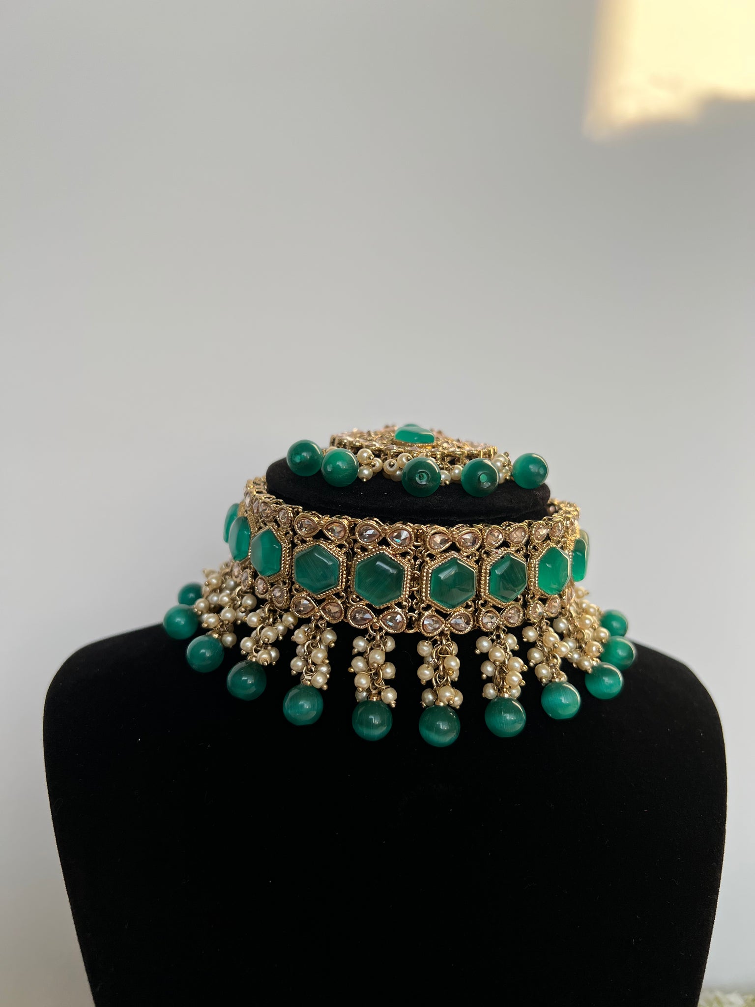 A stunning peacock green choker with stunning earrings and tikka