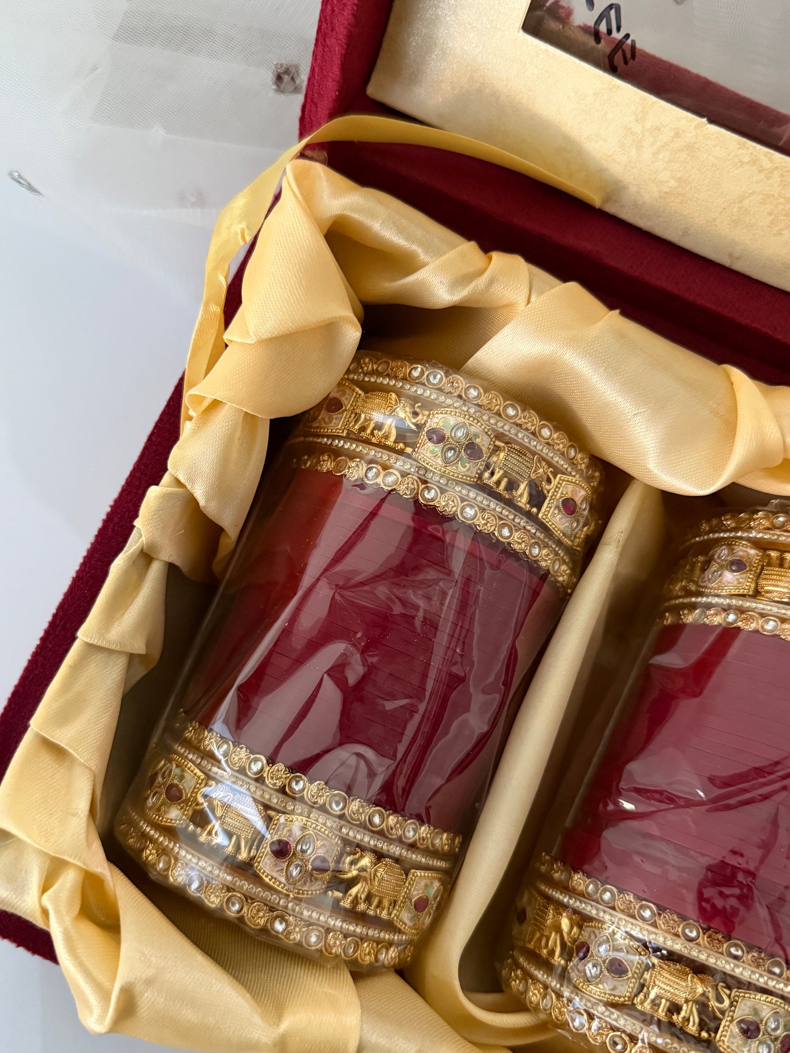 Gorgeous cherry maroon meenakari kundan choirs with elephant motifs, gold plated karre