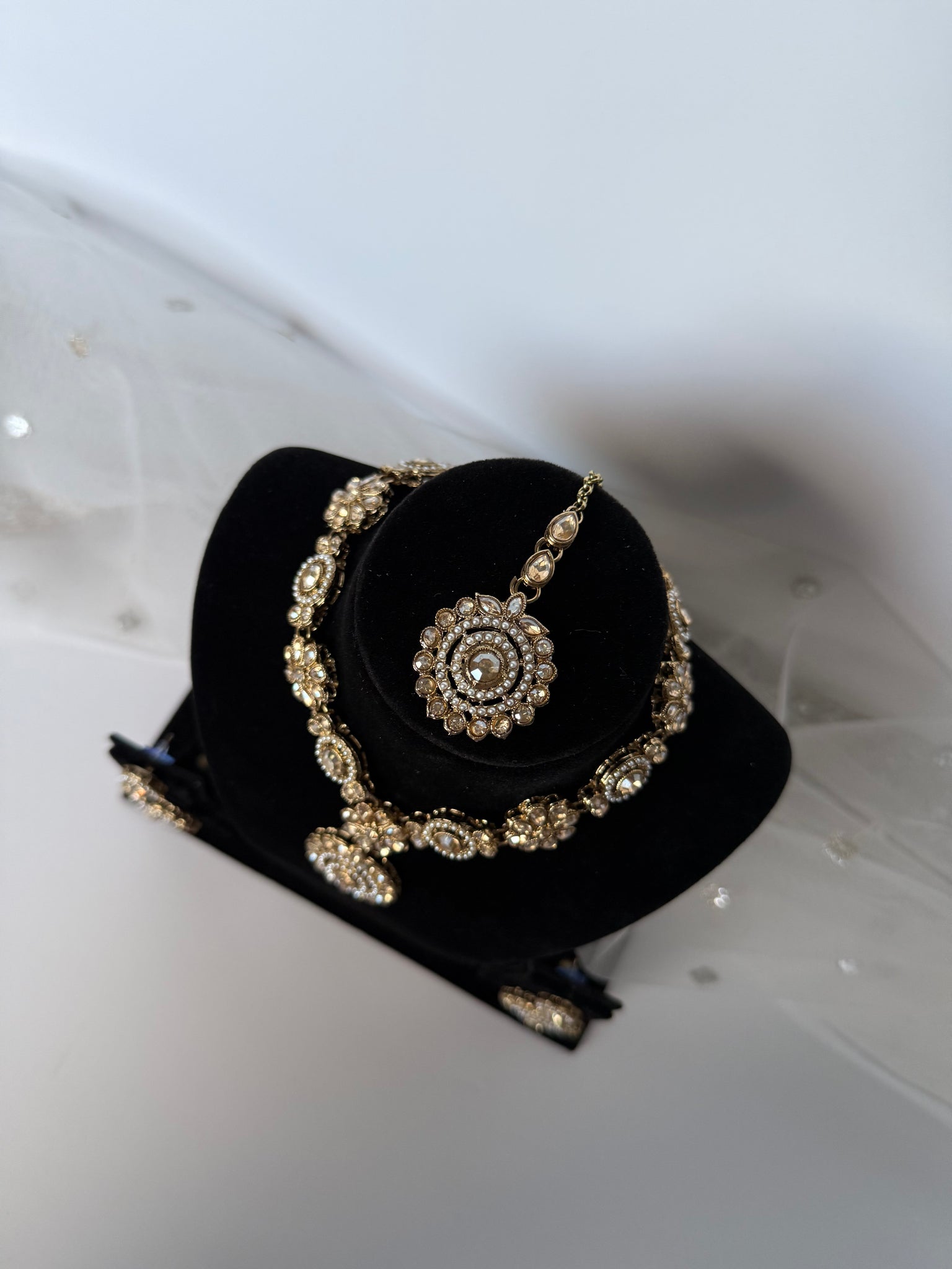 Gorgeous drop pendant necklace set with earrings and tikka in a champagne gold