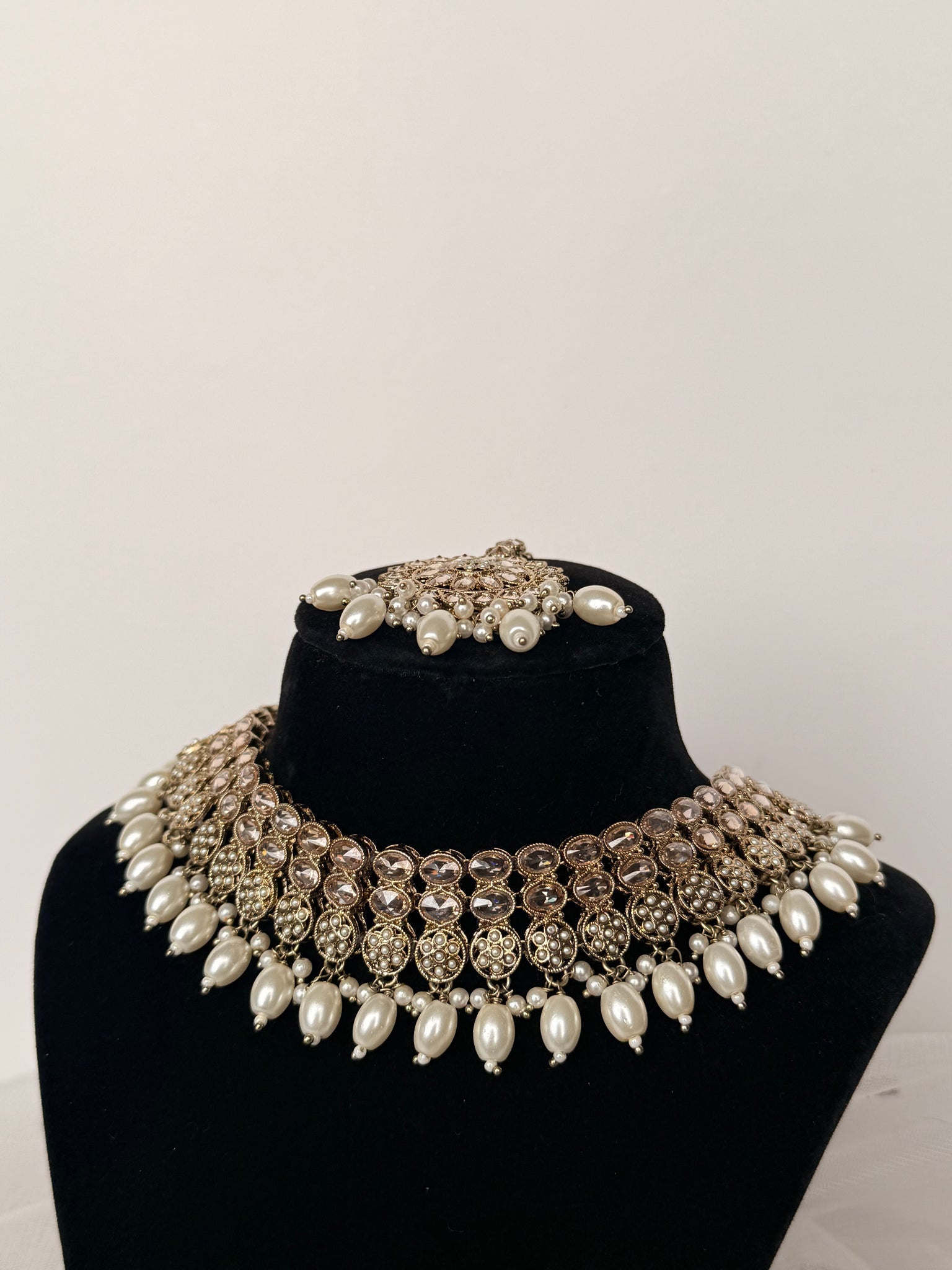 Beautiful golden polki necklace set with off white pearl details, comes with jhumki earrings and tikka