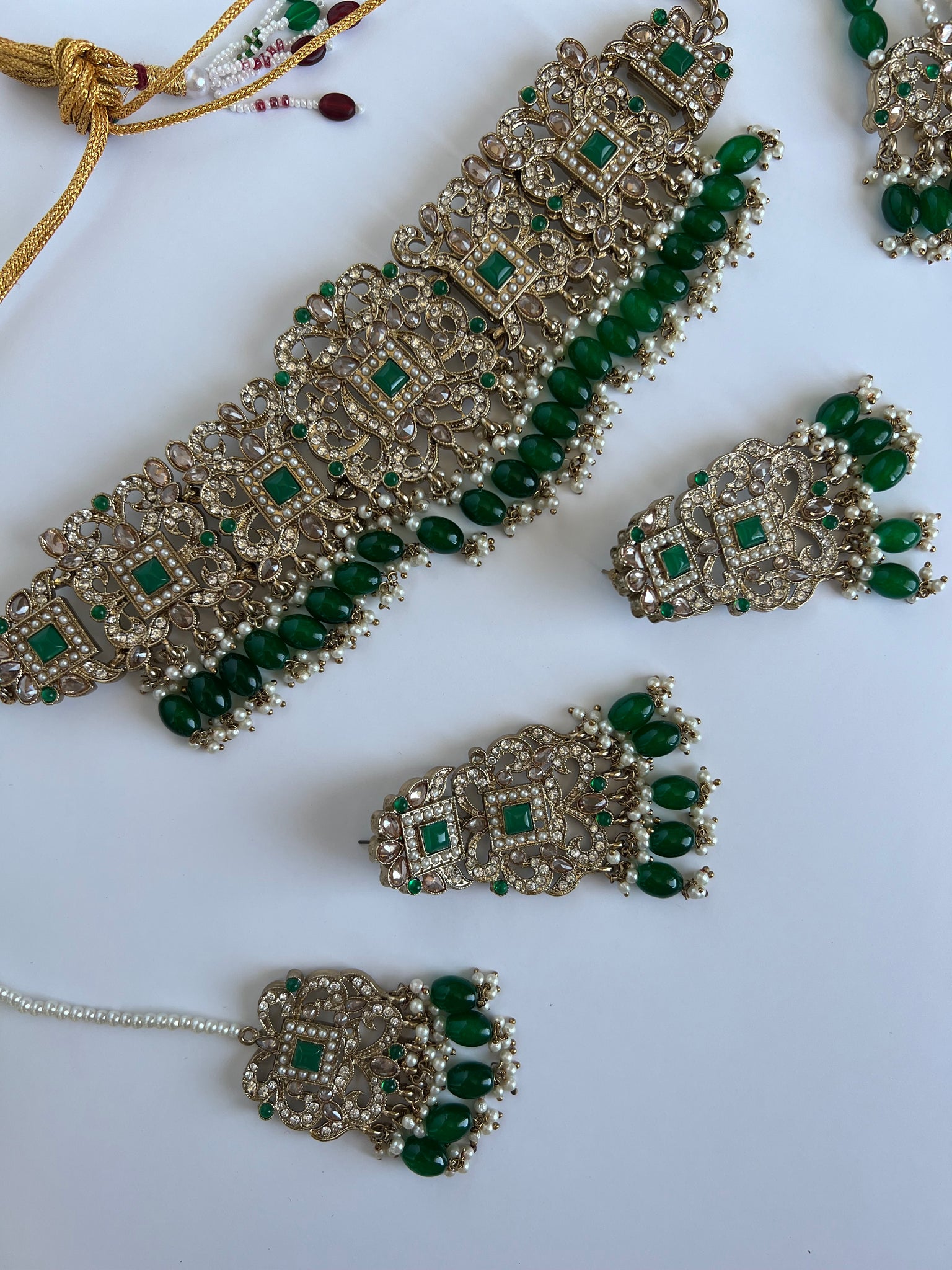 Stunning deep emerald green choker with earrings, tikka and Jhoomer