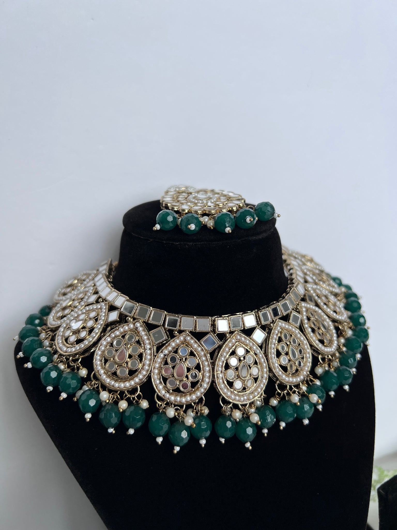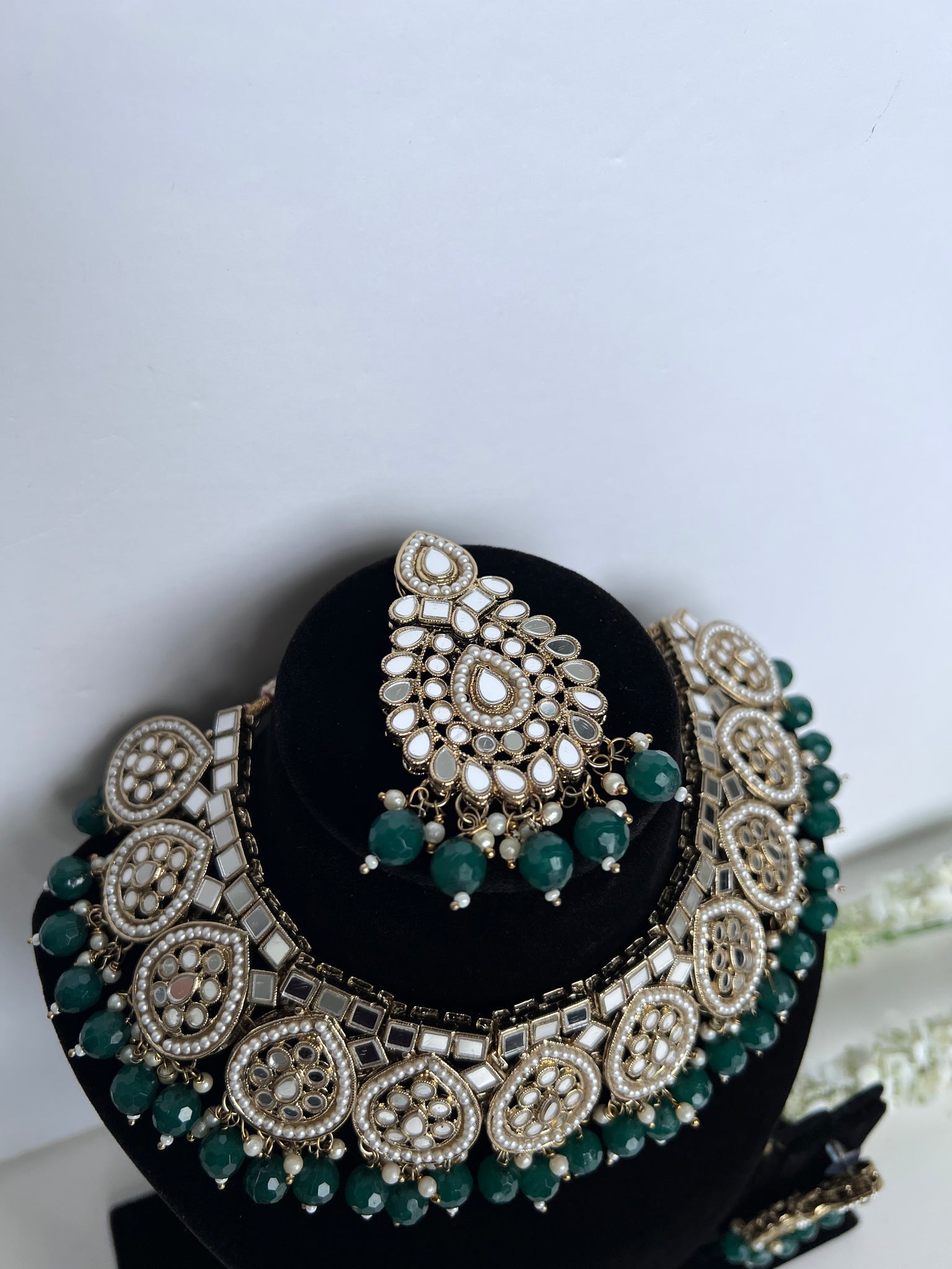 Beautiful necklace set in emerald green with Sheesha details. Comes with earrings and tikka