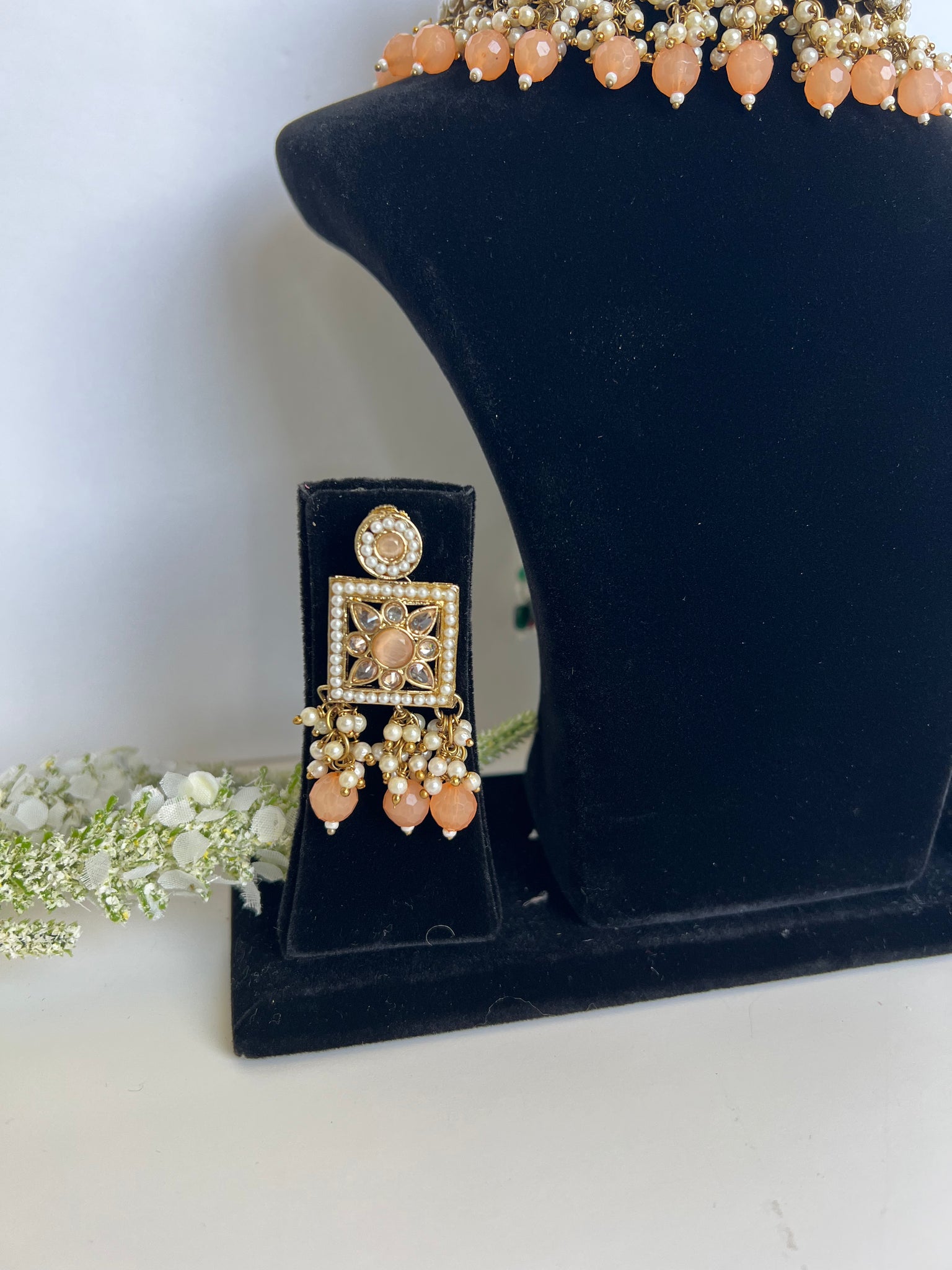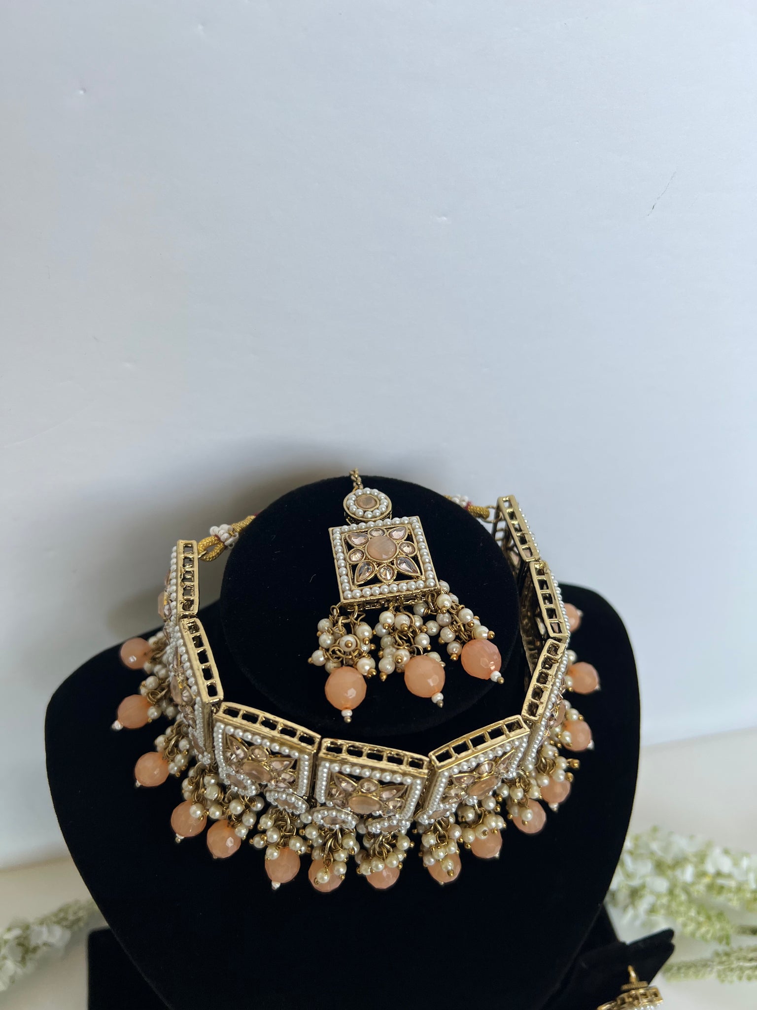 A beautiful flexible choker set with detailed pearl work and colourful embellishments. Comes with a stunning pair of earrings and tikka to match