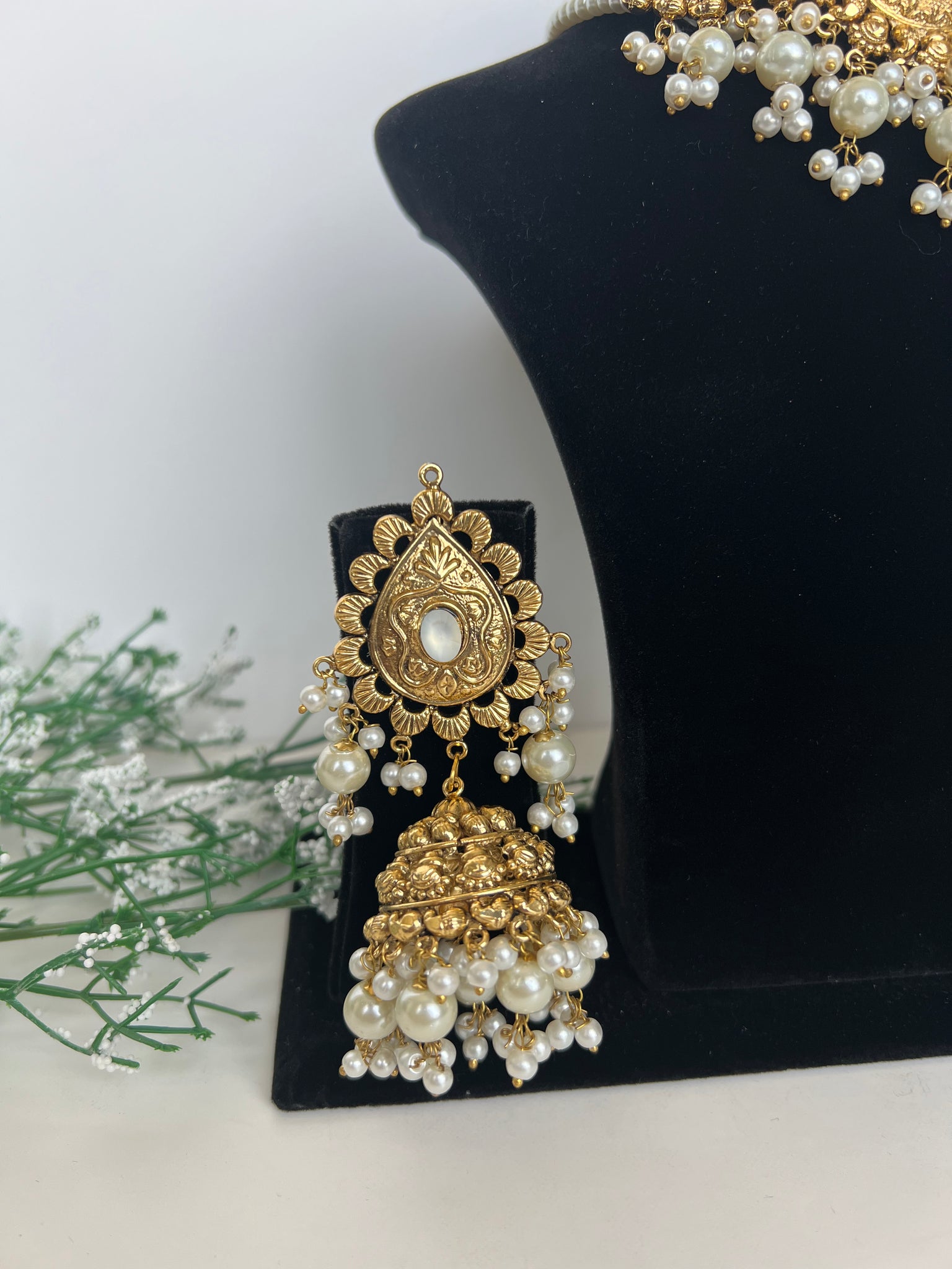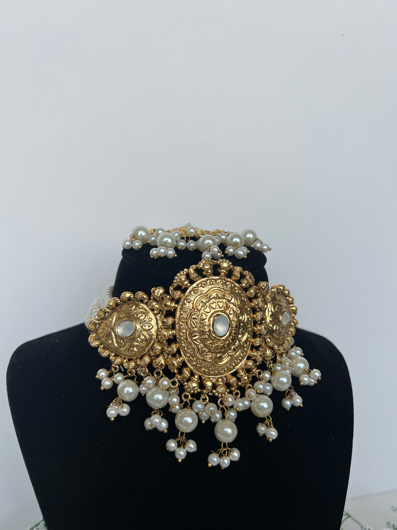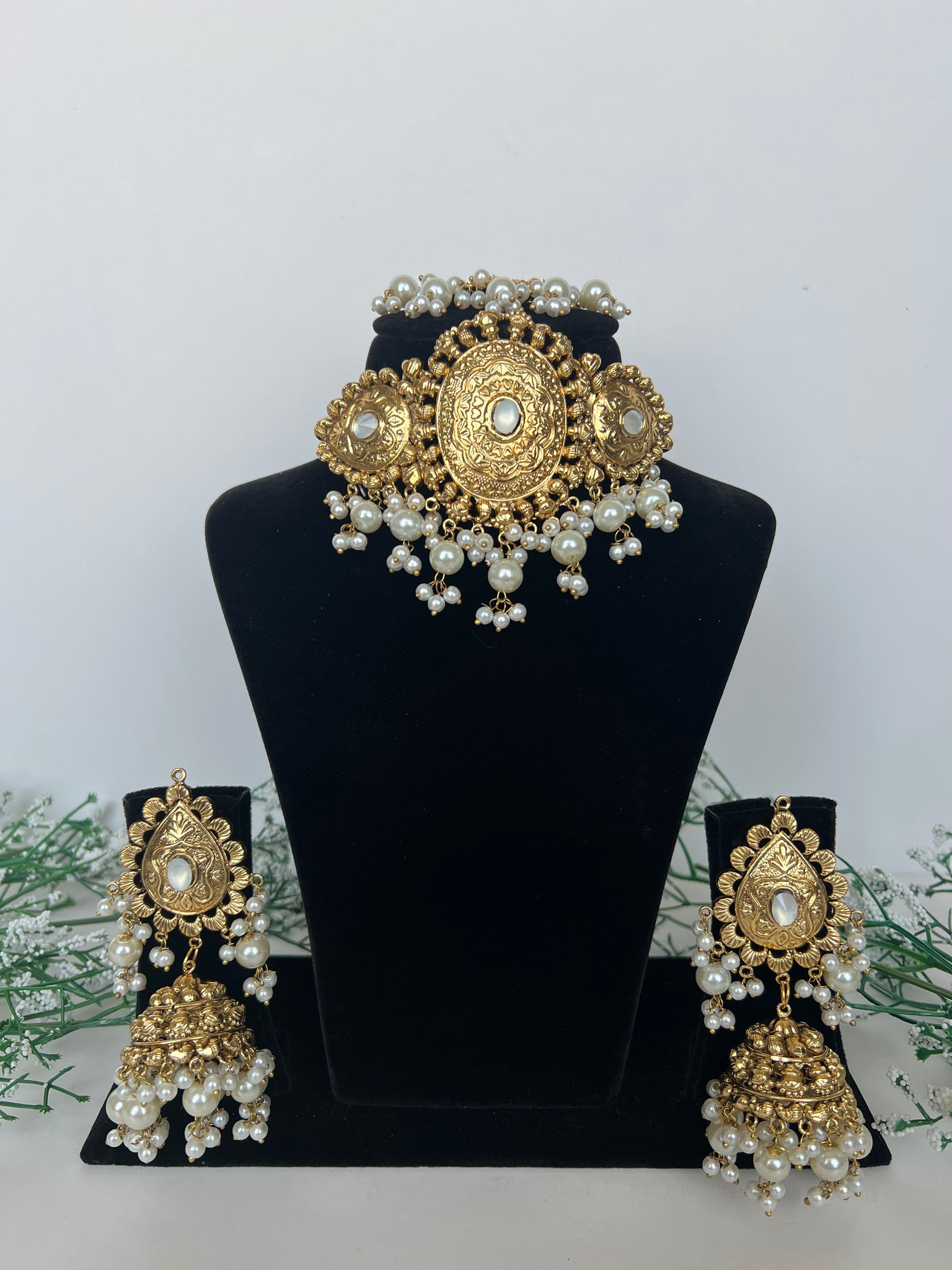 Antique gold pipal patti and patra choker set with jhumki earrings and tikka. Very lightweight!