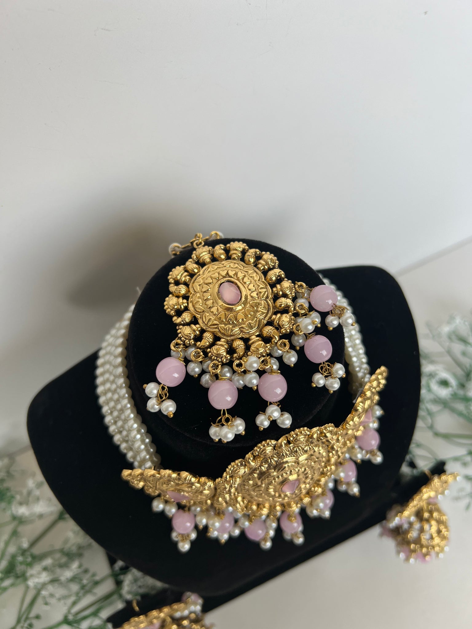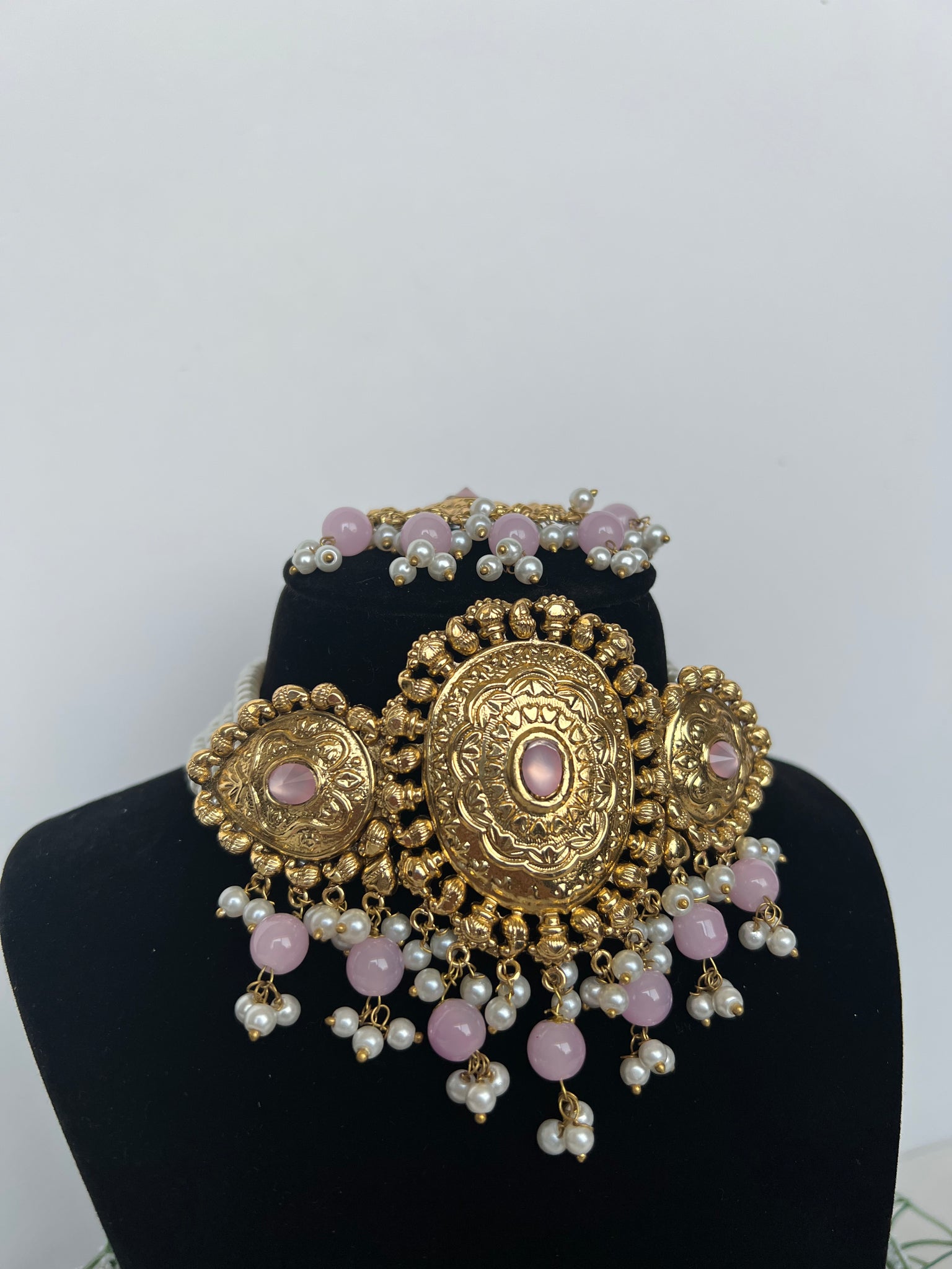 Antique gold and baby pink pipal patti and patra choker set with jhumki earrings and tikka. Very lightweight!