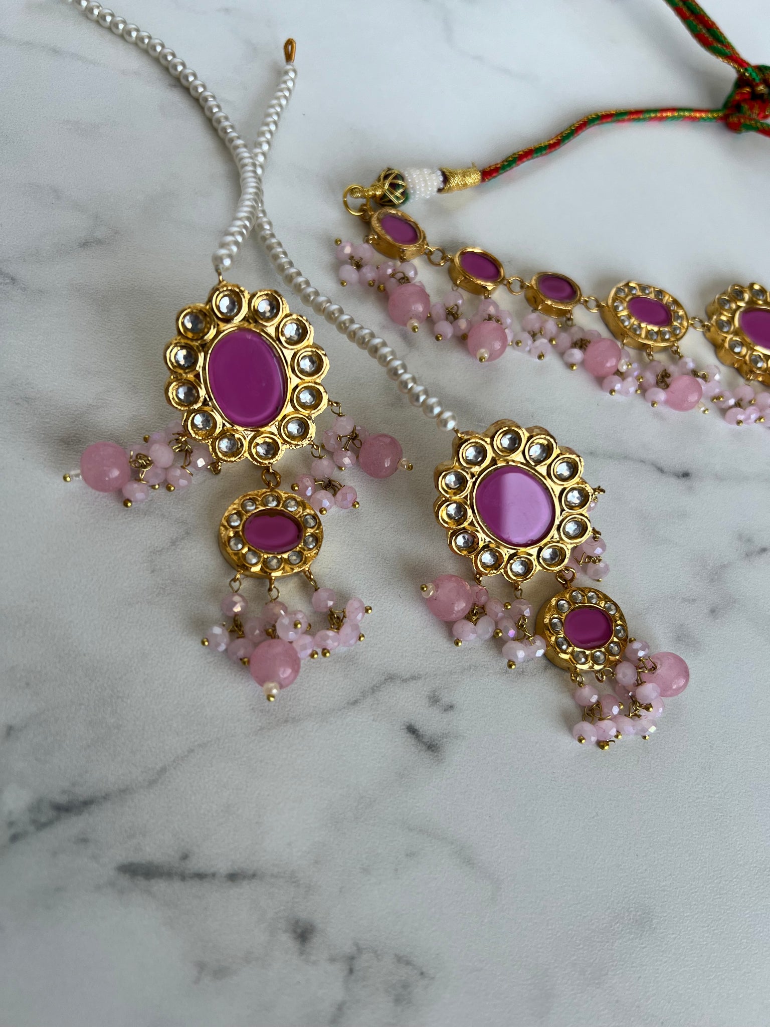Pakistani thappa kundan set, can be worn as a necklace or choker. Has beautiful earrings with tikka. In the colour ppink . 22K gold plated