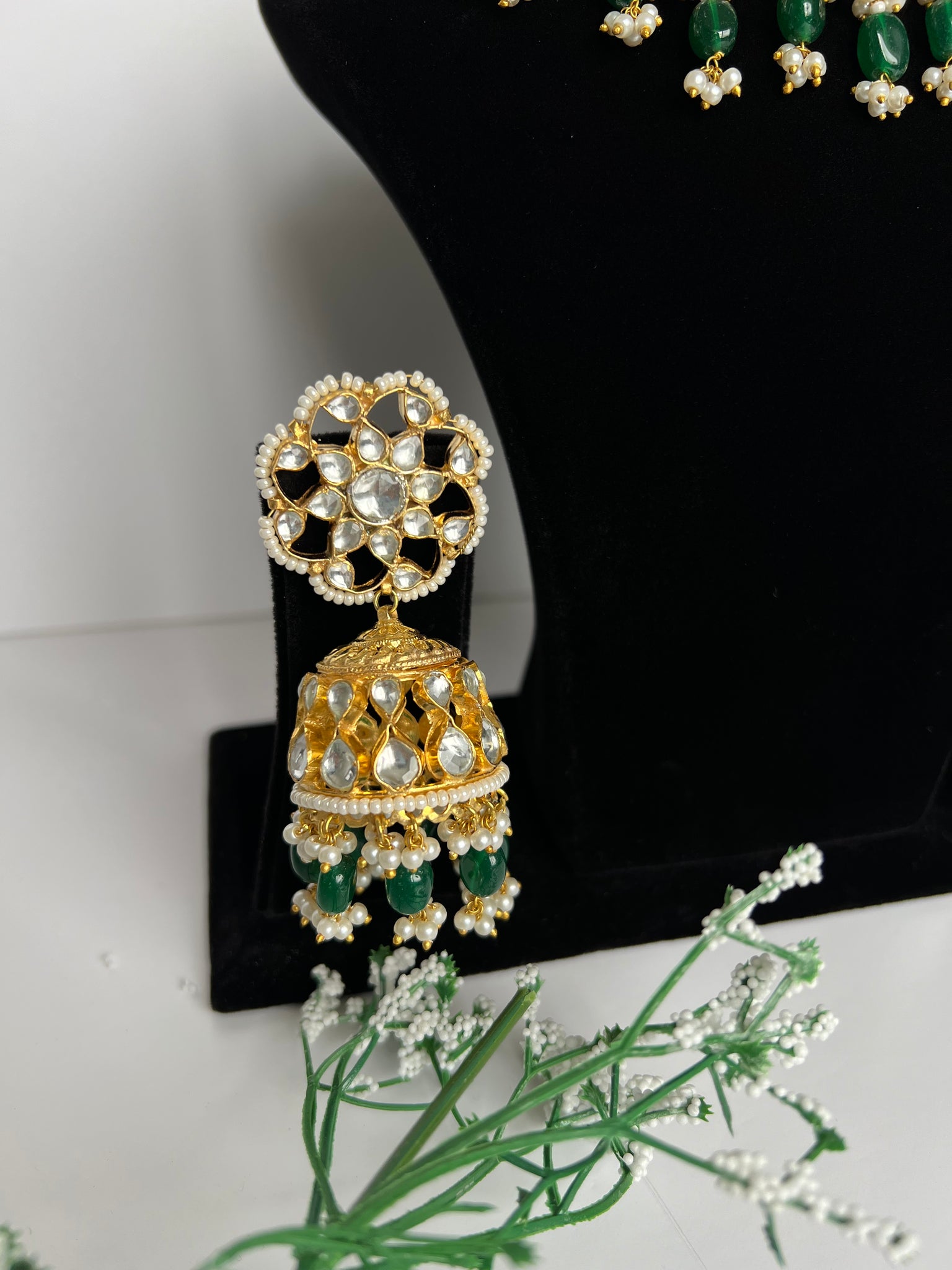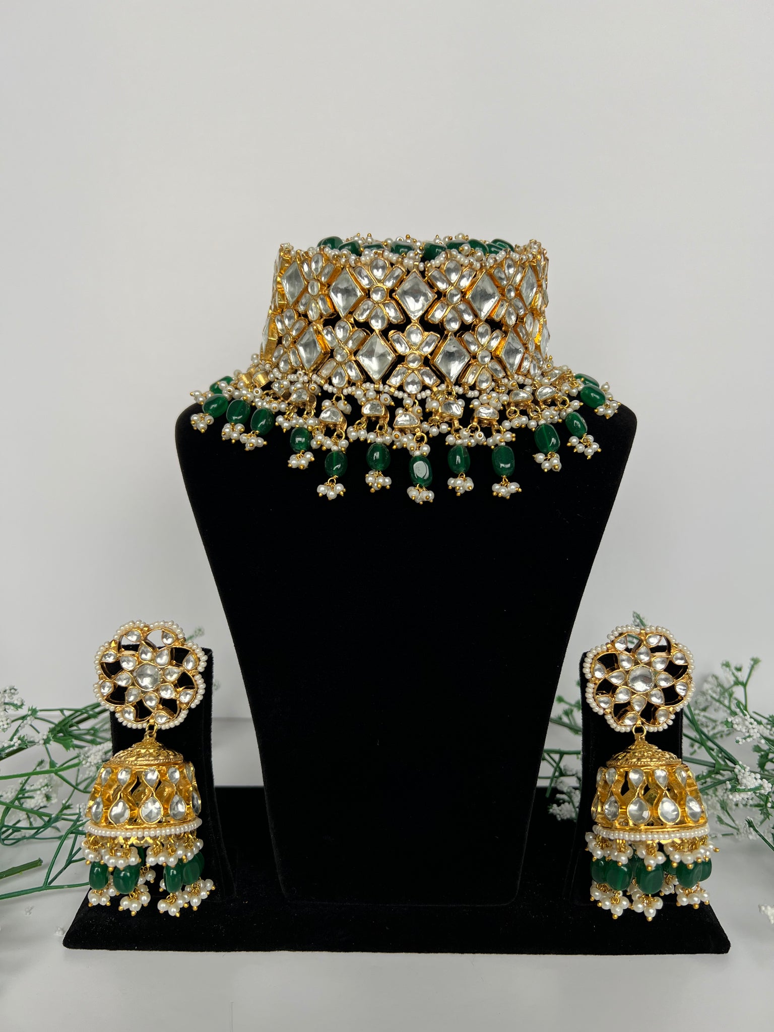 Stunning emerald green Pachi kundan choker set with jhumki earrings and tikka. 22K gold plated jewelry gives you an elegant and royalty look.