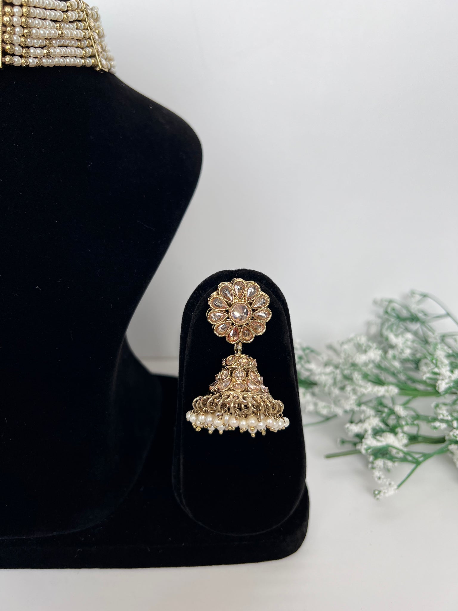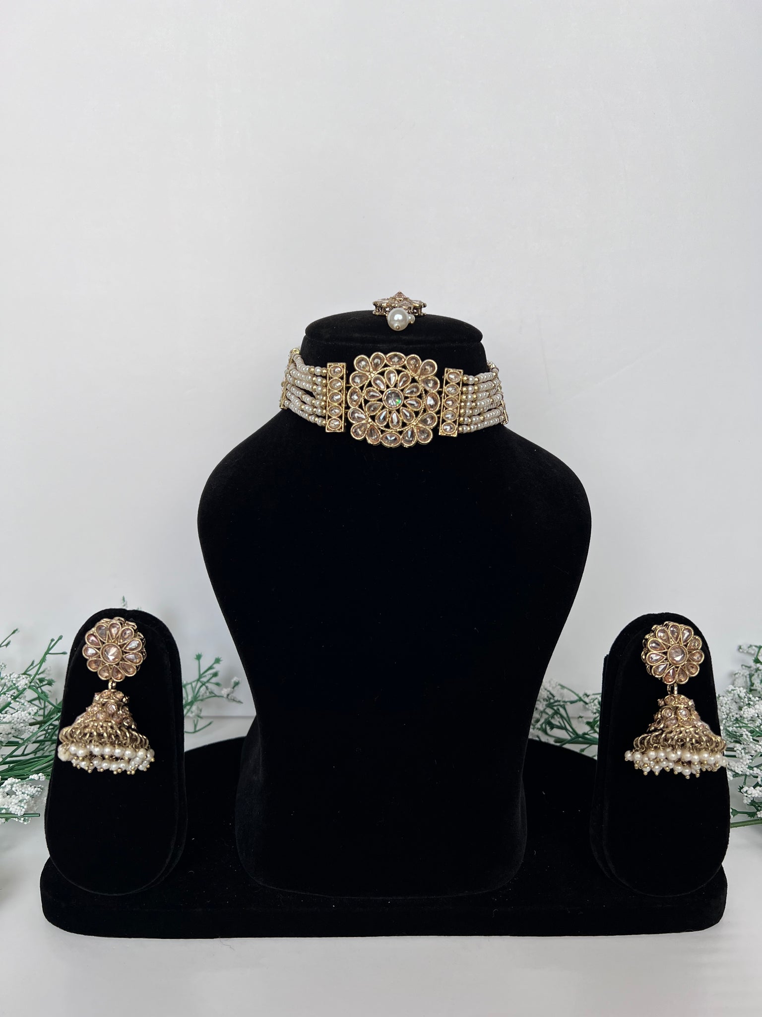 Stunning golden choker with jhumki earrings and tikka! Very unique style and beading
