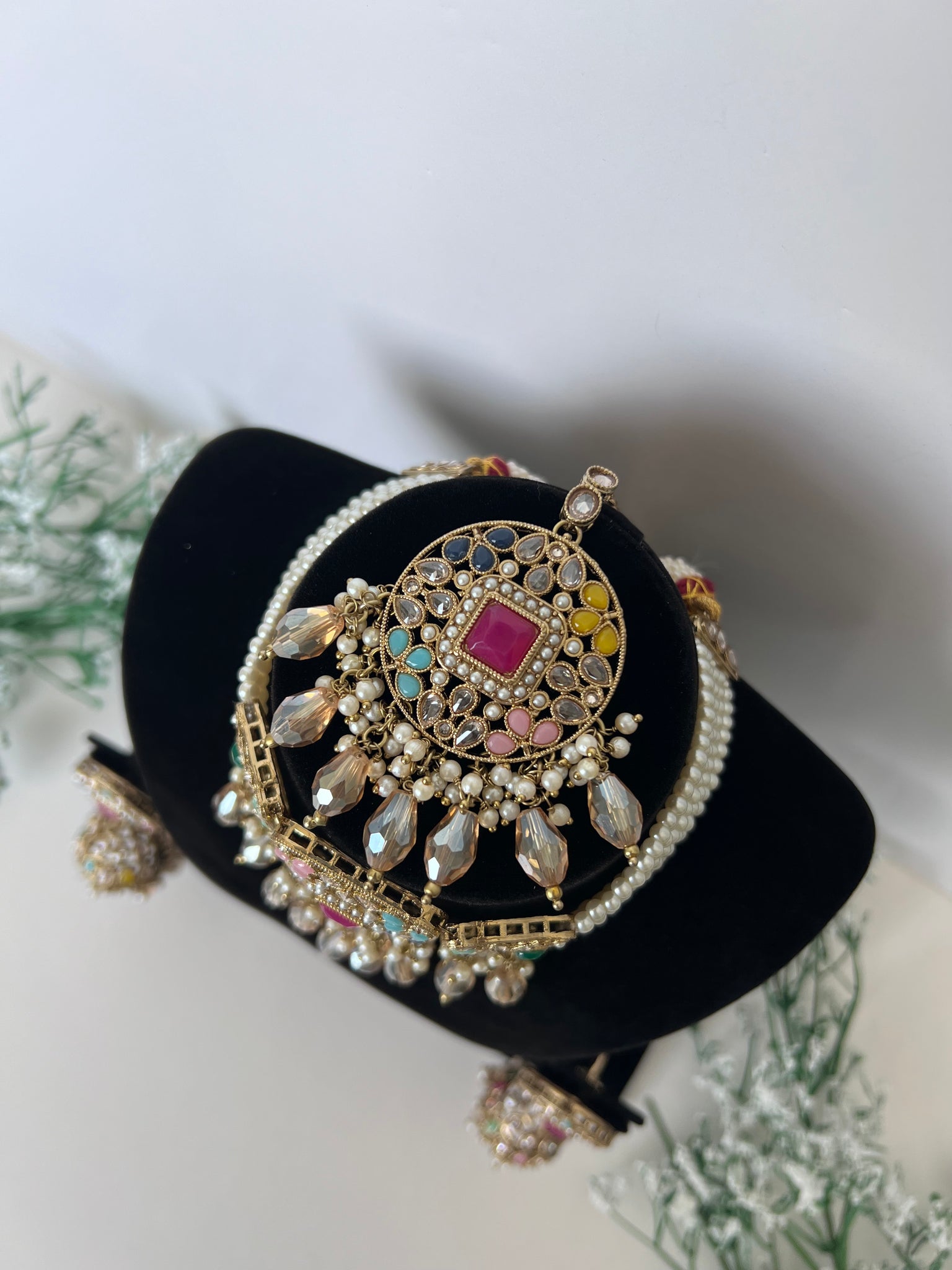 Beautiful crystal beading choker set in multi with jhumki and tikka