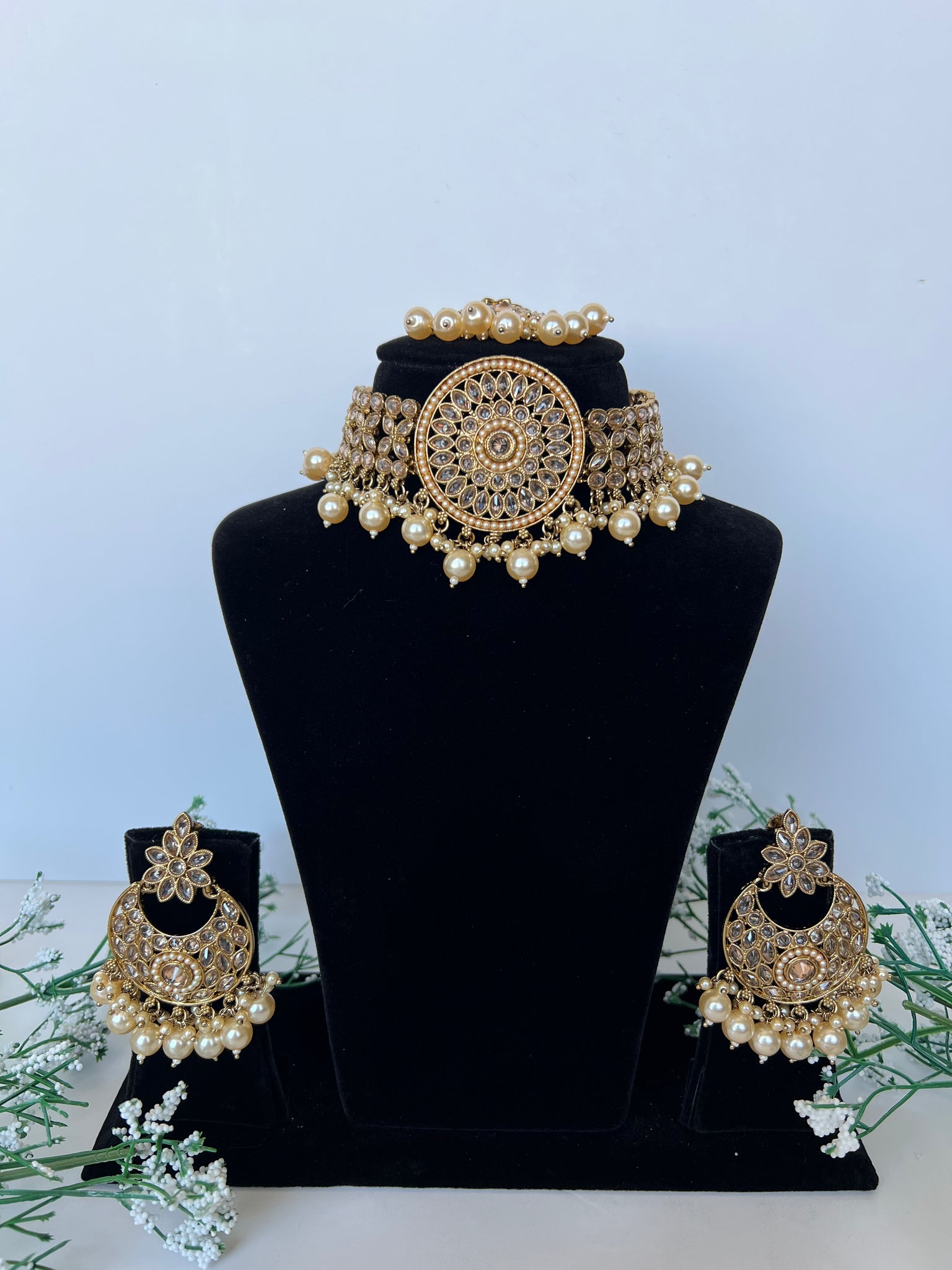 Golden choker set with earrings and tikka