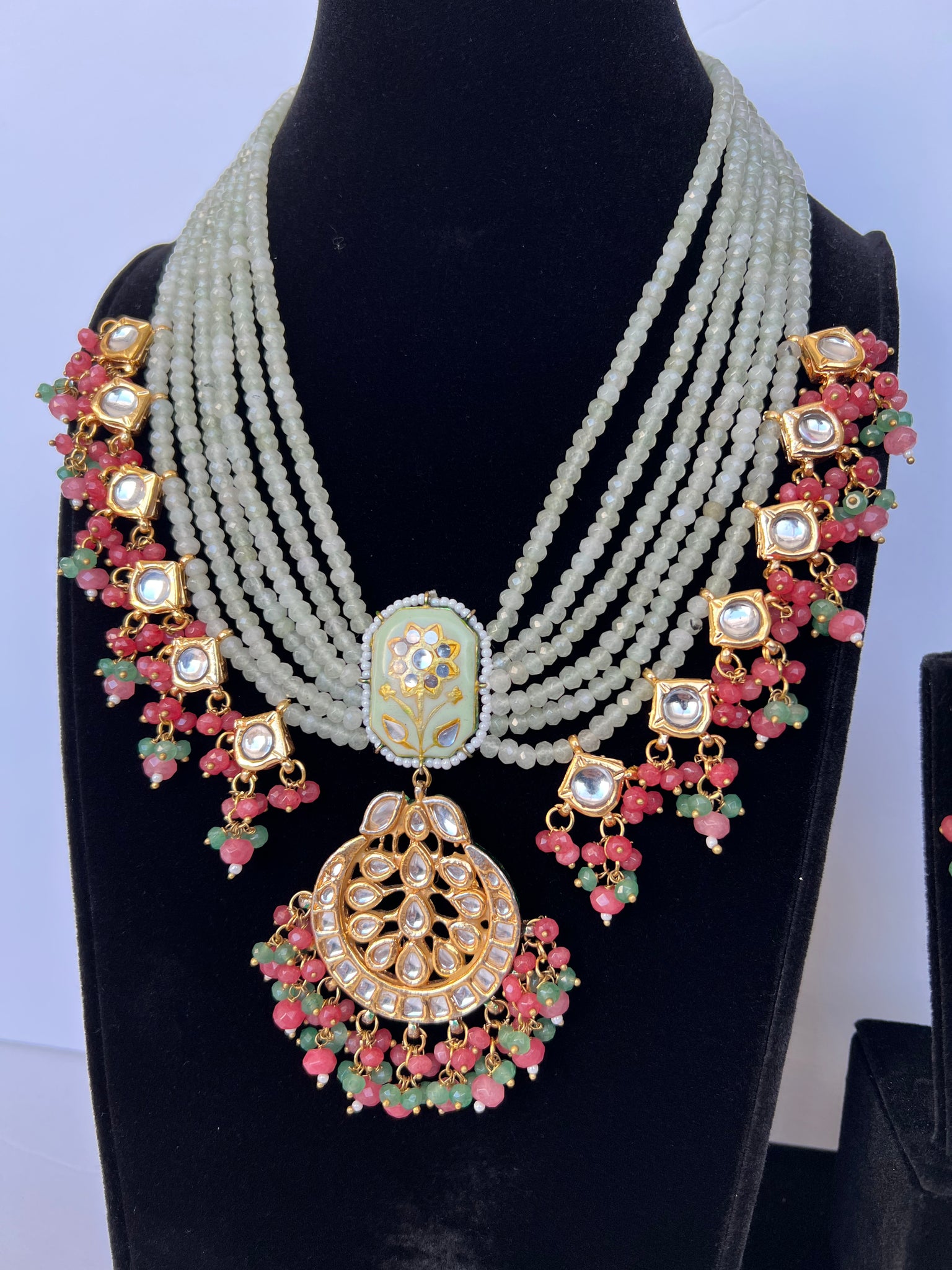 Stunning mint and pink contrast Rajasthani hand painted kundan necklace. Rani Haar / long necklace with stud earrings