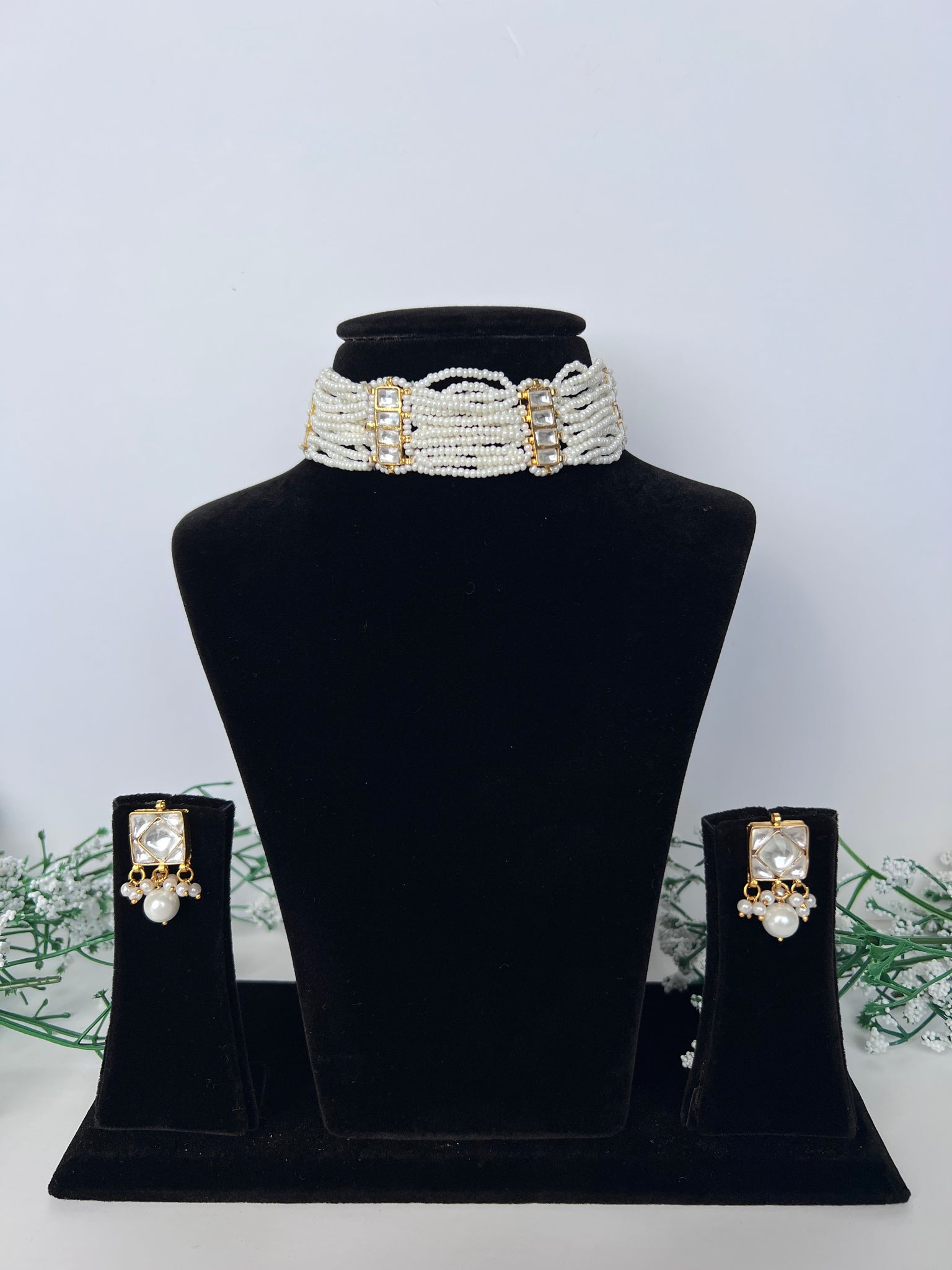 22K gold plated Pachi kundan detail on a pearl choker with earrings