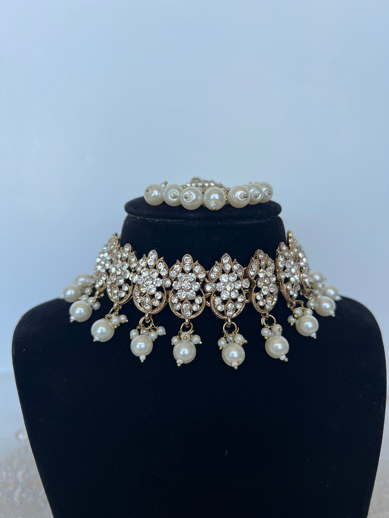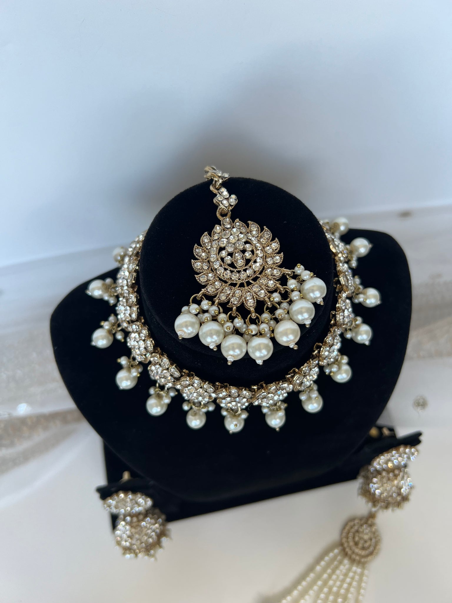 Stunning kundan stone work choker with earrings, tikka, and Jhoomer