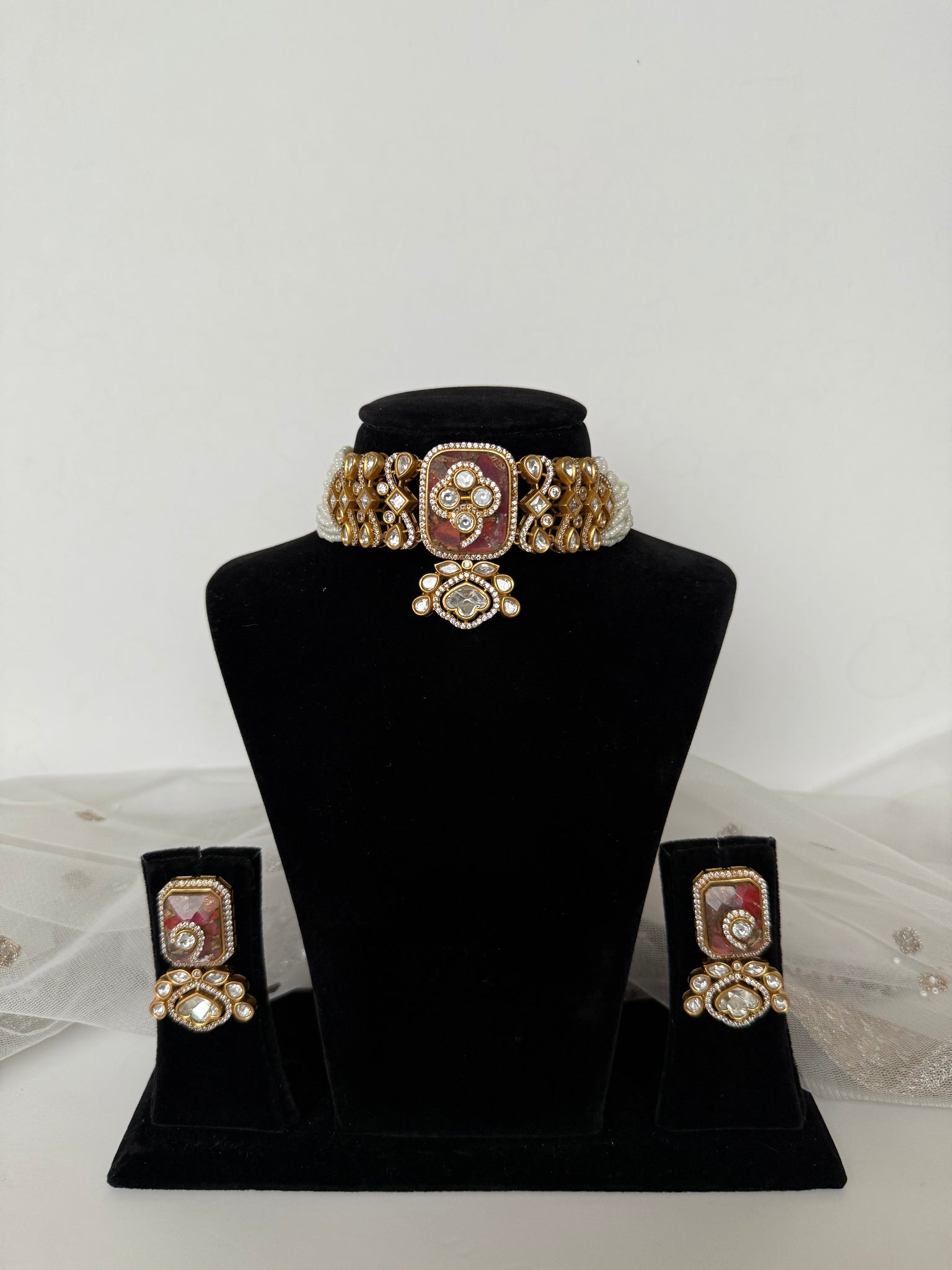 Gorgeous tiyani kundan choker set in a marble pink with gold plated kundan stones and earrings