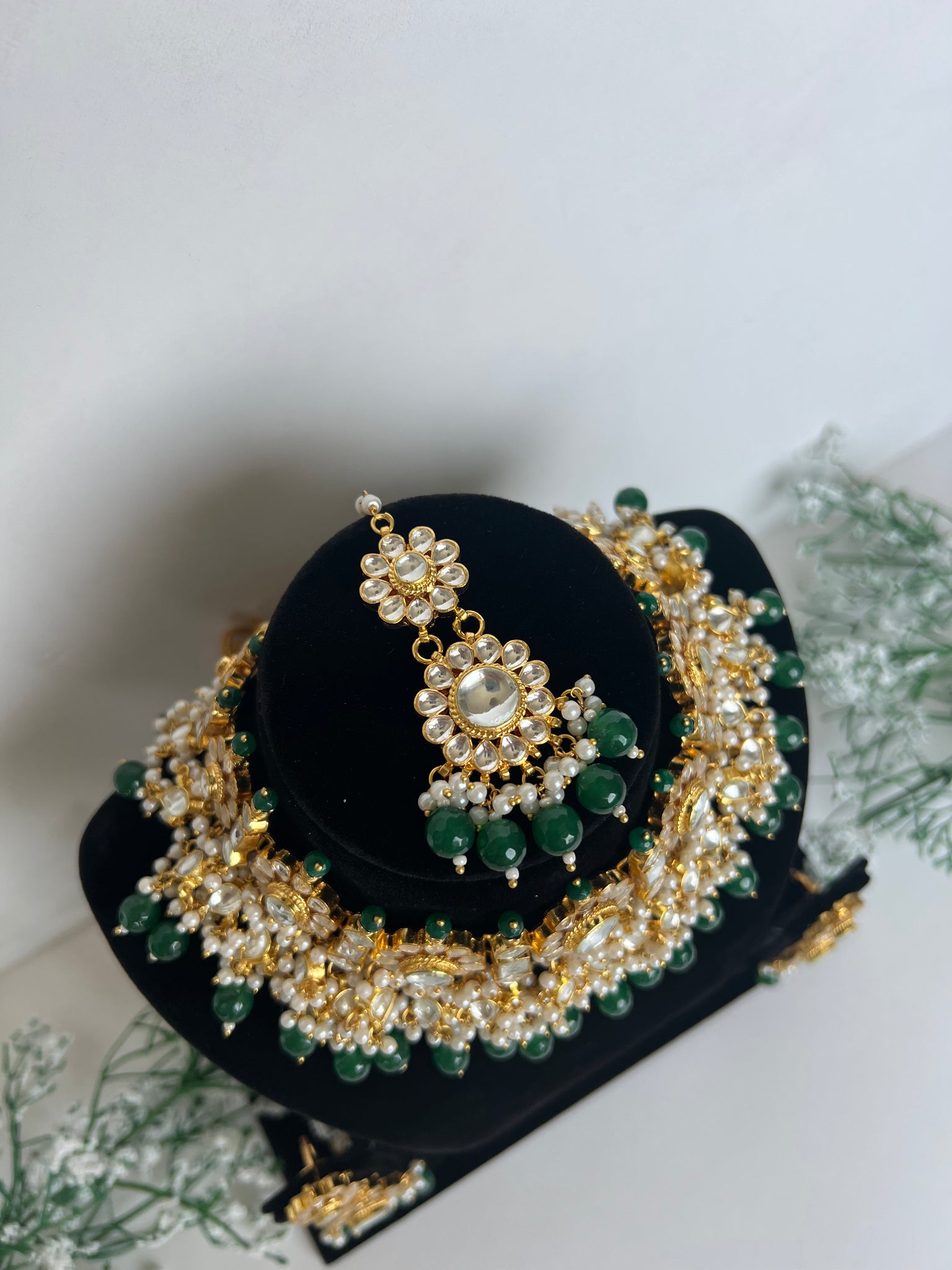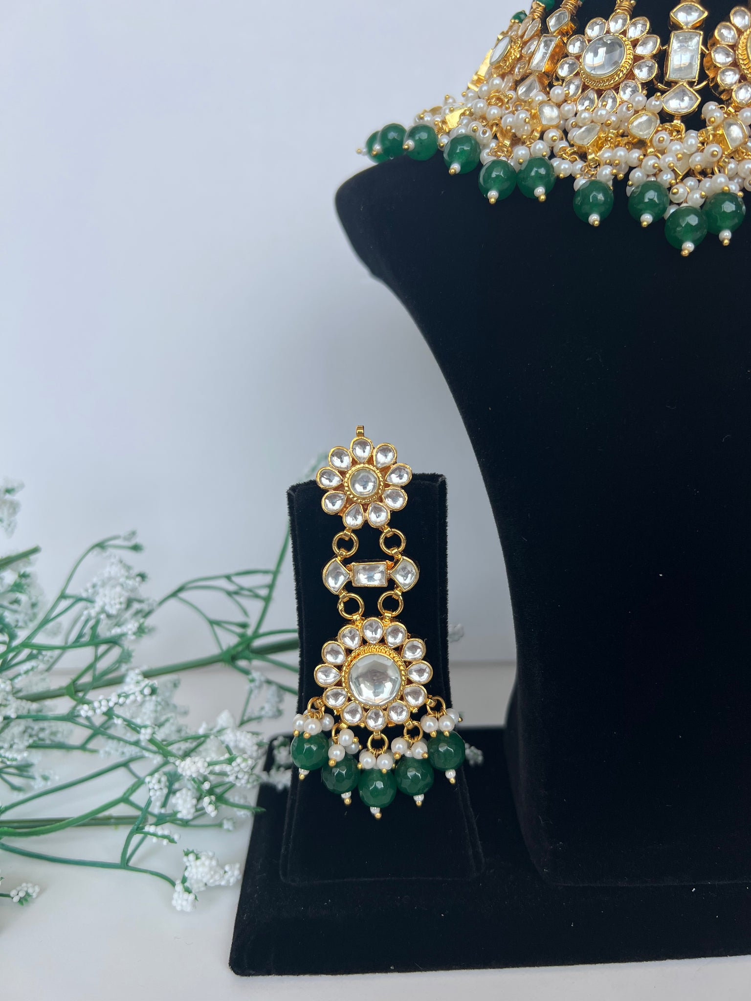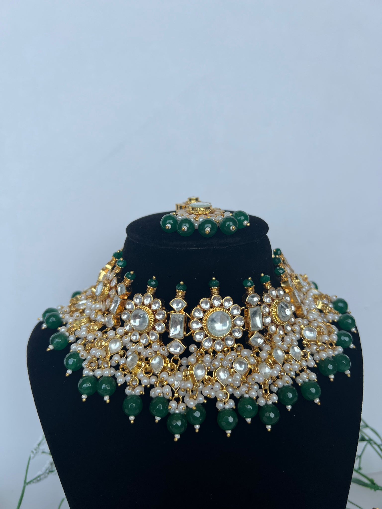 22K gold plated Pachi kundan necklace set with earrings and tikka In emerald green
