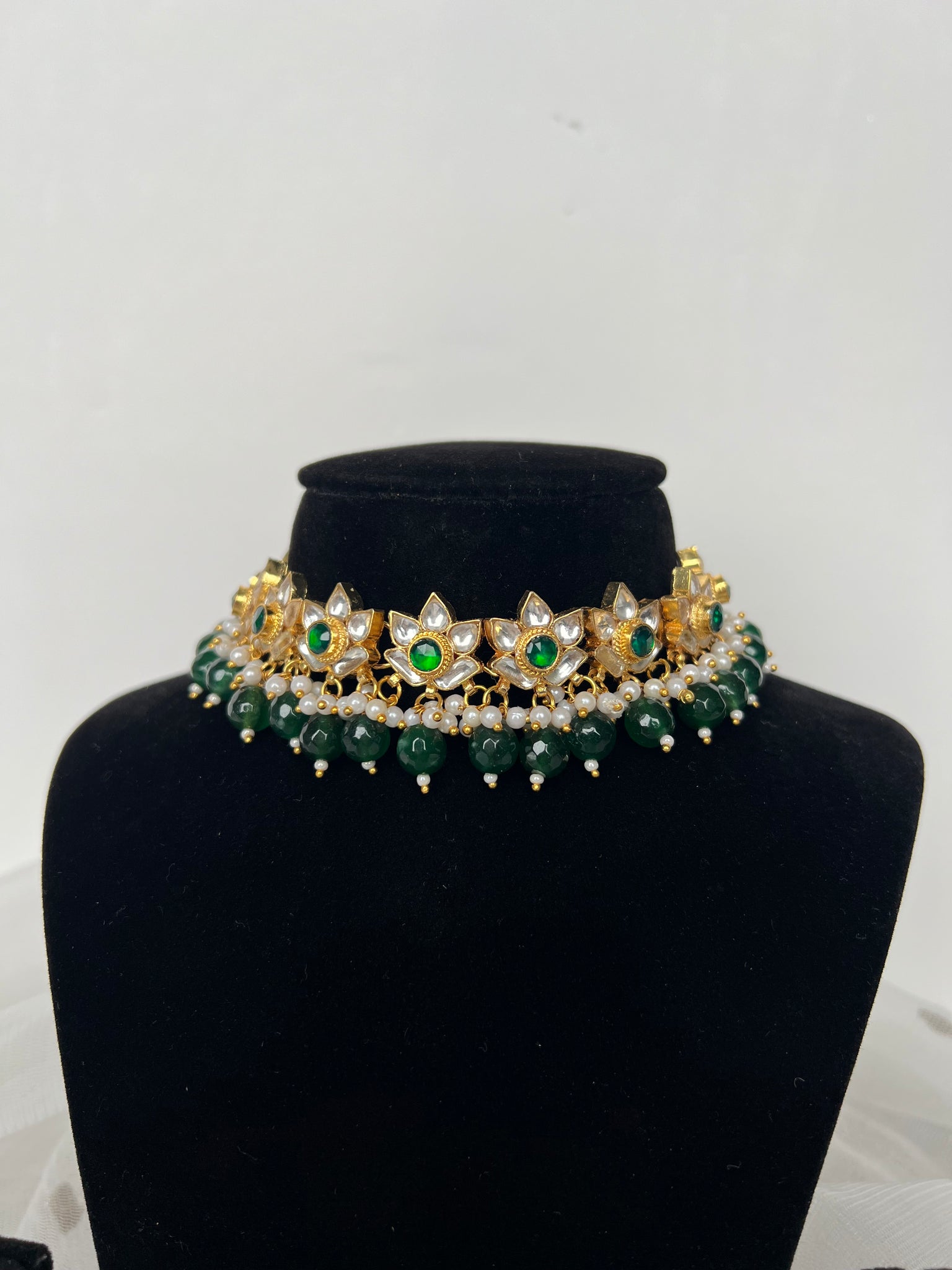 Stunning Pachi kundan gold plated choker set with earrings, in the colour emerald green