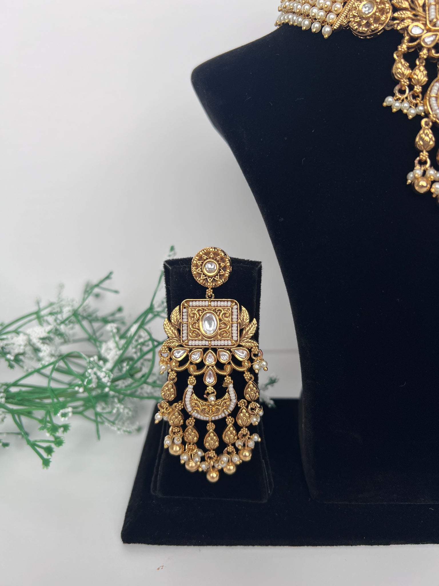 Antique gold kundan set with 22K gold plating, has white pearl beading on the choker. Comes with statement earrings