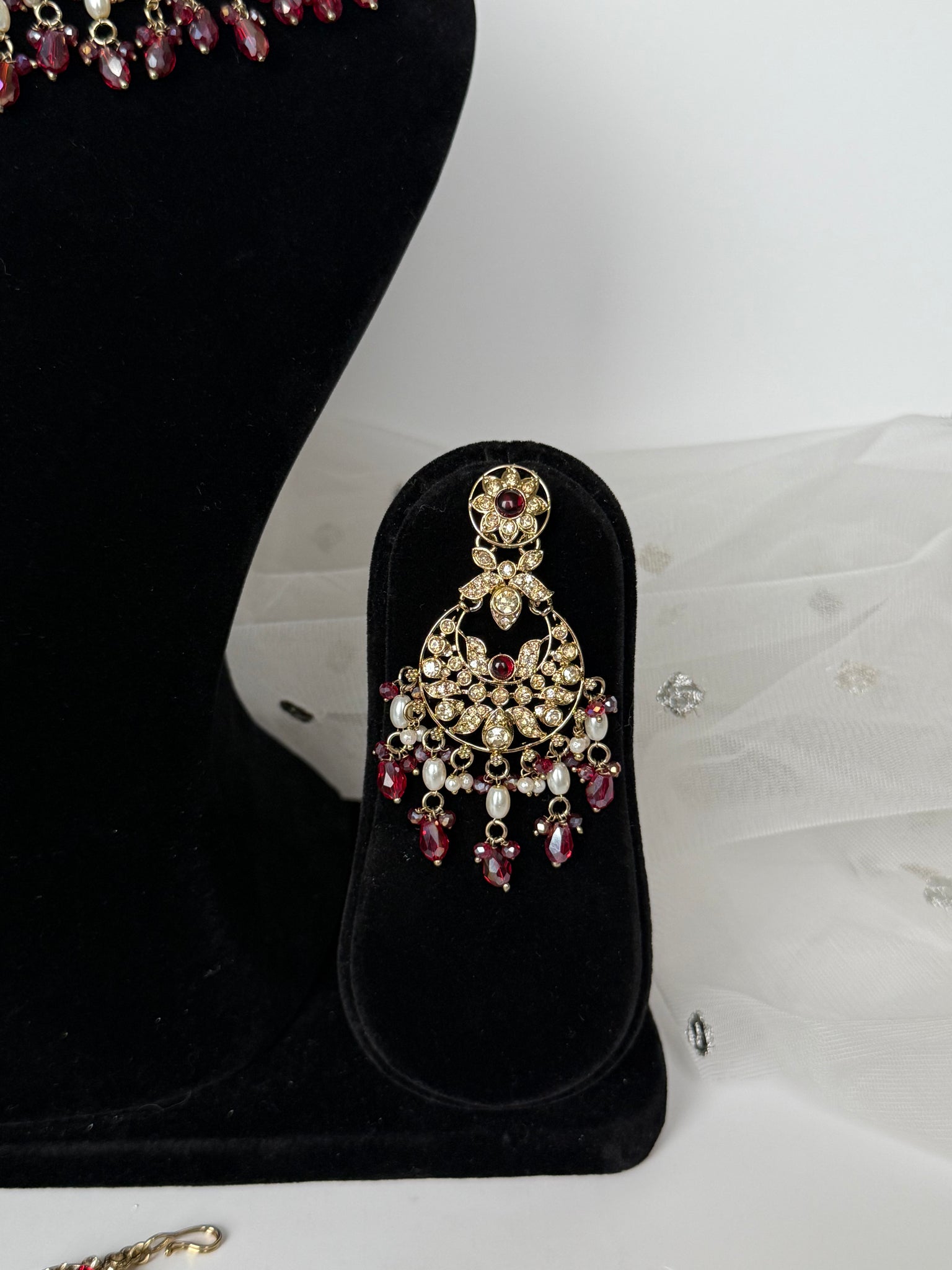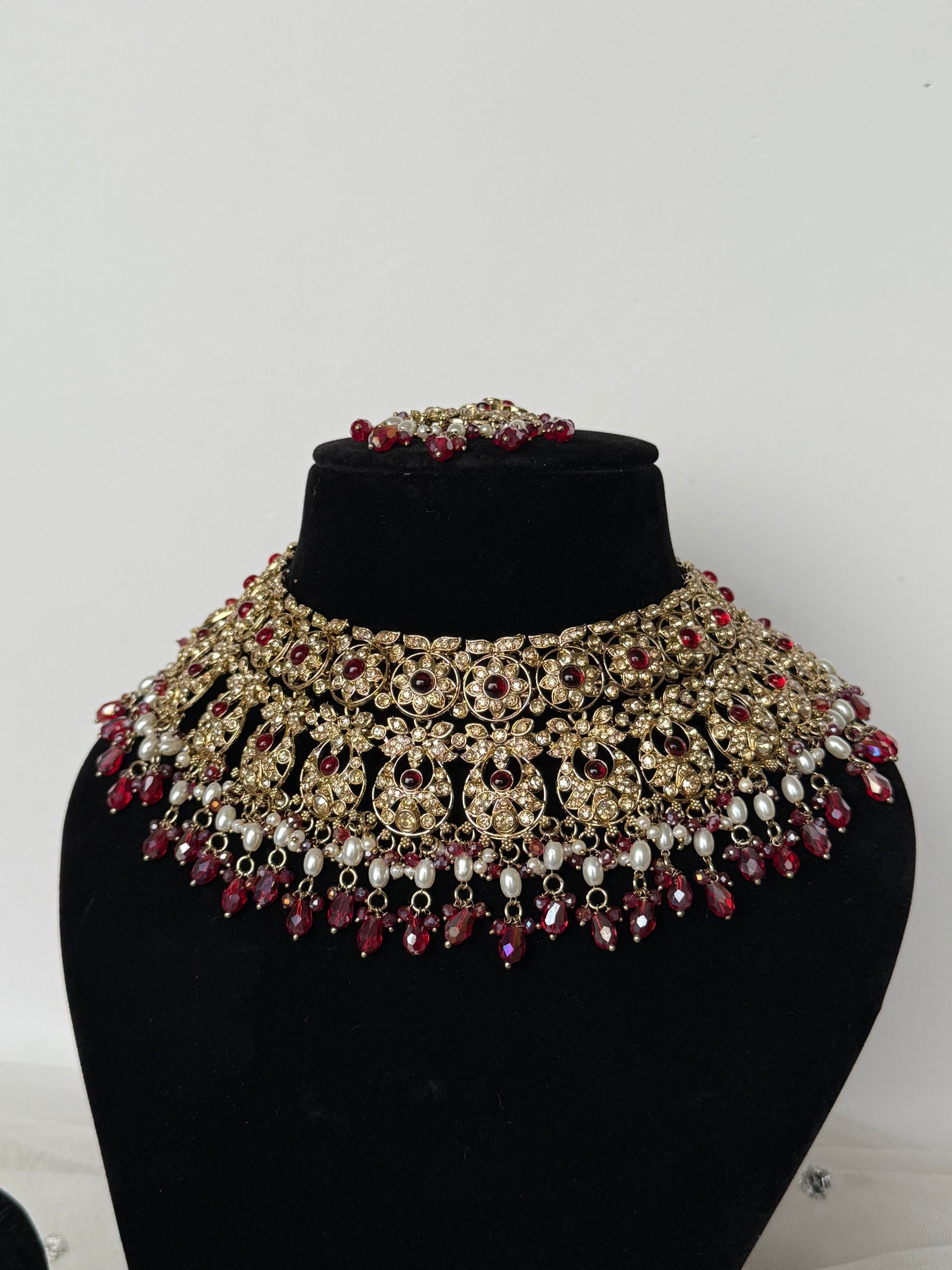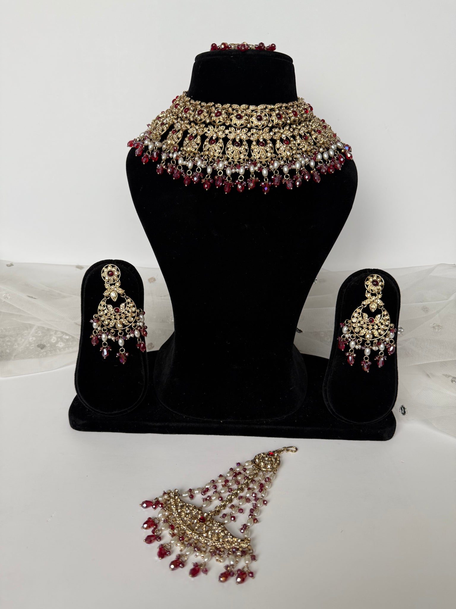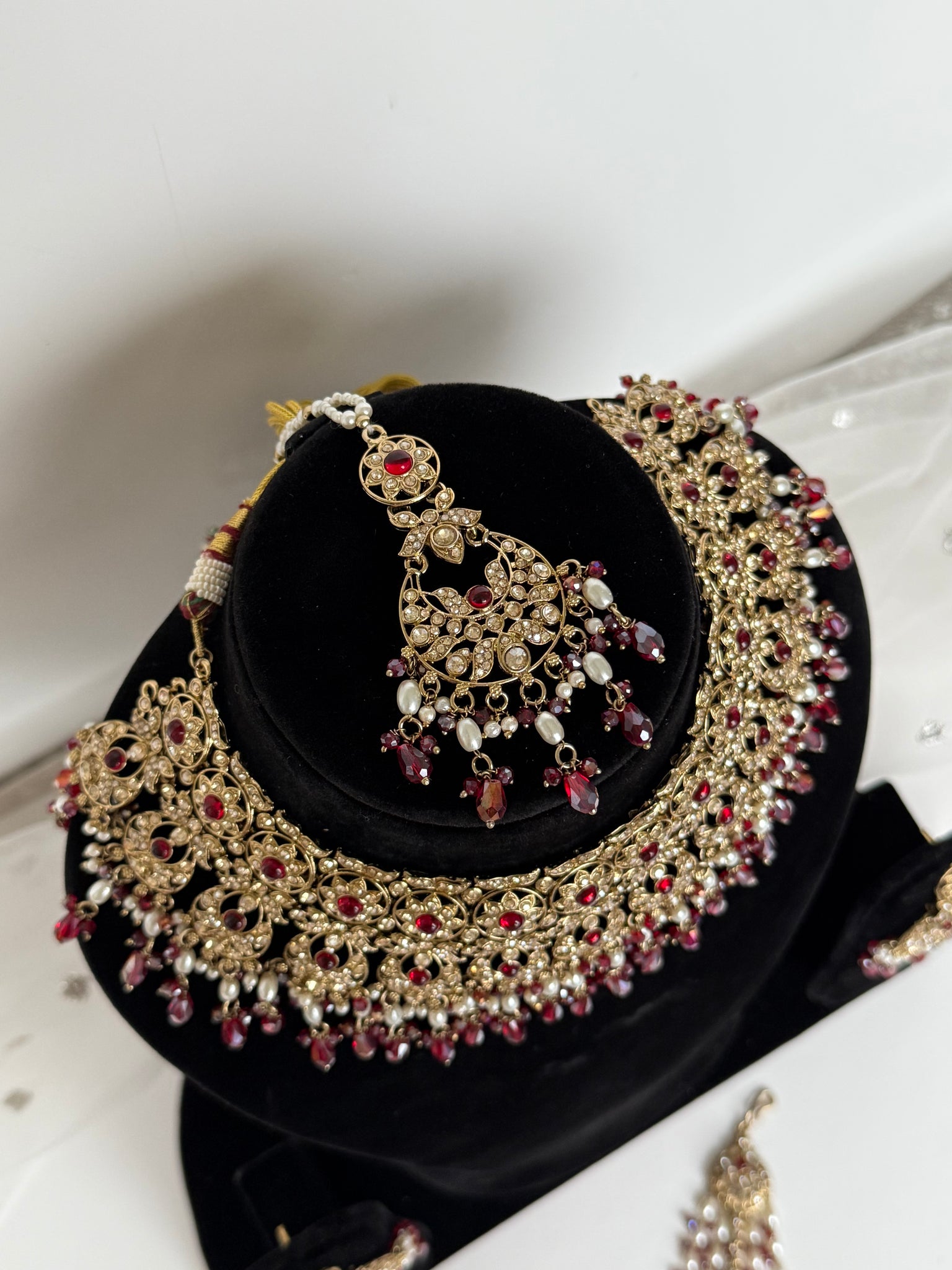 Stunning maroon bridal set with golden, comes with earrings and tikka, passa