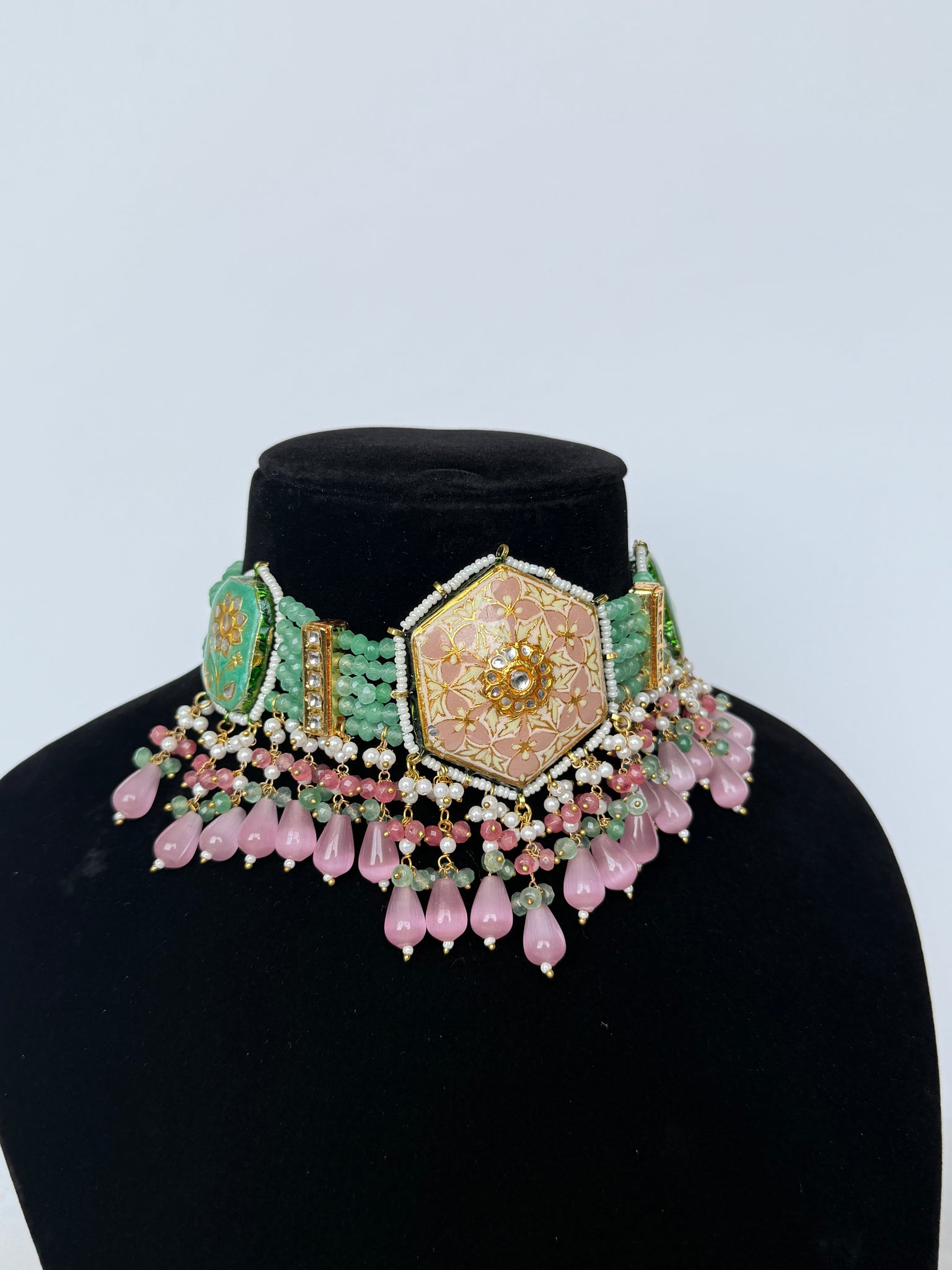 Gorgeous meenakari kundan choker with sage and pink comes with gorgeous earrings