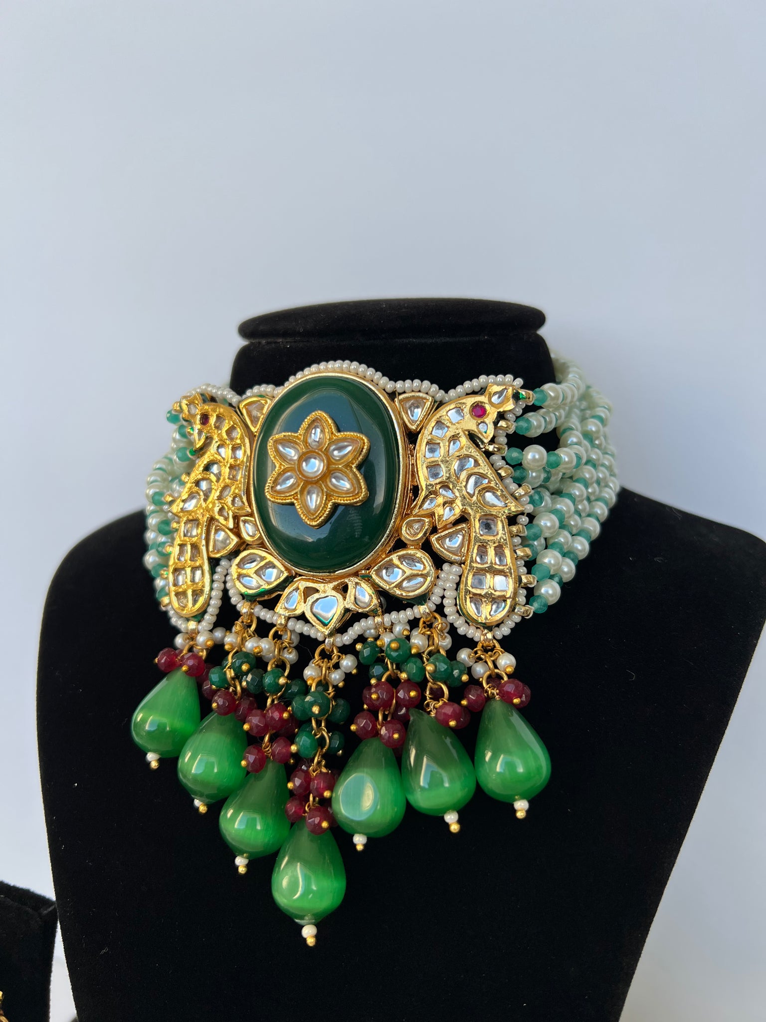 Emerald Green Rajasthani style kundan statement piece with stunning earrings to match