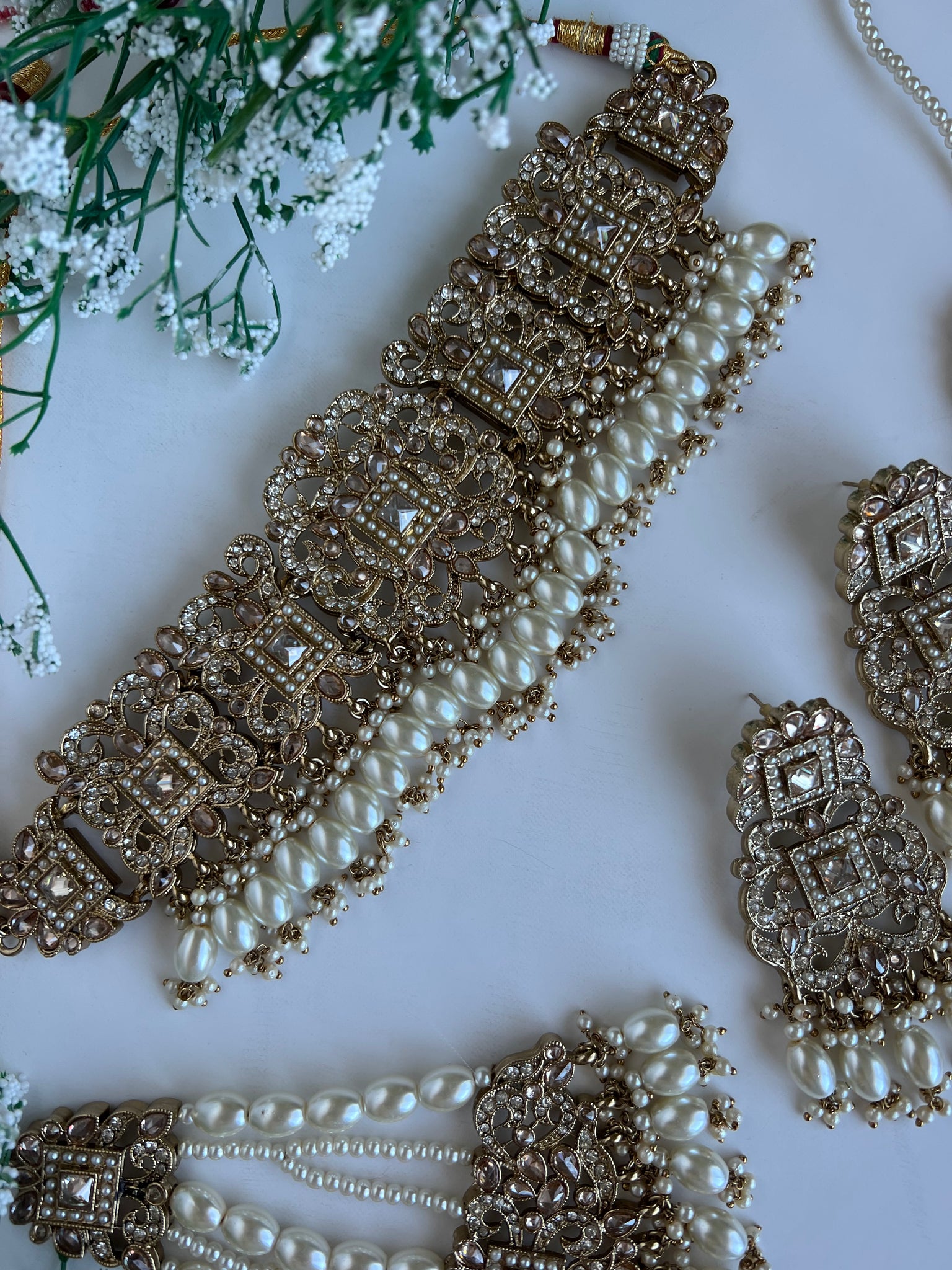 Antique gold choker with stunning earrings, tikka and Jhoomer/Passa
