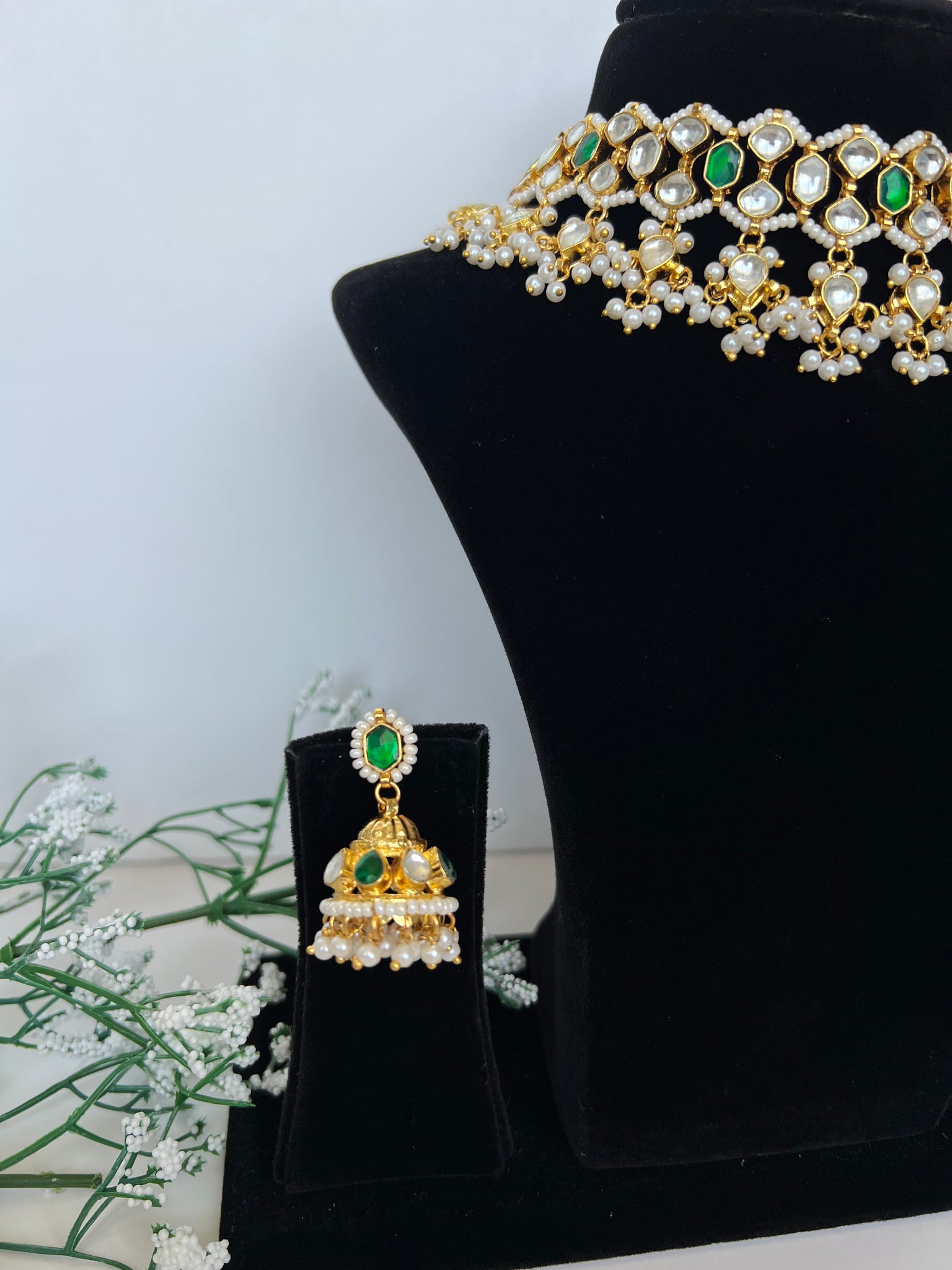 Pachi kundan emerald green set with jhumkis