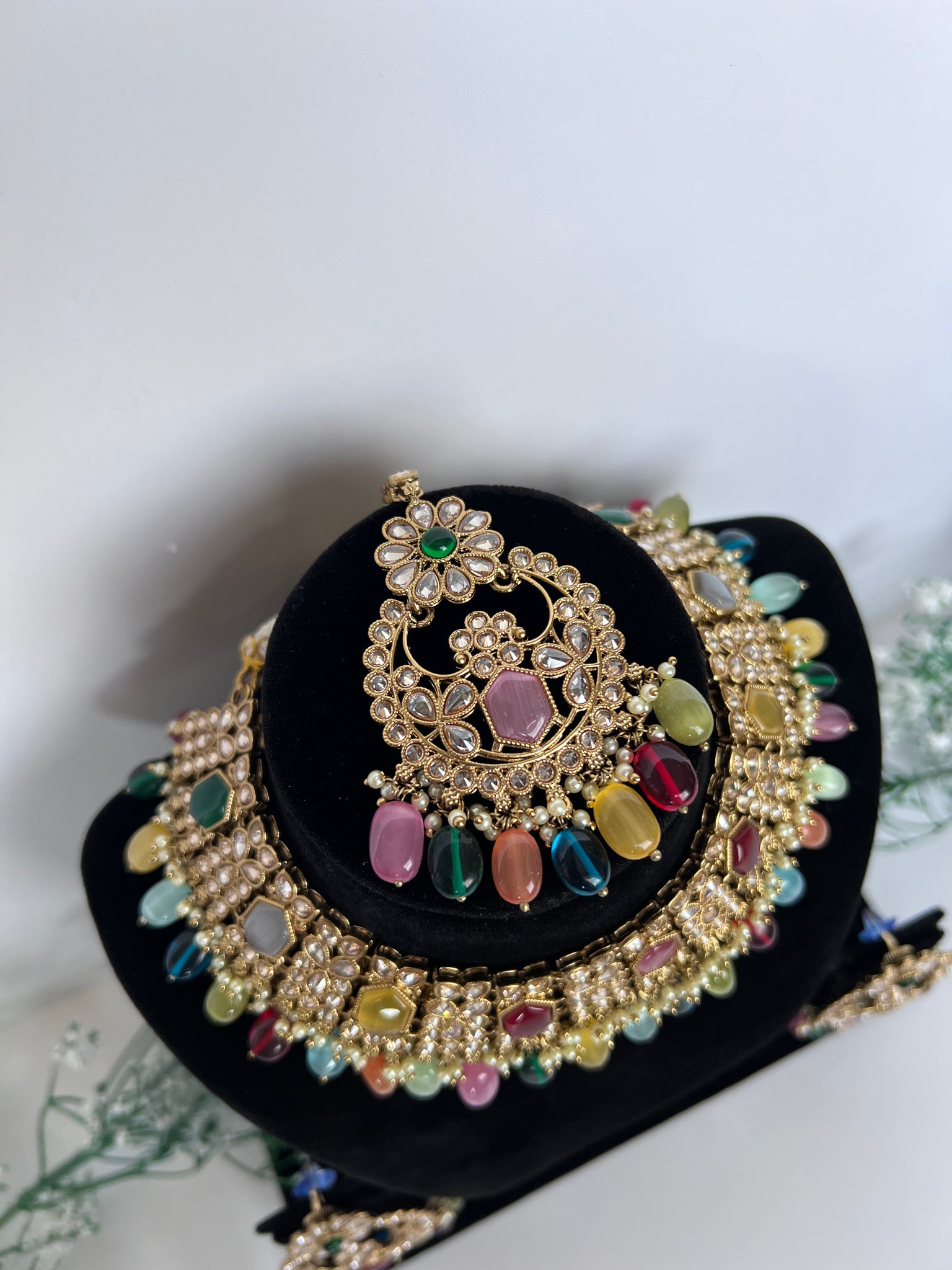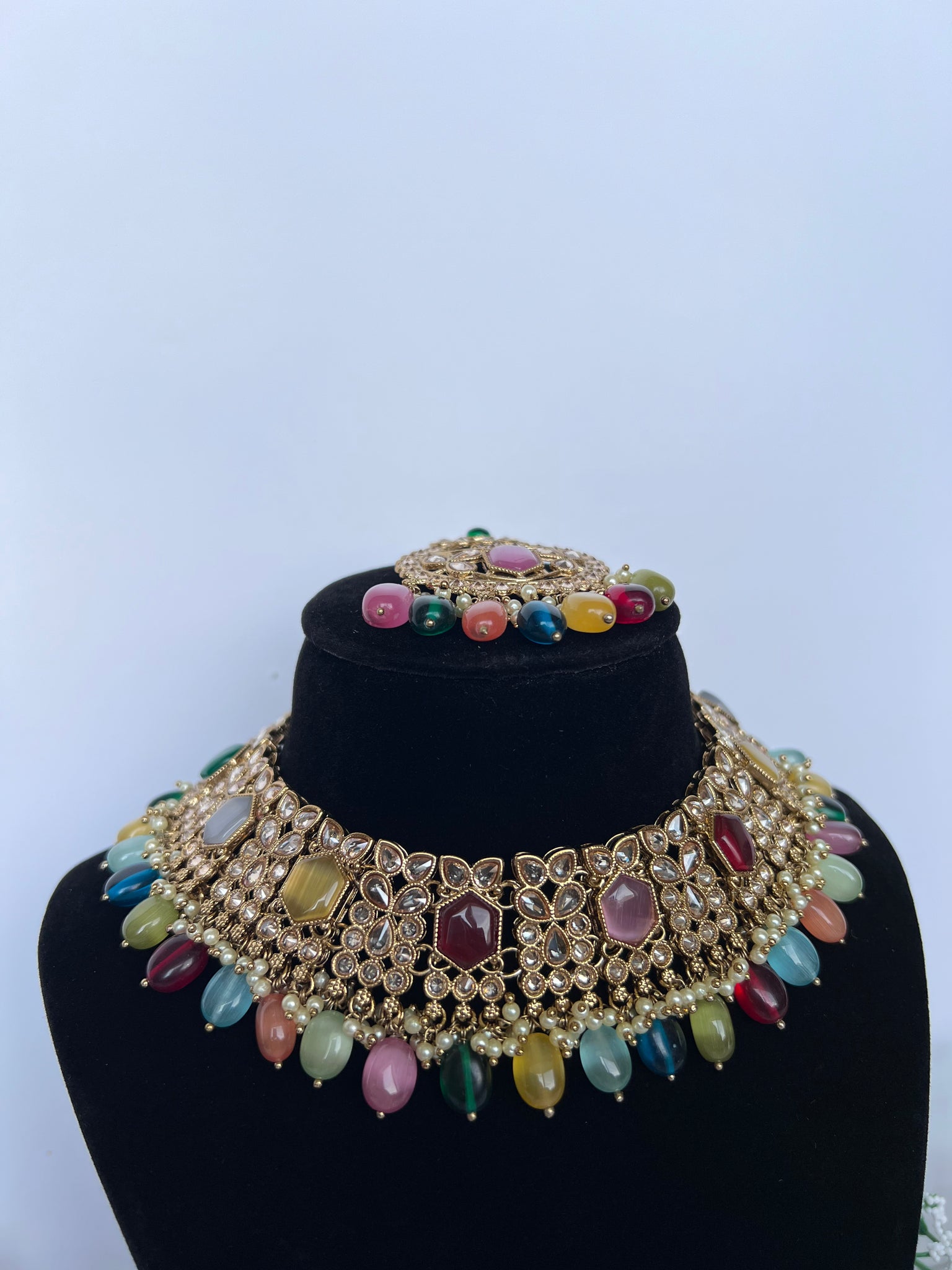 Multi coloured necklace set with earrings and tikka