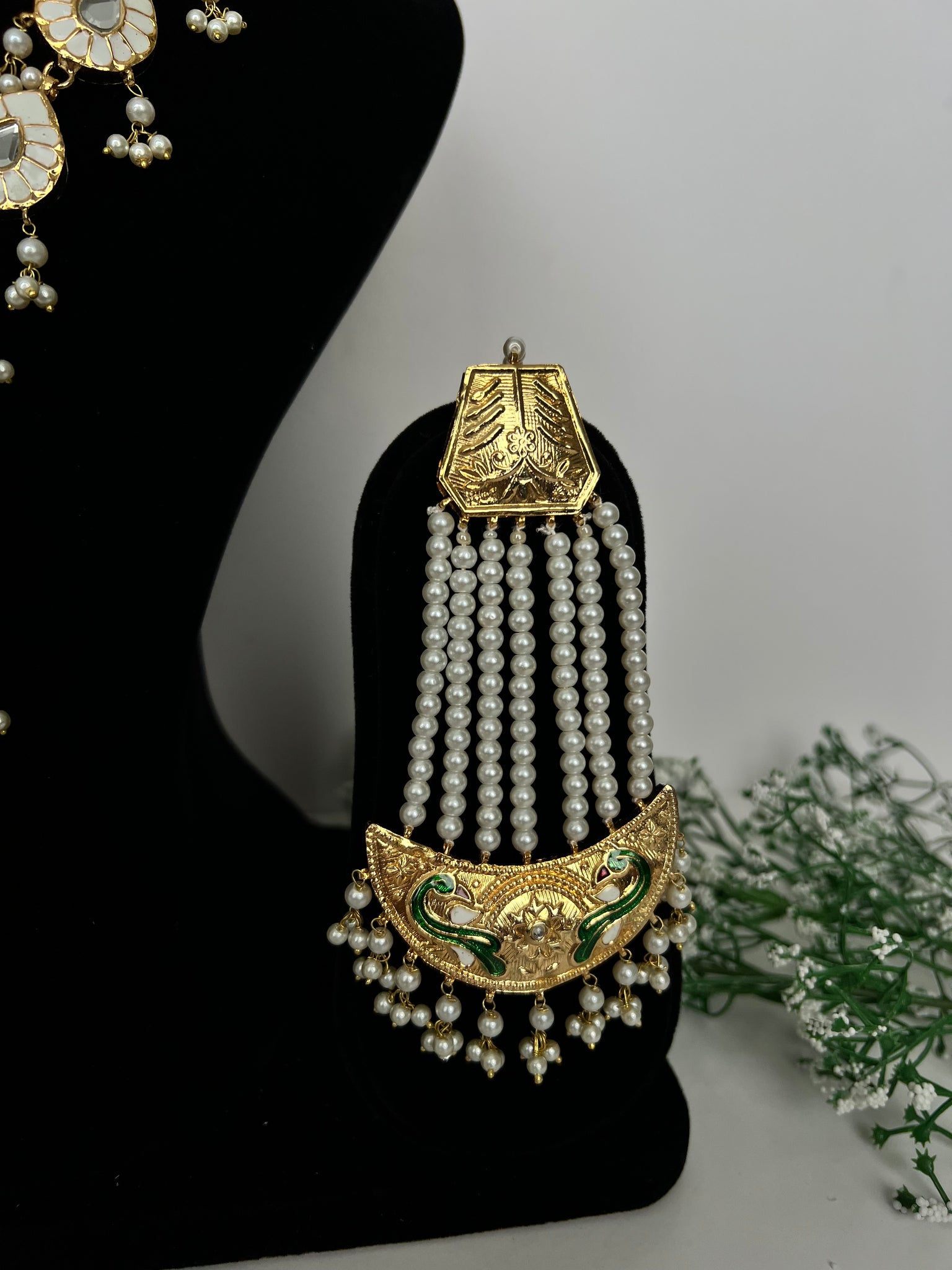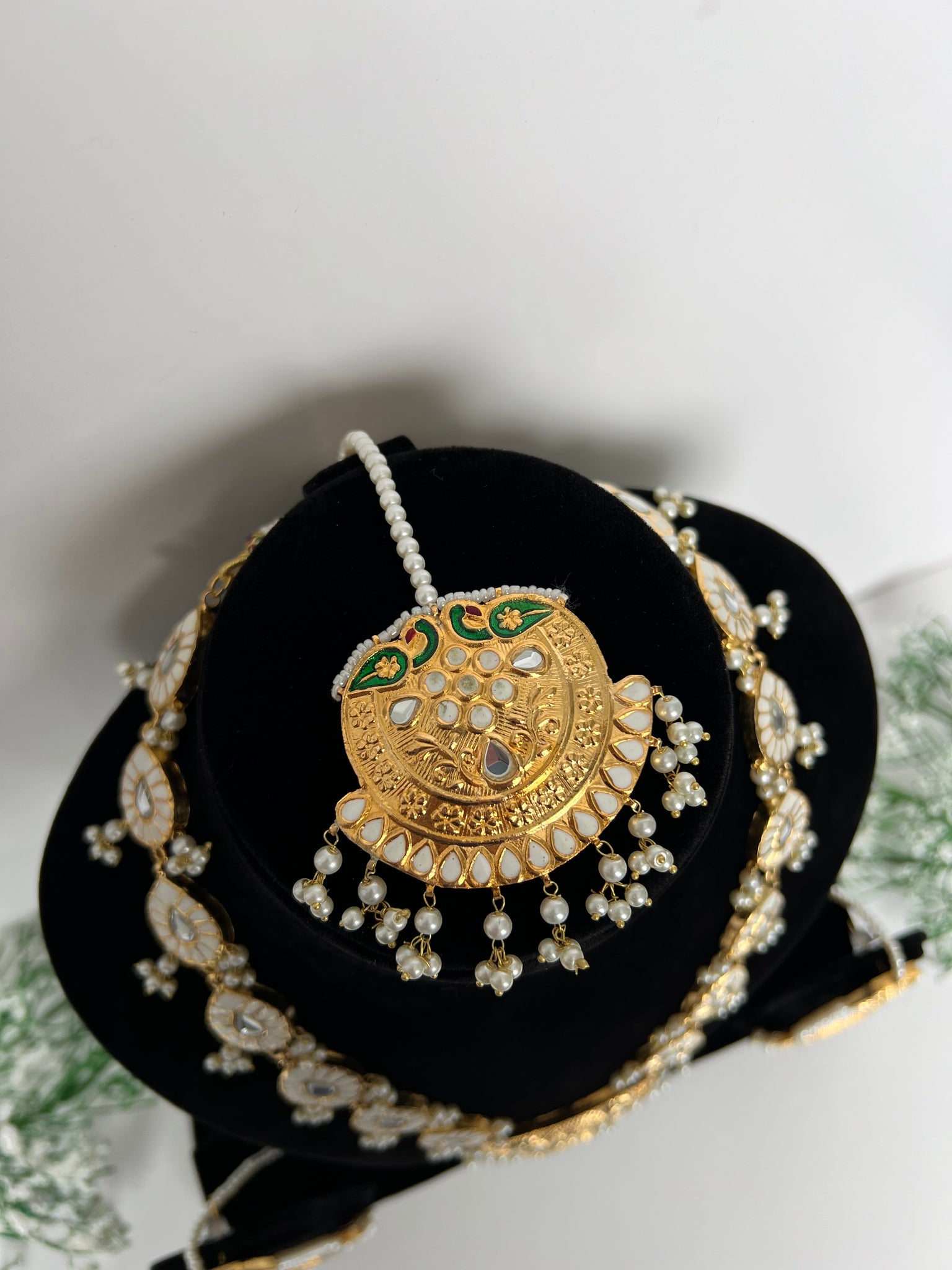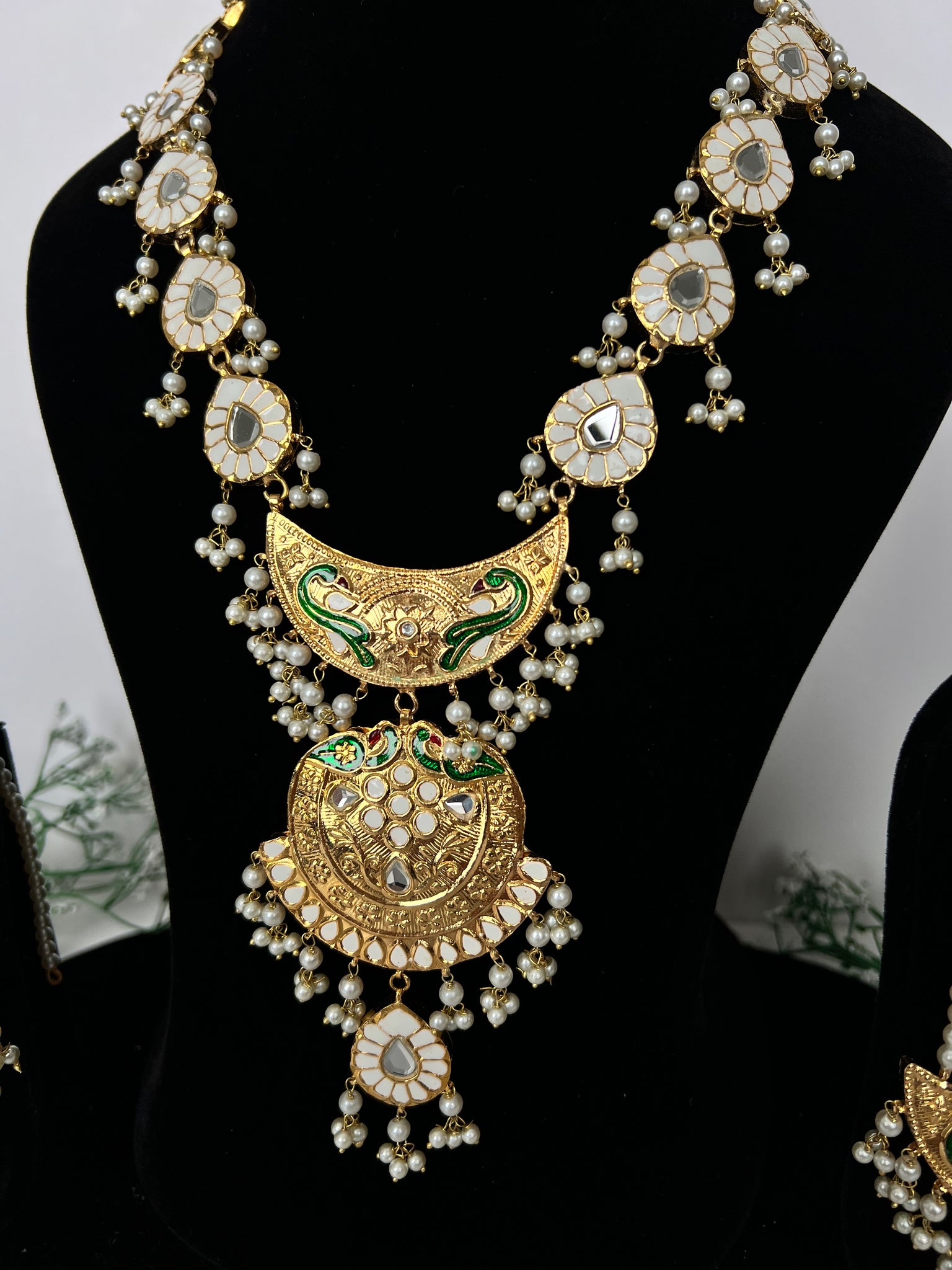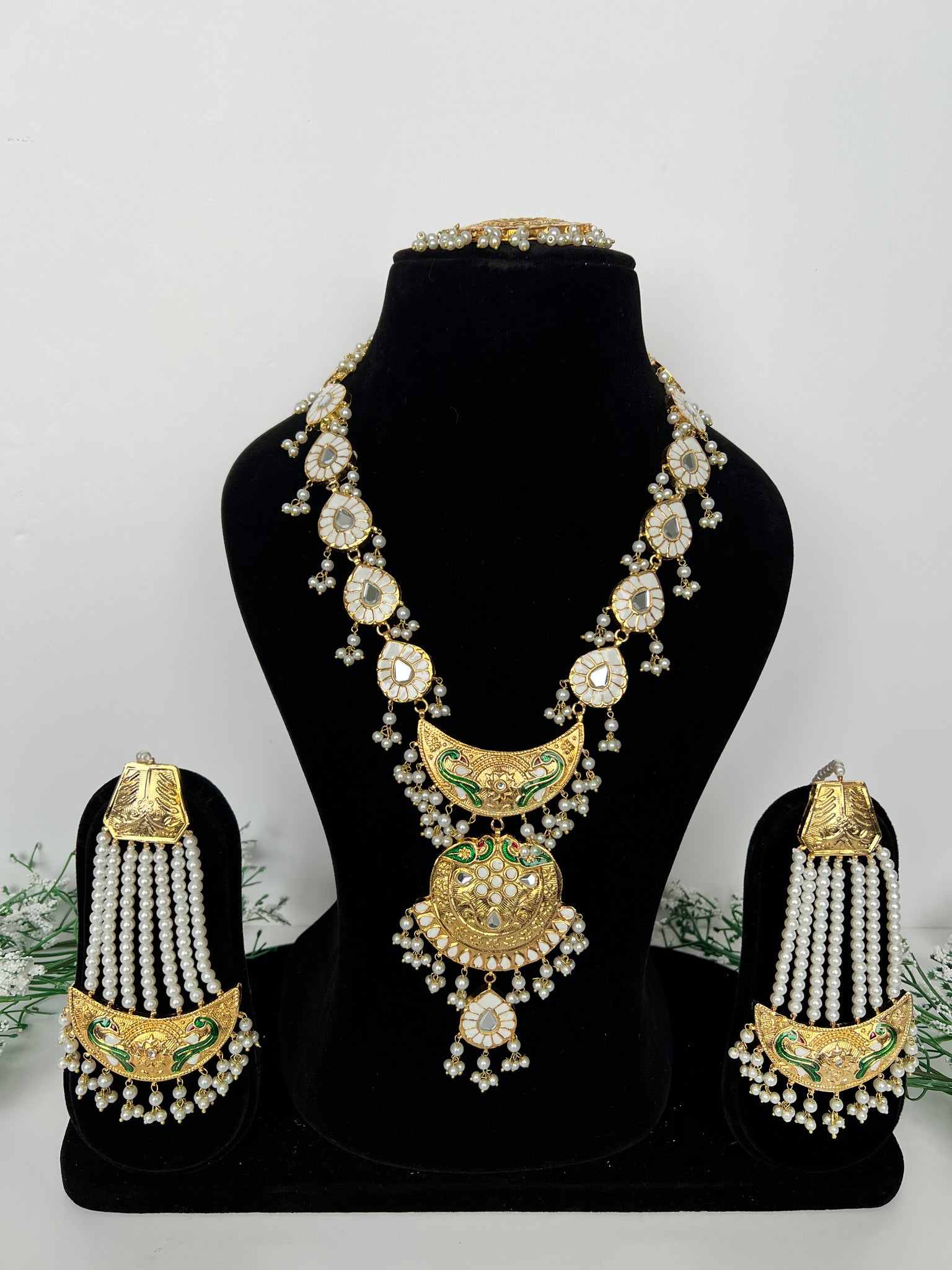 Stunning long Rani haar set in Meenakari thappa kundan hand painted work. 22K gold plated, with earrings and tikka