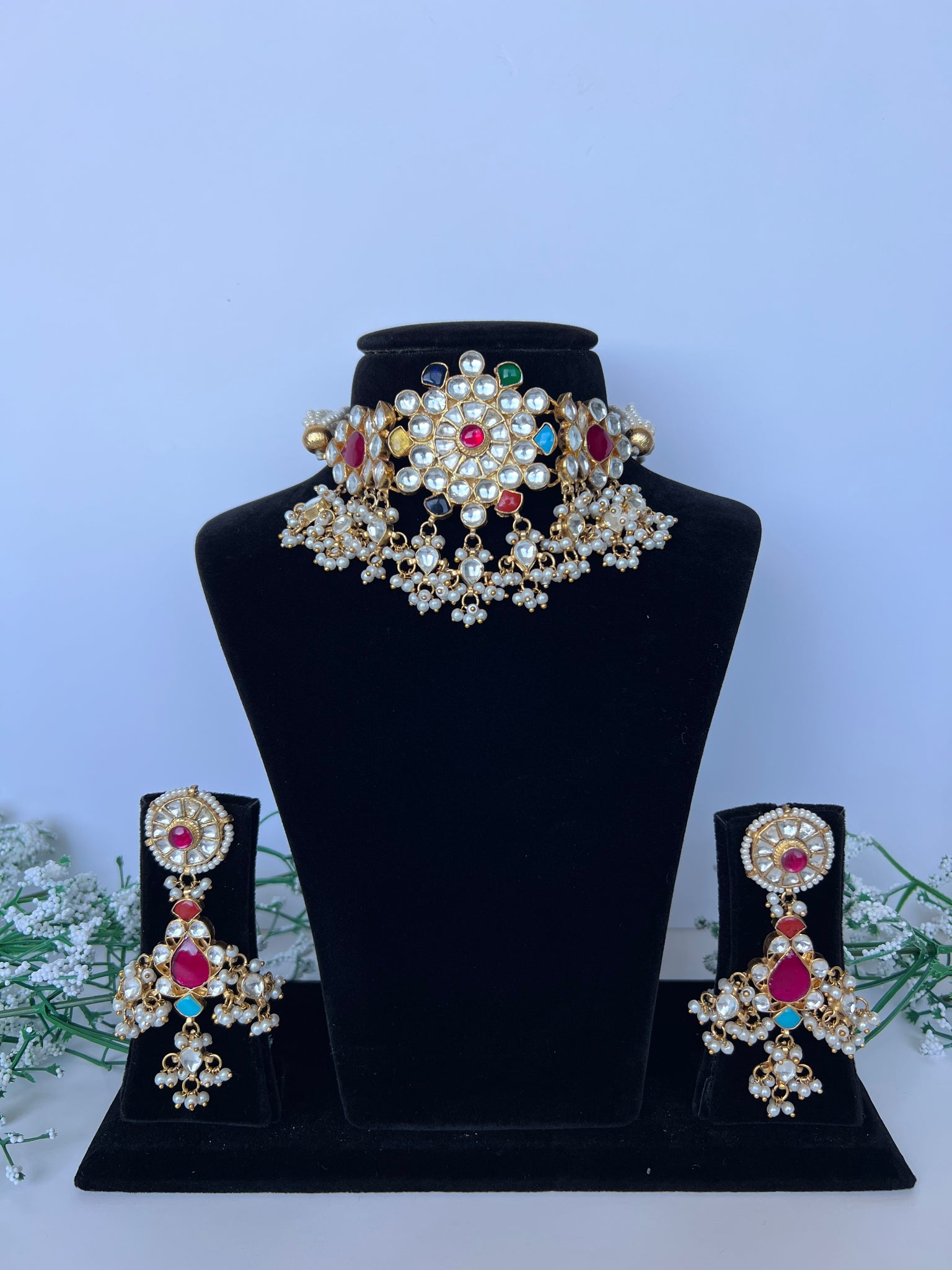 Multi Pachi kundan choker set with earrings, 22K gold plated kundan