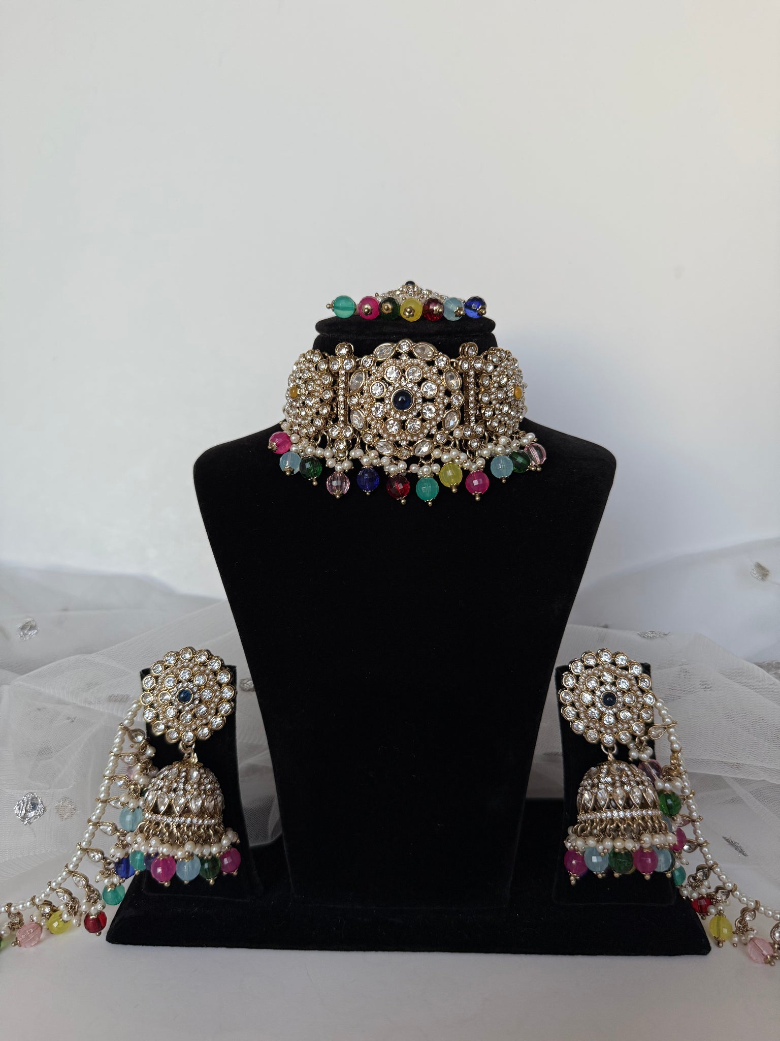 Gorgeous multi choker set with Bahubali jhumki earrings (sahare) comes with a tikka