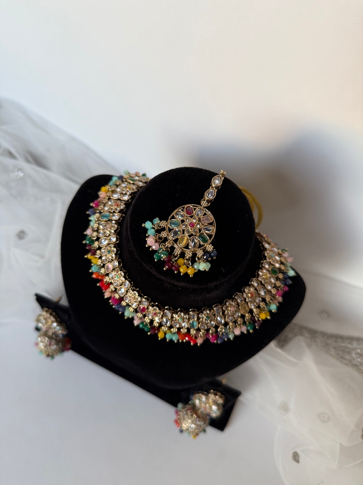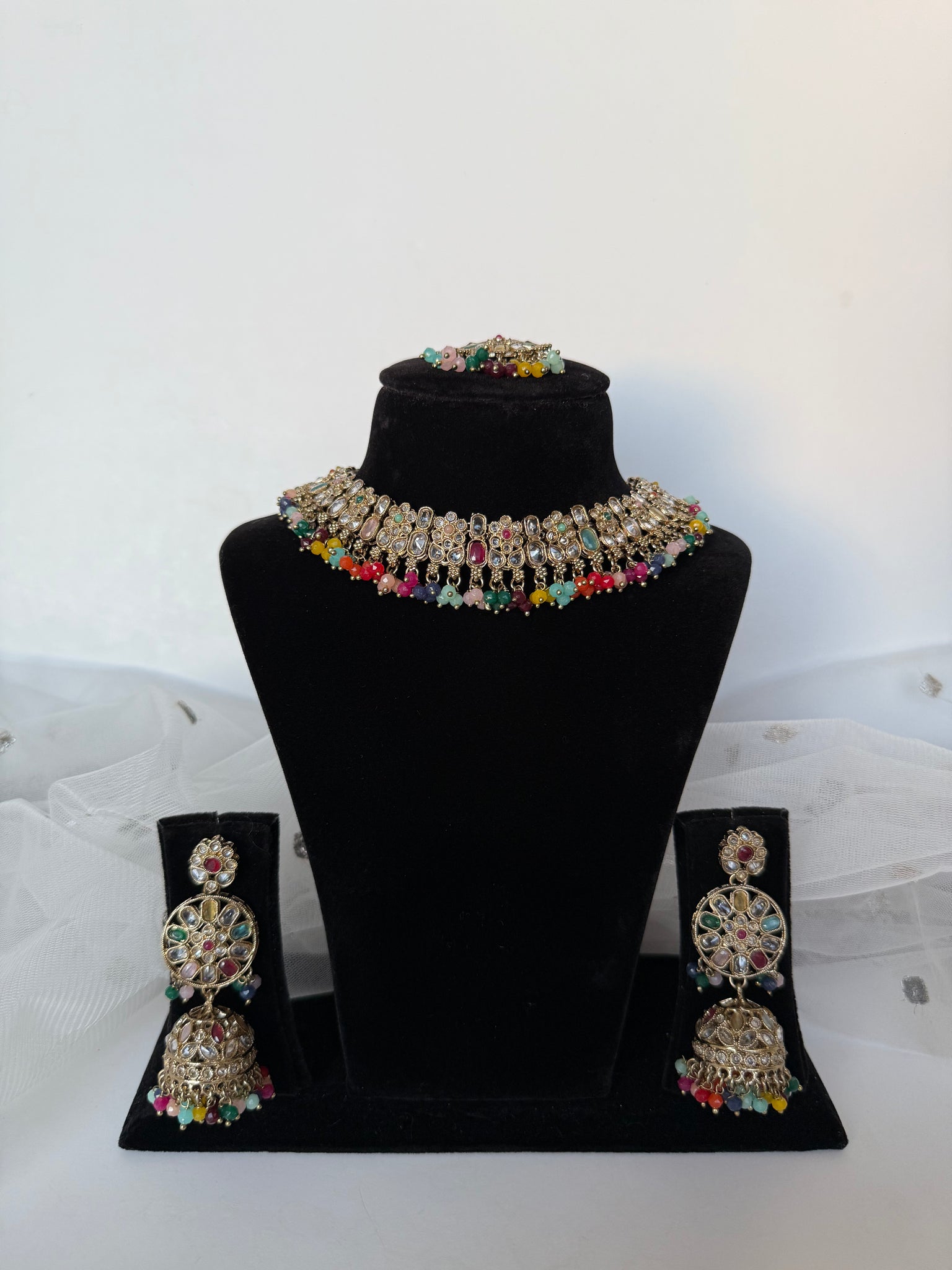 Gorgeous necklace set in multi colour with jhumki earrings and tikka