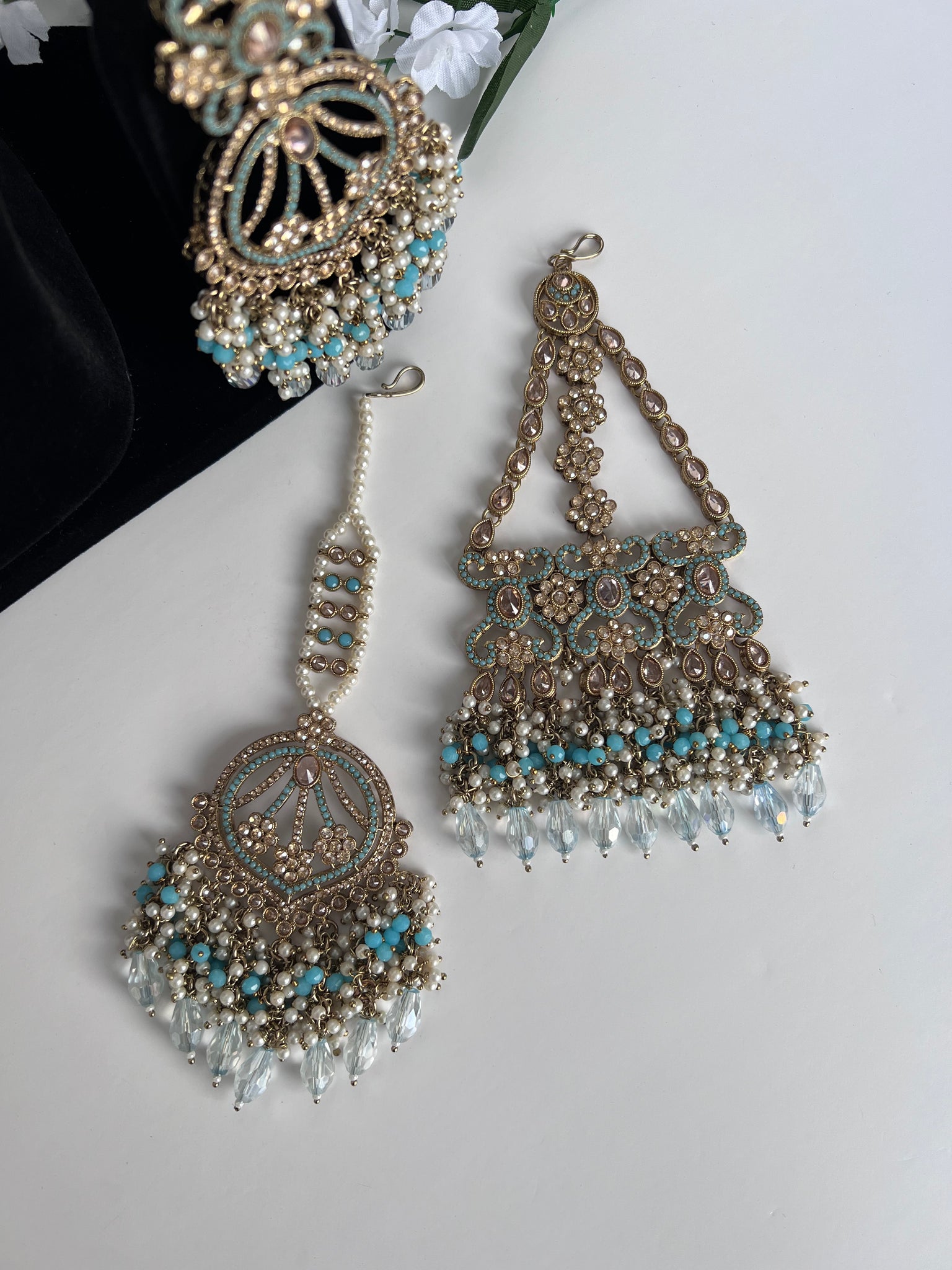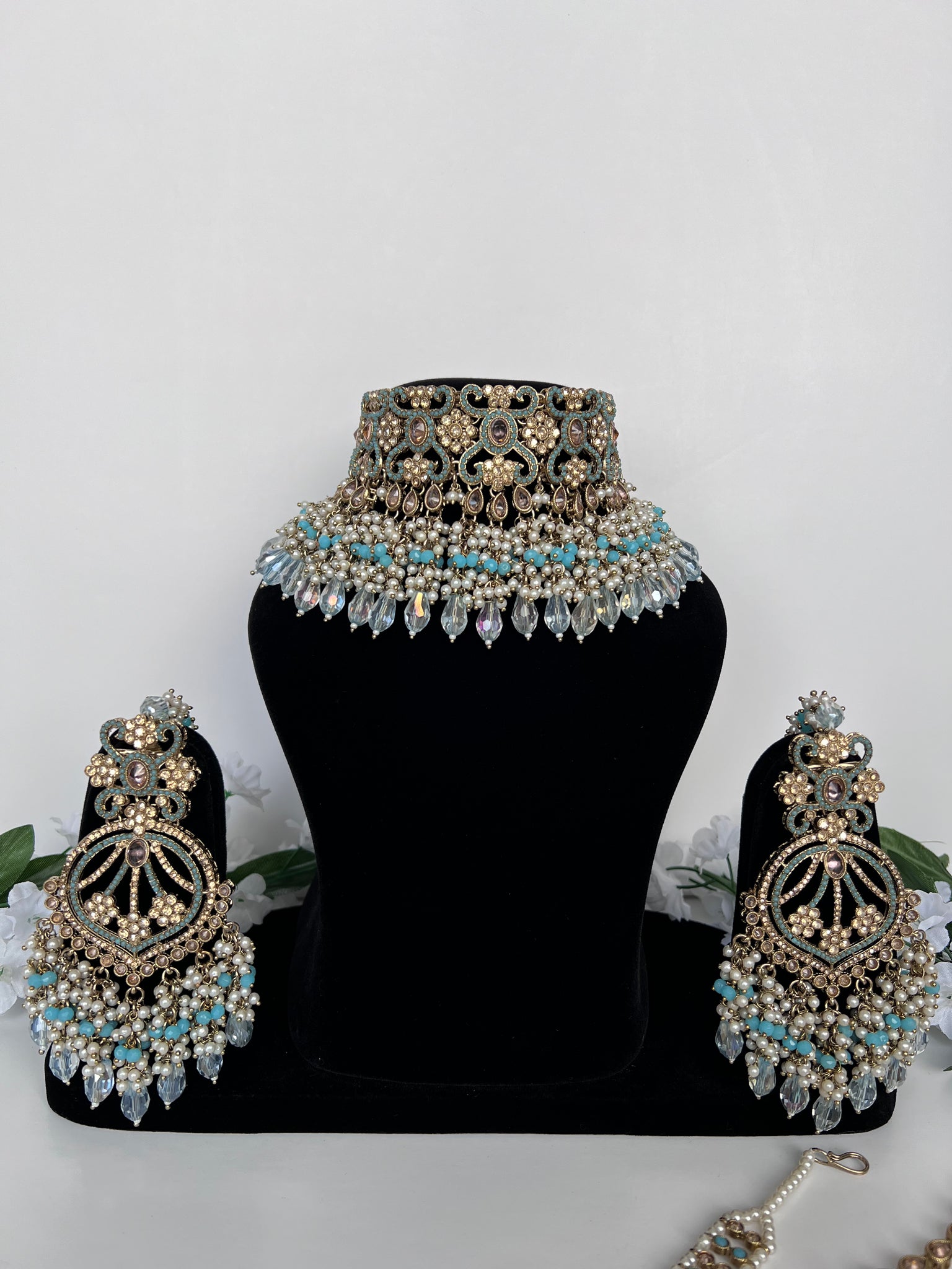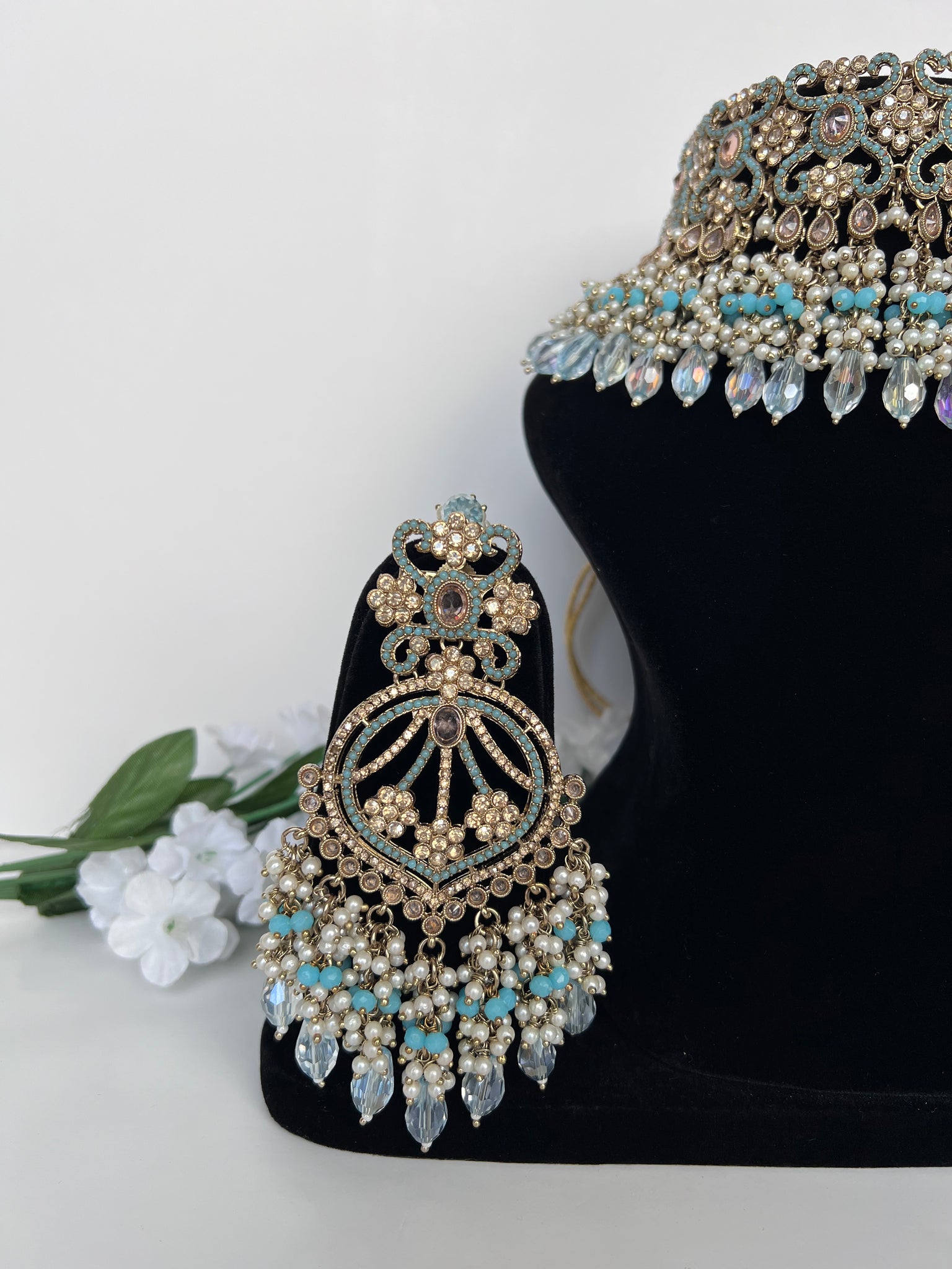 Stunning baby blue / ferozi Pakistani polki set with a beautiful choker, earrings with sahare, tikka and Jhoomer (passa). Has stunning unique crystal beading