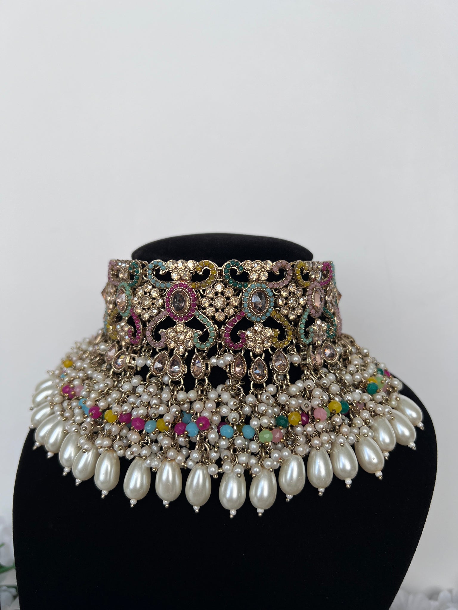 Stunning multi coloured Pakistani polki set with a beautiful choker, earrings with sahare, tikka and Jhoomer (passa)
