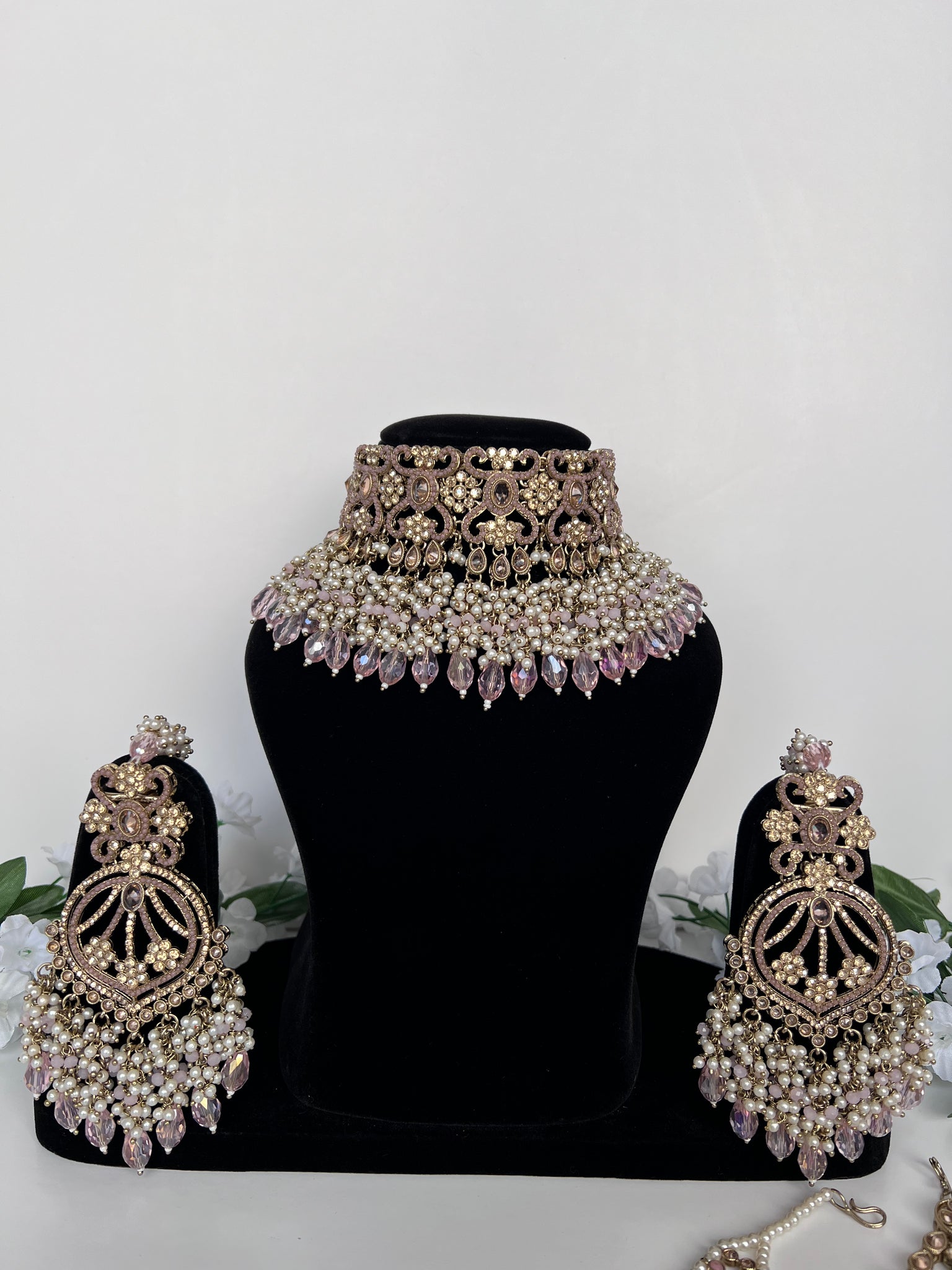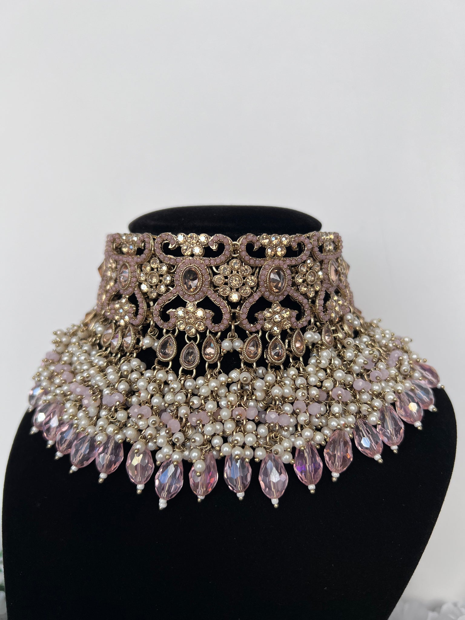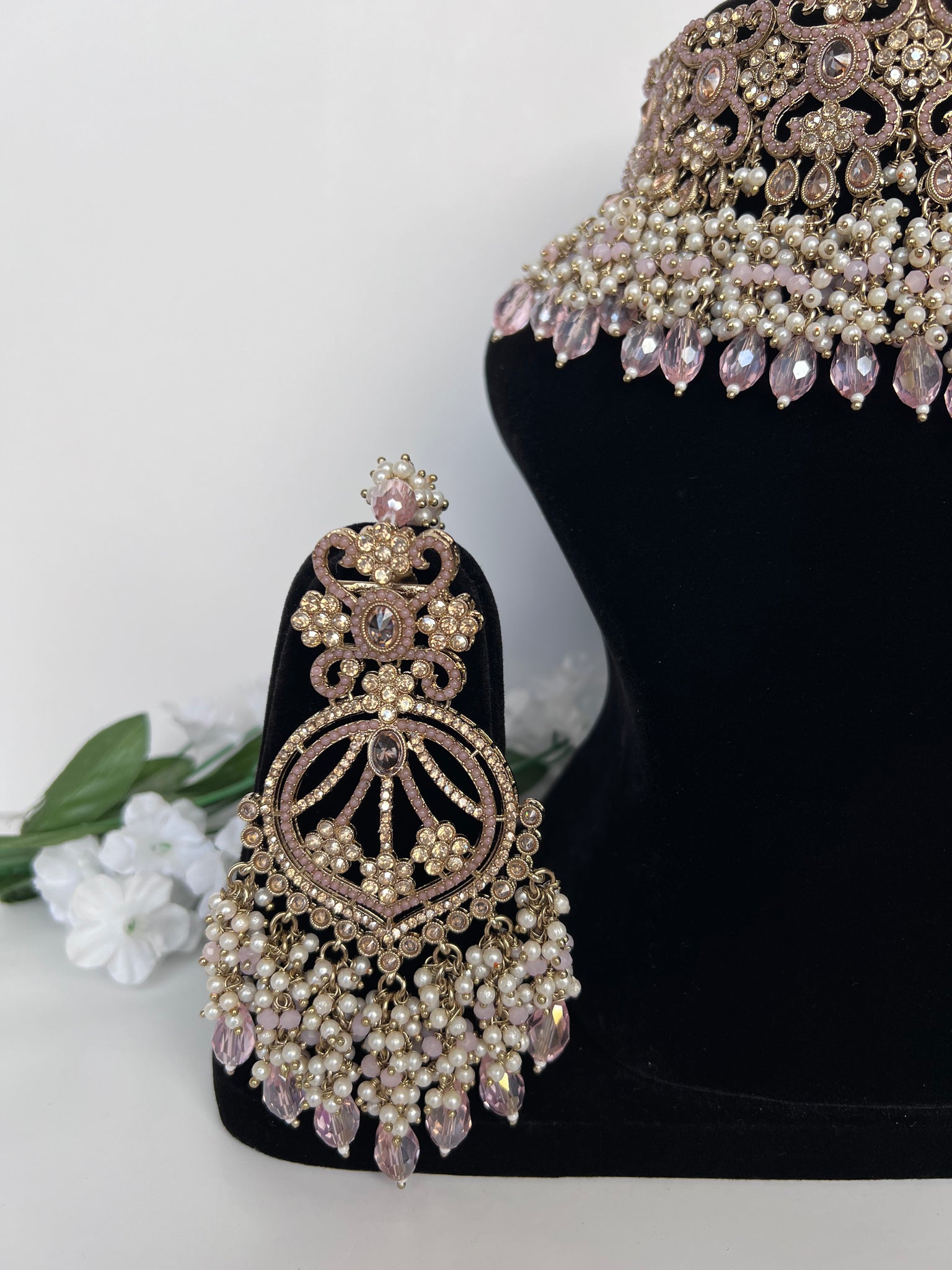 Stunning dusty baby pink Pakistani polki set with a beautiful choker, earrings with sahare, tikka and Jhoomer (passa). Has stunning unique crystal beading