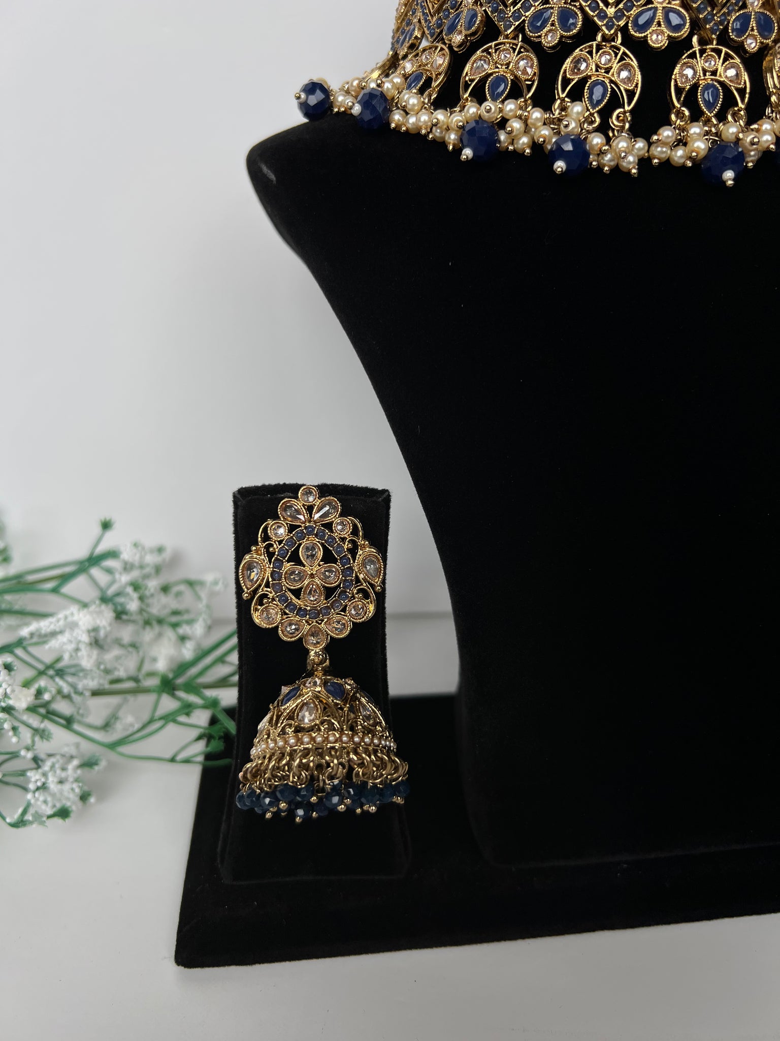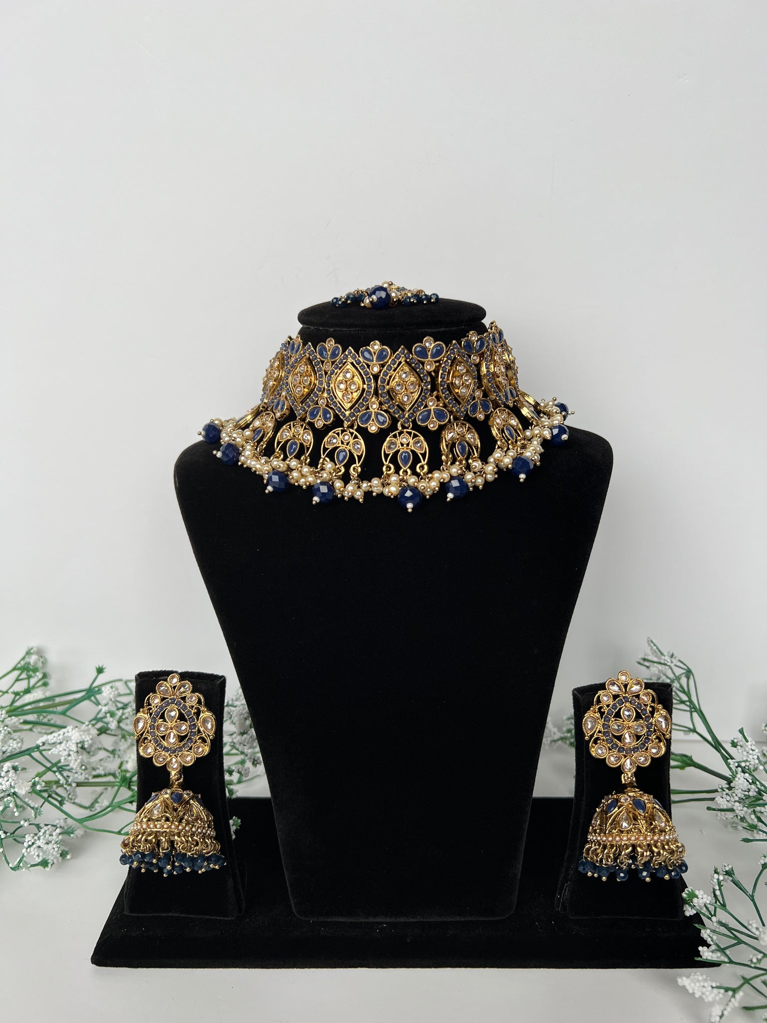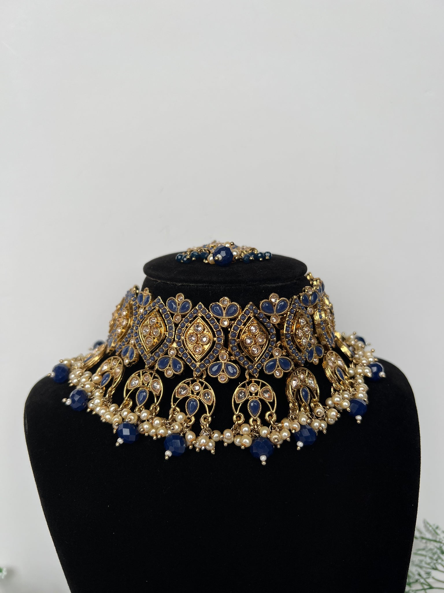A beautiful navy choker set with jhumki earrings and tikka