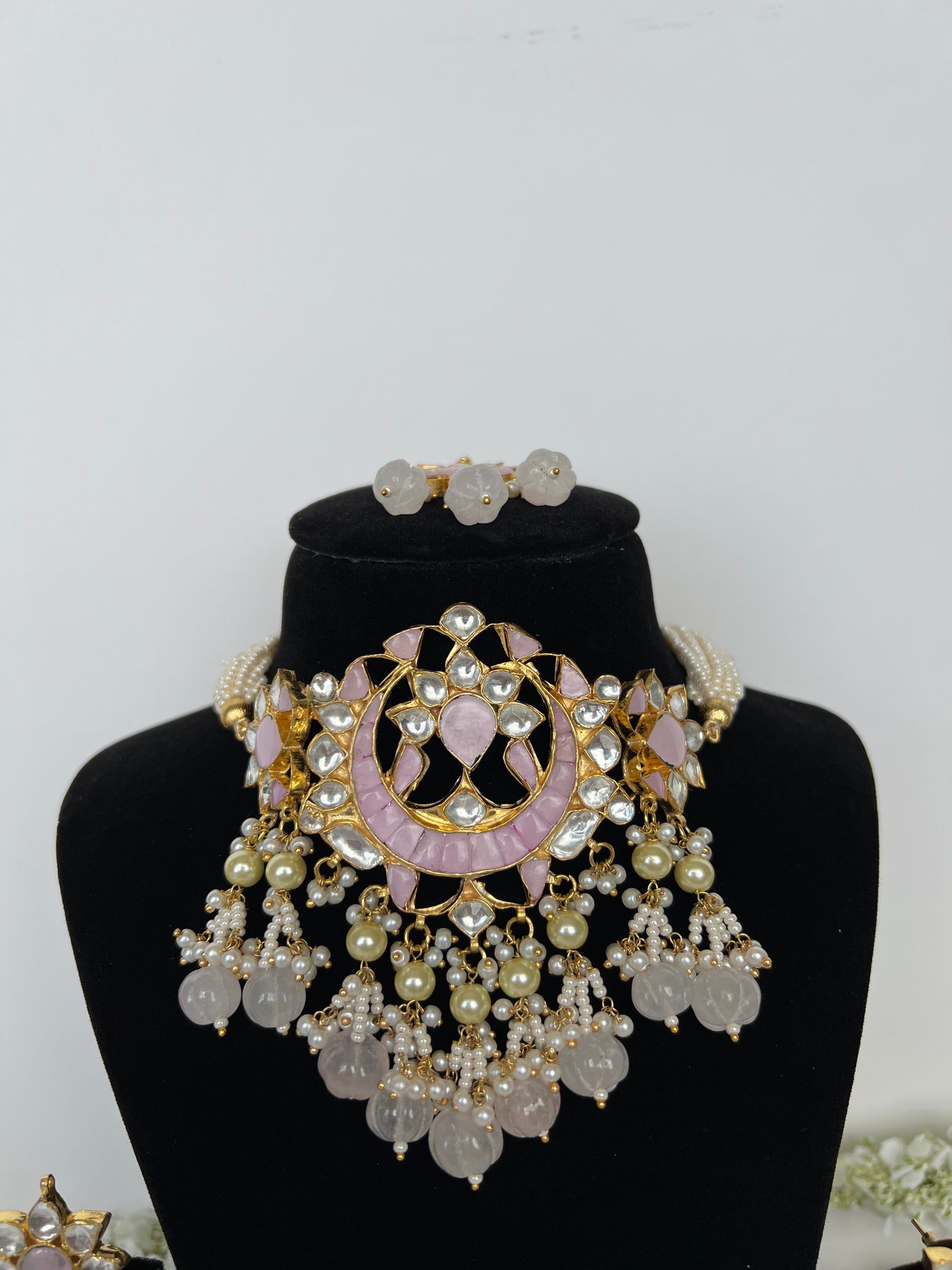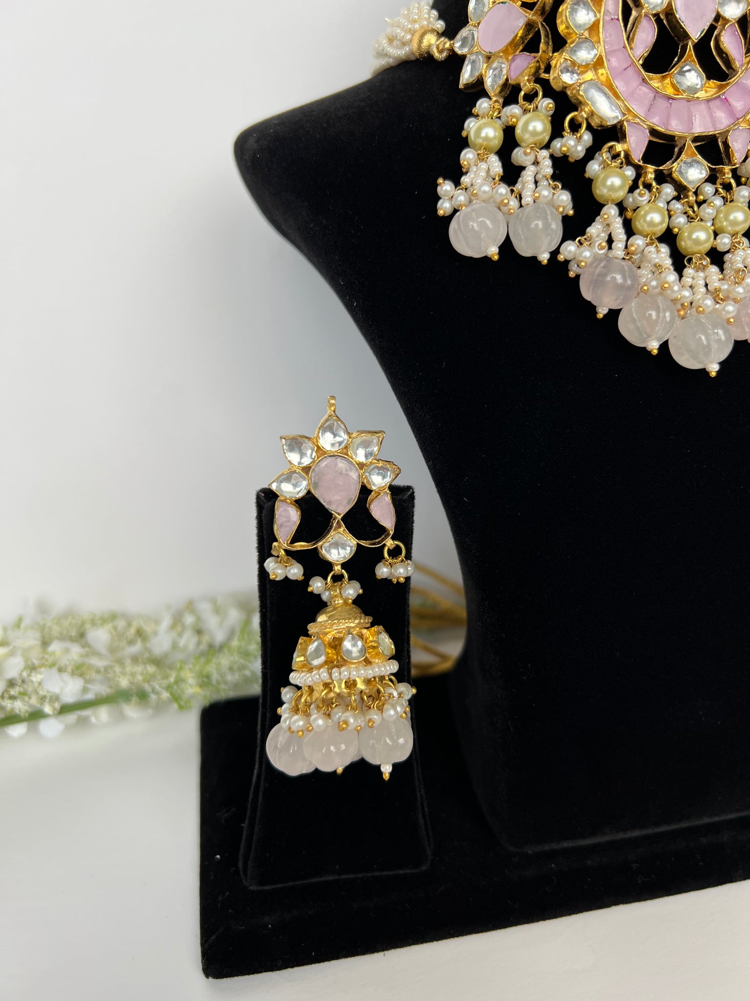 A stunning baby pink pachi kundan 24K gold plated set with stunning jhumkis and tikka