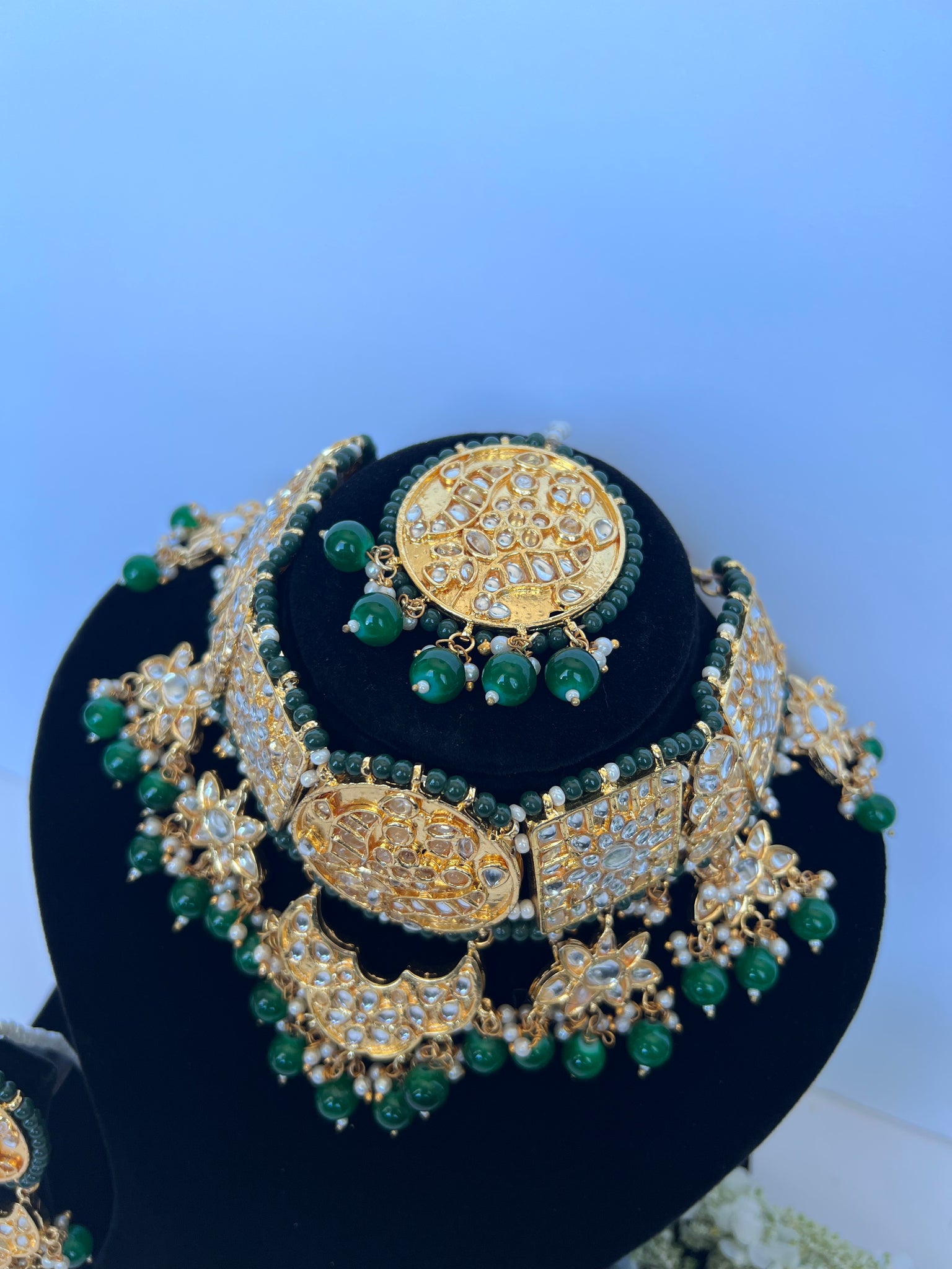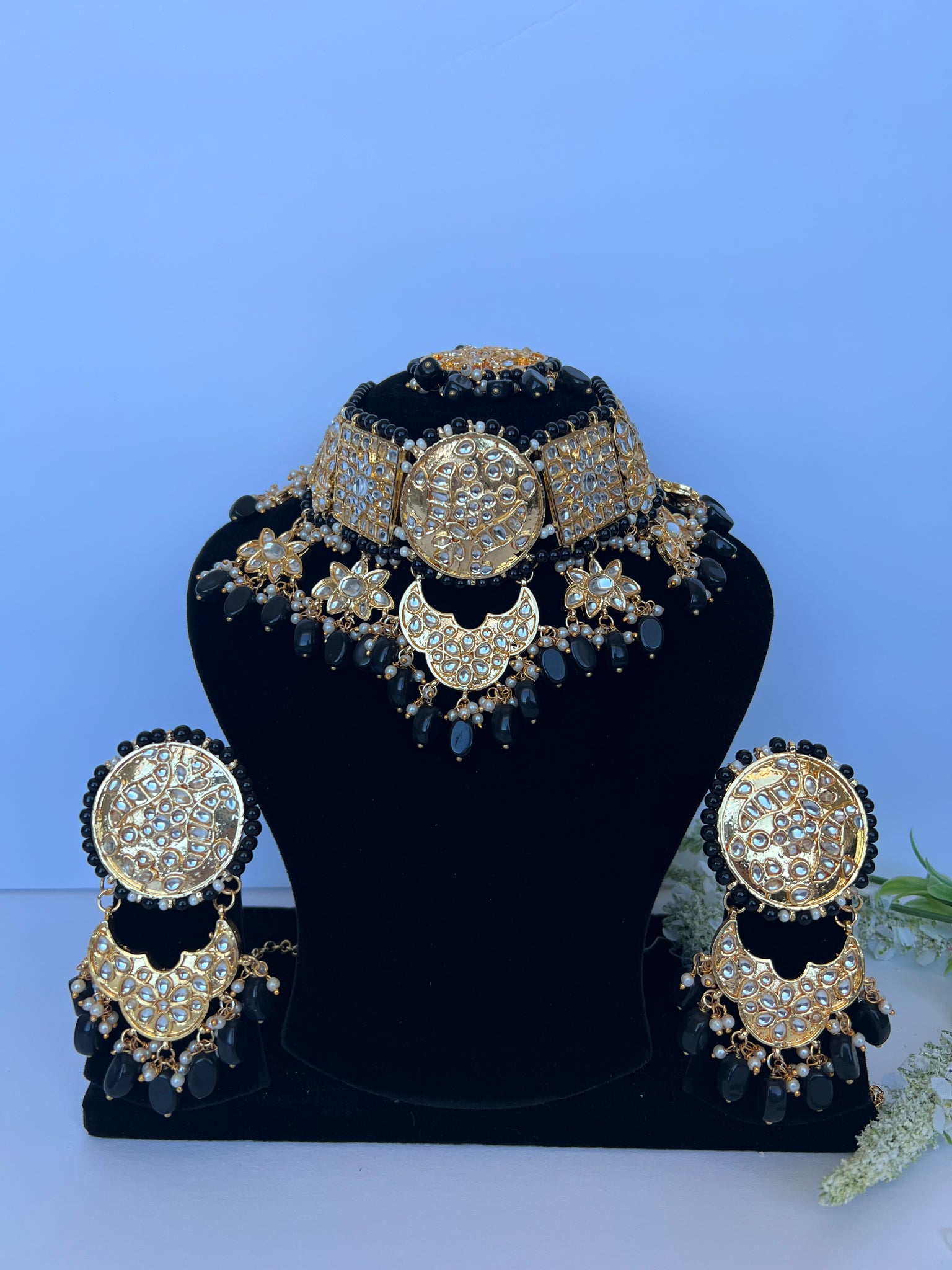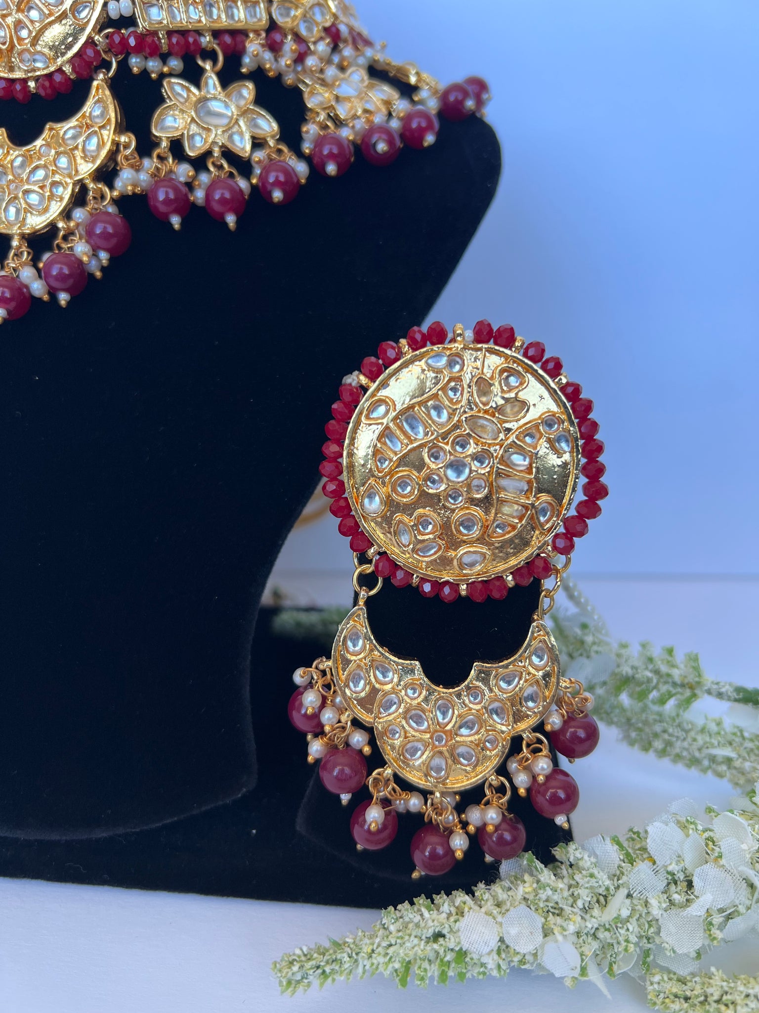 Stunning imitation Pakistani kundan set with statement earrings and tikka to match. Earrings come with detachable sahare