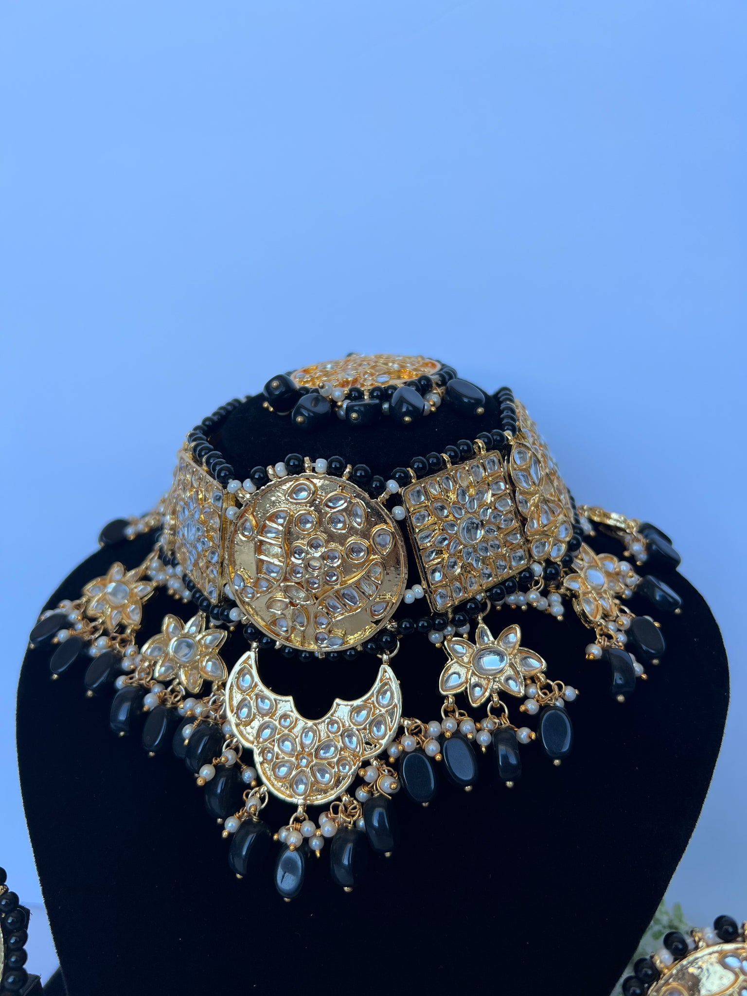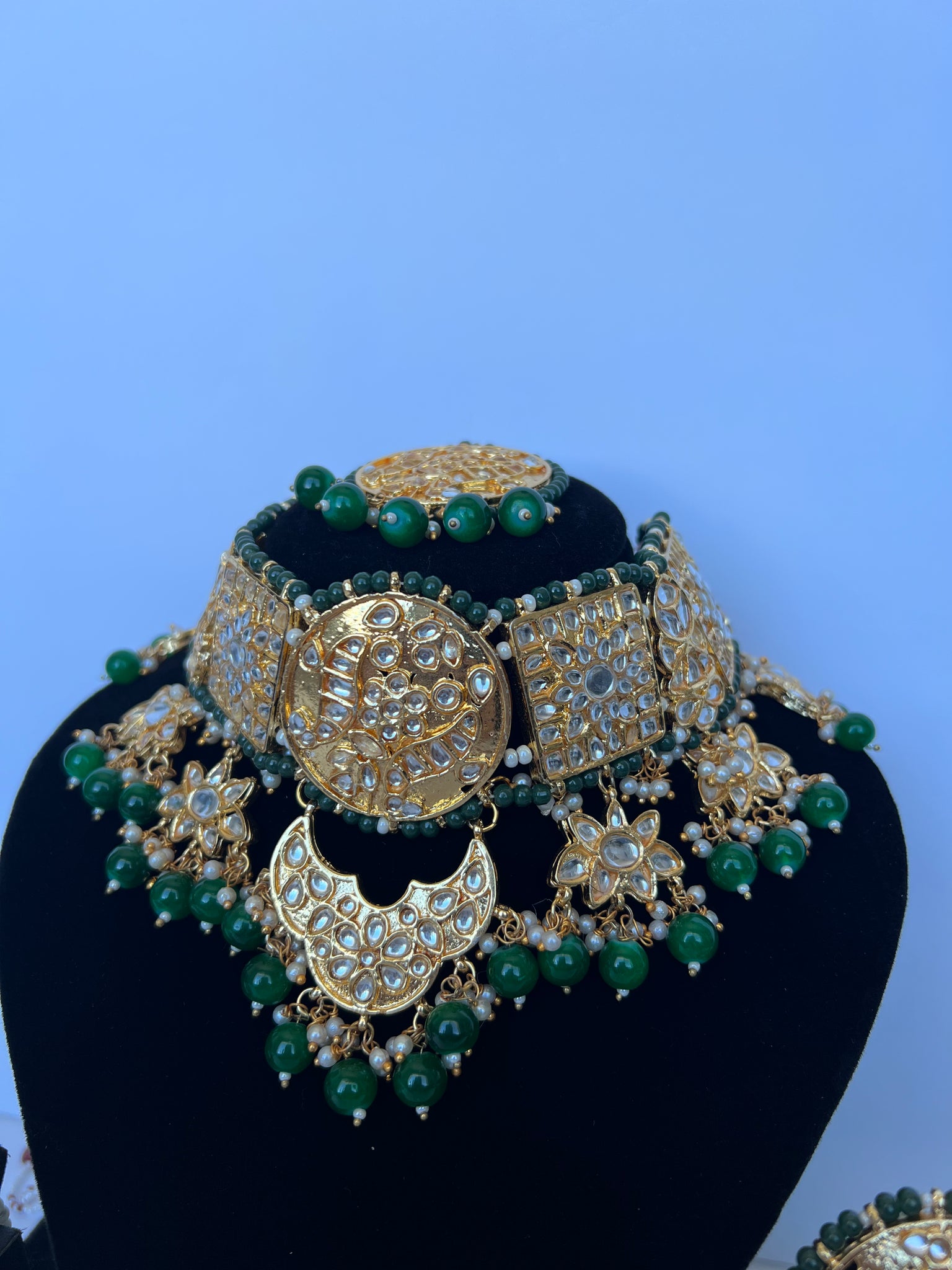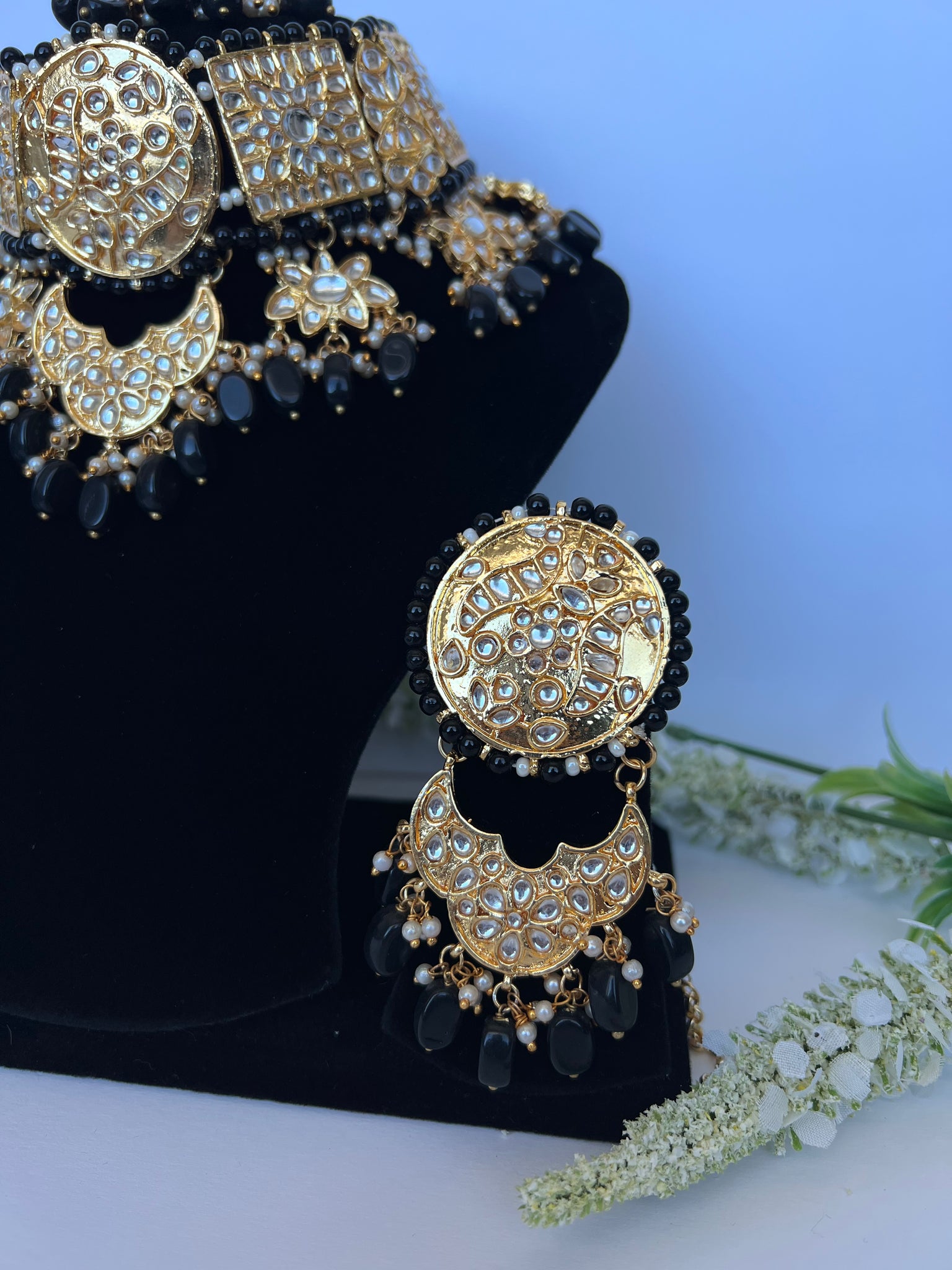 Stunning imitation Pakistani kundan set with statement earrings and tikka to match. Earrings come with detachable sahare